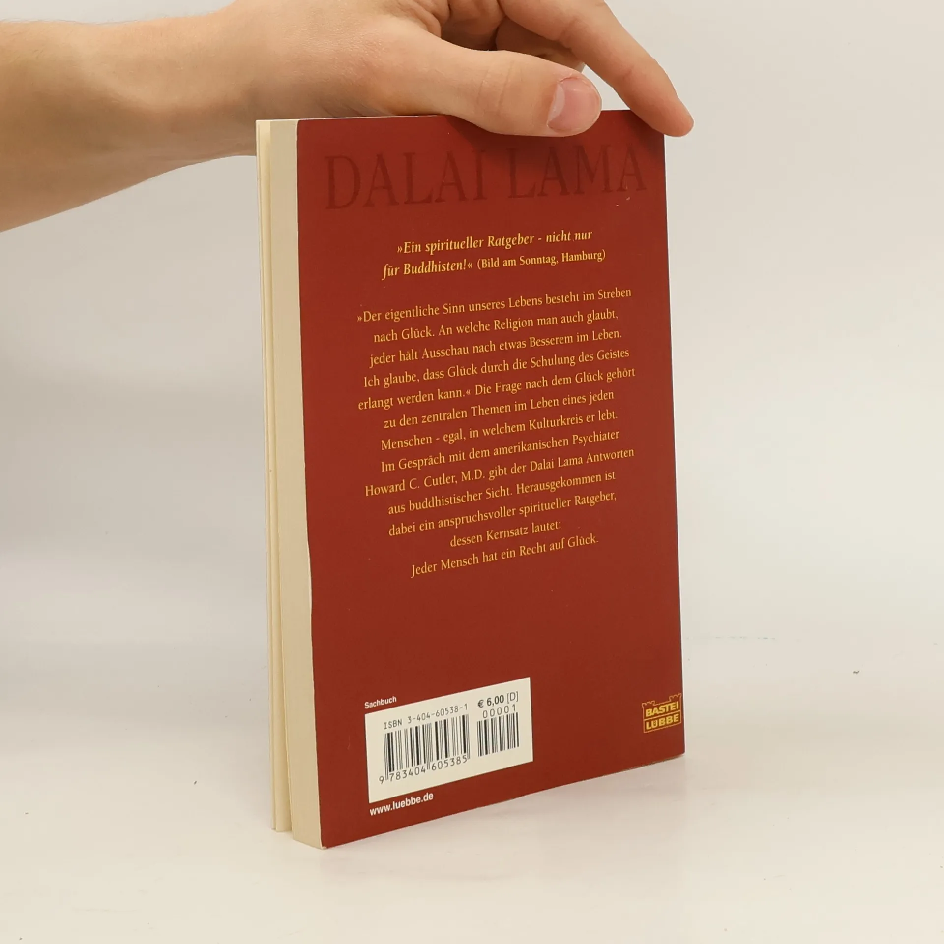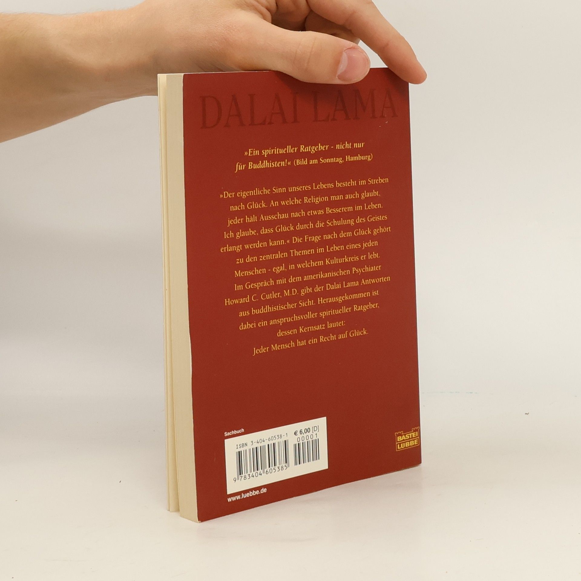 "Der eigentliche Sinn unseres Lebens besteht im Streben nach Glück. An welche Religion man auch glaubt, jeder hält Ausschau nach etwas Besserem im Leben. Ich glaube, dass Glück durch die Schulung des Geistes erlangt werden kann." Die Frage nach dem Glück gehört zu den zentralen Themen im Leben eines jeden Menschen - egal, in welchem Kulturkreis er lebt. Im "Gespräch" mit dem amerikanischen Psychiater Howard C. Cutler gibt der Dalai Lama Antworten aus buddhistischer Sicht. Herausgekommen ist dabei ein anspruchsvoller spiritueller Ratgeber, dessen Kernsatz lautet: Jeder Mensch hat ein Recht auf Glück. "Ein spiritueller Ratgeber - nicht nur fur Buddhisten!" Bild am Sonntag