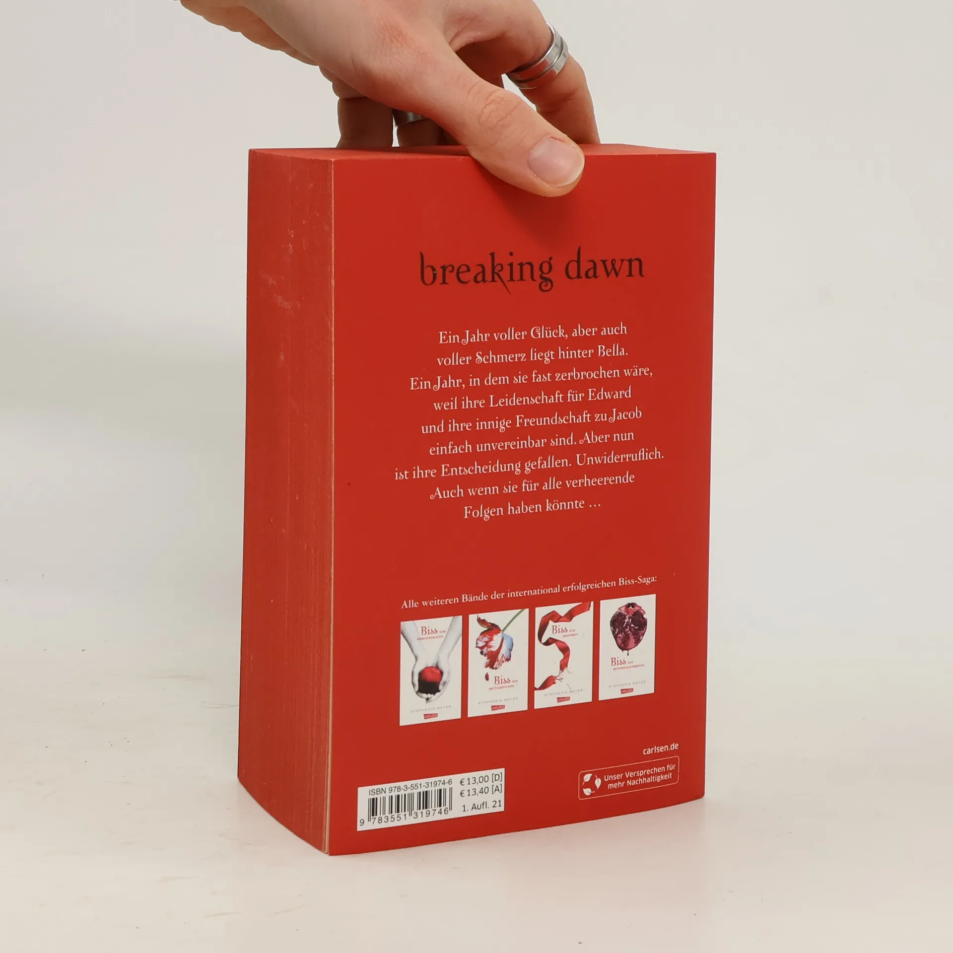 Wie wird die packende Liebesgeschichte zwischen Edward und Bella enden? - Teil 4 von Spiegel-Bestseller-Autorin Stephenie Meyer Ein Jahr voller Glück, aber auch voller Schmerz liegt hinter Bella. Ein Jahr, in dem sie fast zerbrochen wäre, weil ihre Leidenschaft für Edward und ihre innige Freundschaft zu Jacob einfach unvereinbar sind. Aber nun ist ihre Entscheidung gefallen. Unwiderruflich. Auch wenn sie für alle verheerende Folgen haben könnte ... Dies ist Band 4 der international erfolgreichen »Biss«-Saga. Alle Bände auf einen Blick: Biss zum Morgengrauen Biss zur Mittagsstunde Biss zum Abendrot Biss zum Ende der Nacht Biss zur Mitternachtssonne Biss zum ersten Sonnenstrahl – Das kurze zweite Leben der Bree Tanner Seit August 2020 gibt es auch Band 5 der weltweit geliebten Fantasy-Romance-Serie: »Biss zur Mitternachtssonne« und endlich erfahren wir die Geschichte aus Edwards Sicht!