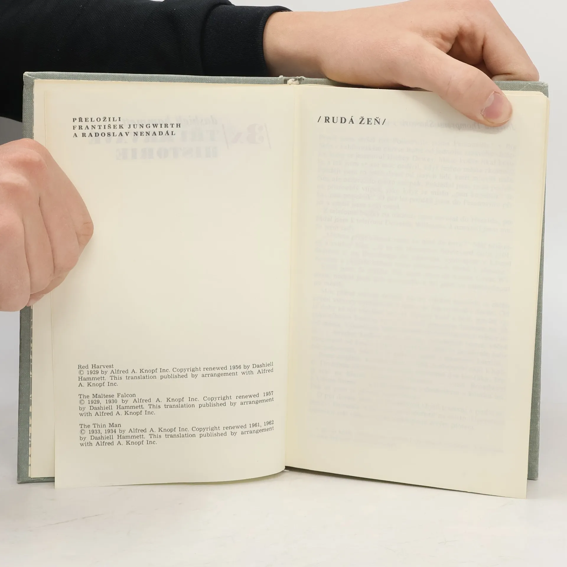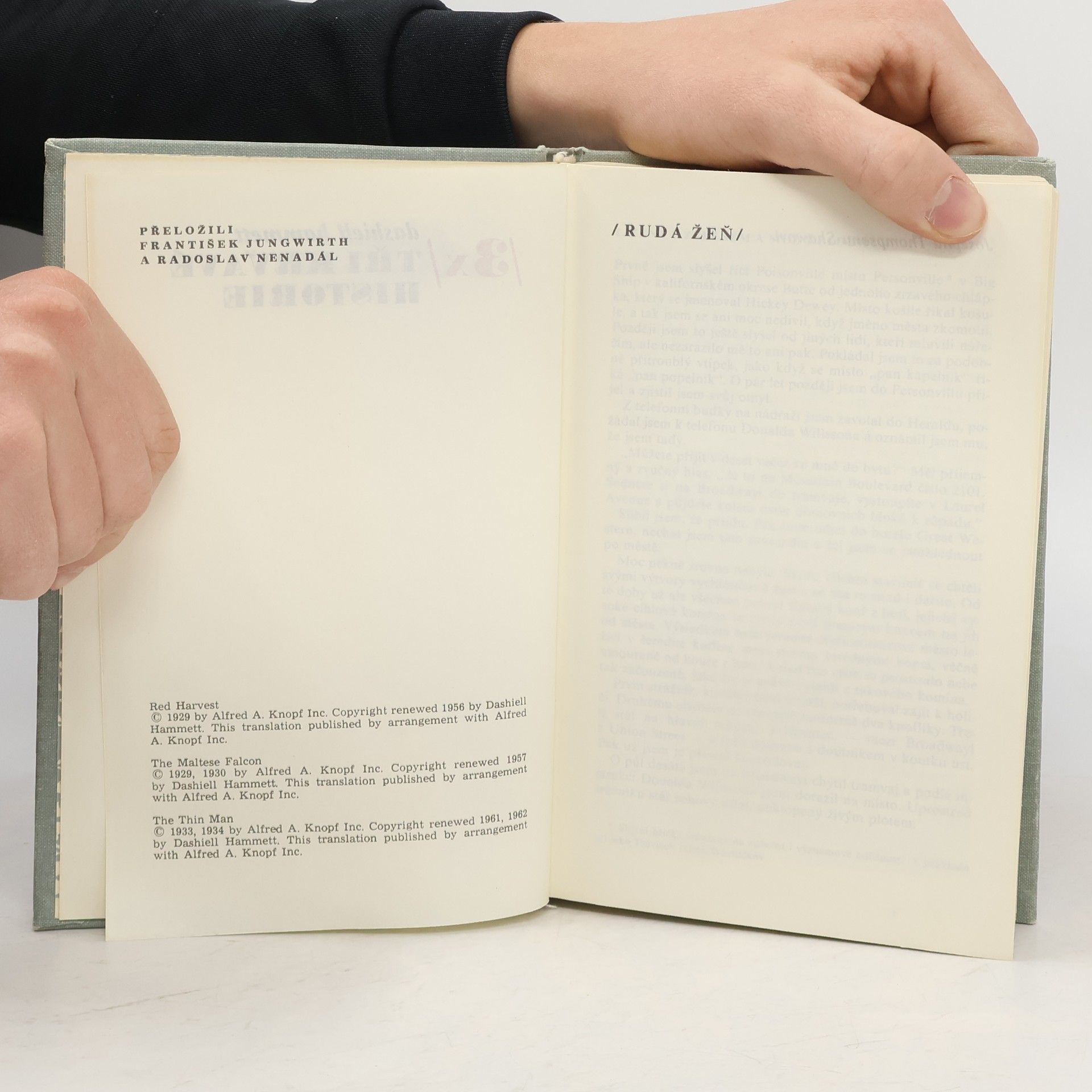 Kniha obsahuje tři případy : 1. Rudá žeň - přeložil František Jungwirth. 2. Maltézský sokol - přeložil Radoslav Nenadál. 3. Hubený muž - přeložil Radoslav Nenadál. Doslov „Záhada jménem Hammett“ napsal Michael Žantovský. Vydání druhé.