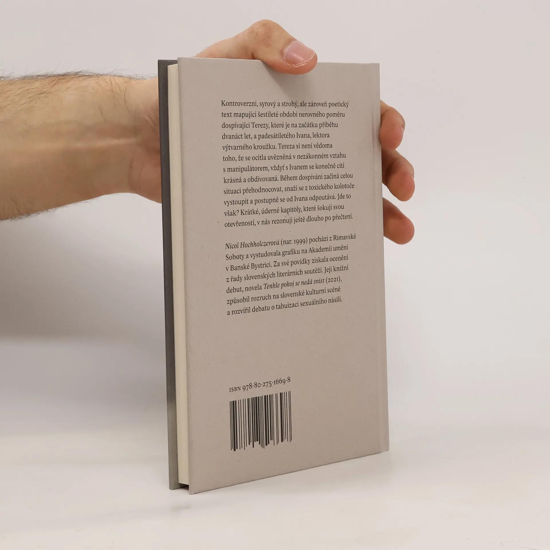 Kontroverzní, syrový a strohý, ale zároveň poetický text mapující šestileté období nerovného poměru dospívající Terezy, které je na začátku příběhu dvanáct let, a padesátiletého Ivana, lektora výtvarného kroužku. Tereza si není vědoma toho, že se ocitla uvězněná v nezákonném vztahu s manipulátorem, vždyť s Ivanem se konečně cítí krásná a obdivovaná. Během dospívání začíná celou situaci přehodnocovat, snaží se z toxického kolotoče vystoupit a postupně se od Ivana odpoutává. Jde to však? Krátké, úderné kapitoly, které šokují svou otevřeností, v nás rezonují ještě dlouho po přečtení.