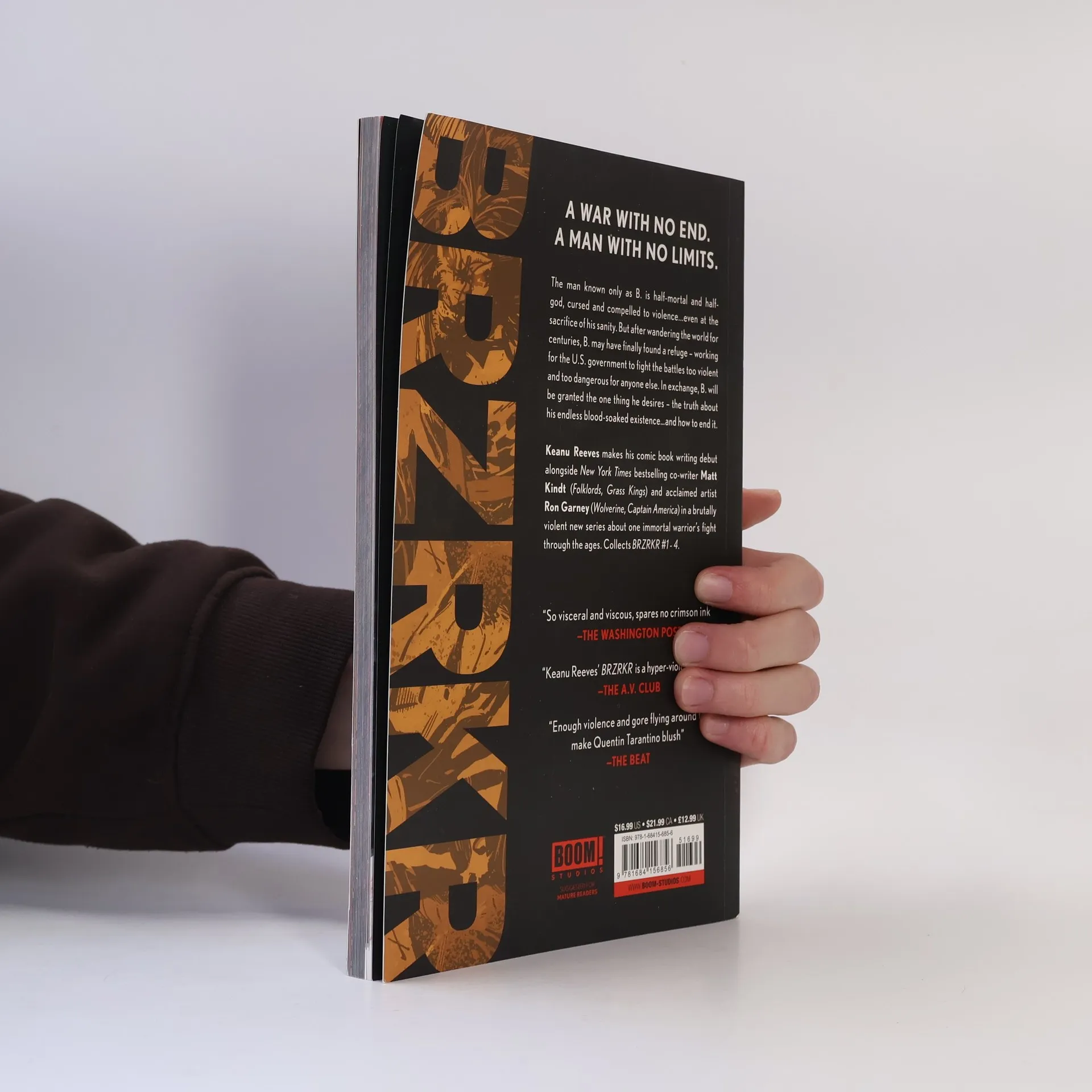 Keanu Reeves makes his comic book writing debut alongside New York Times bestselling co-writer Matt Kindt and legendary artist Ron Garney in a brutally violent new series about one immortal warrior’s fight through the ages. A WAR WITH NO END. A MAN WITH NO LIMITS. The man known only as Berzerker is half-mortal and half-God, cursed and compelled to violence...even at the sacrifice of his sanity. But after wandering the world for centuries, Berzerker may have finally found a refuge – working for the U.S. government to fight the battles too violent and too dangerous for anyone else. In exchange, Berzerker will be granted the one thing he desires – the truth about his endless blood-soaked existence…and how to end it. Keanu Reeves makes his comic book writing debut alongside New York Times bestselling co-writer Matt Kindt (Folklords, Grass Kings) and legendary artist Ron Garney (Captain America, The Amazing Spider-Man) in a brutally violent new series about one immortal warrior’s fight through the ages. Collects BRZRKR #1-4.
