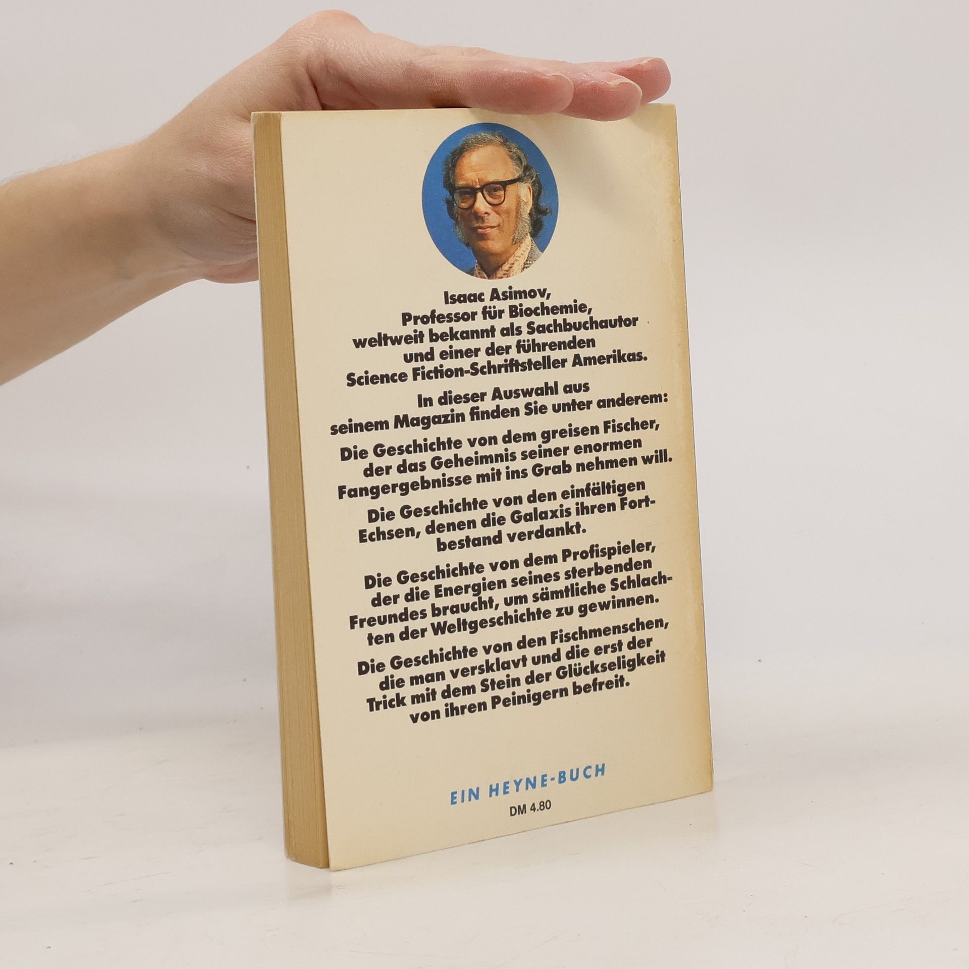 Die Geschichte von dem greisen Fischer, der das Geheimnis seiner enormen Fangergebnisse mit ins Grab nehmen will. Die Geschichte von den einfältigen Echsen, denen die Galaxis ihren Fortbestand verdankt. Die Geschichte von dem Profispieler, der die Energien seines sterbenden Freundes braucht, um sämtliche Schlachten der Weltgeschichte zu gewinnen. Die Geschichte von den Fischmenschen, die man versklavt und die erst der Trick mit dem Stein der Glückseligkeit von ihren Peinigern befreit.