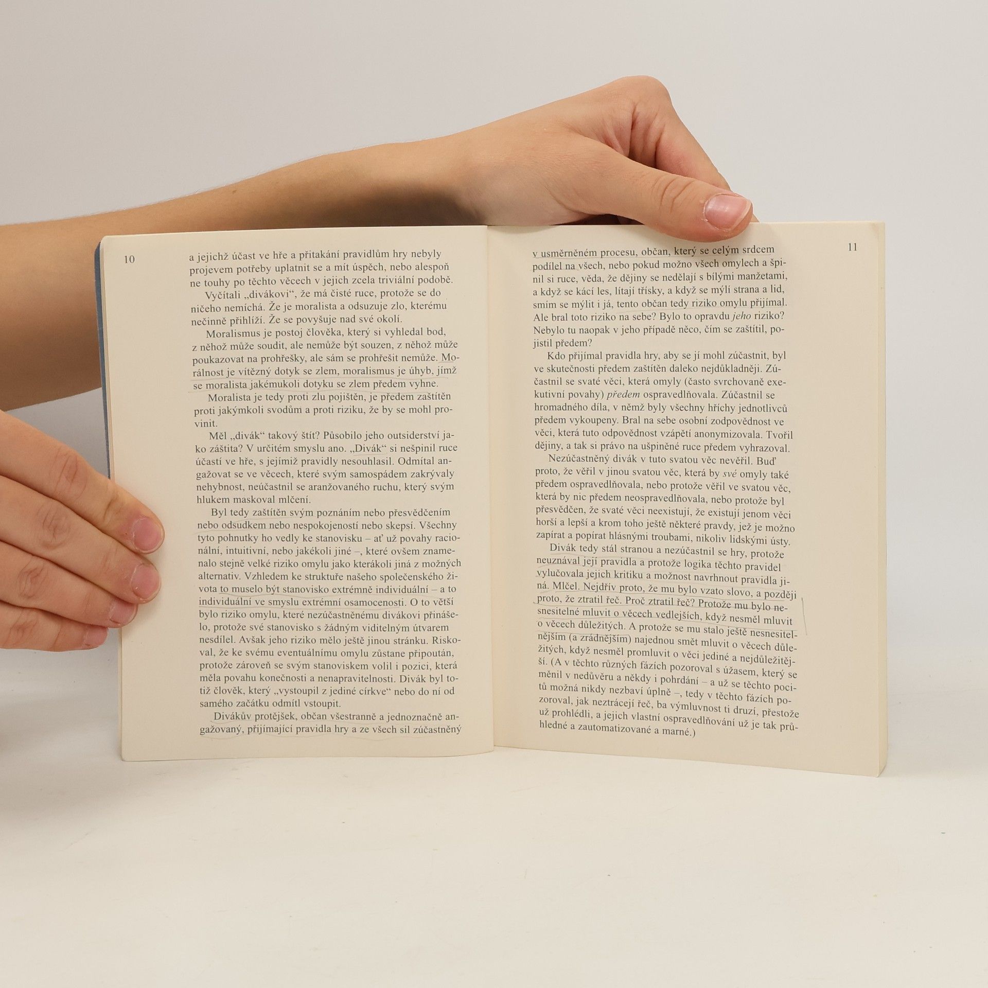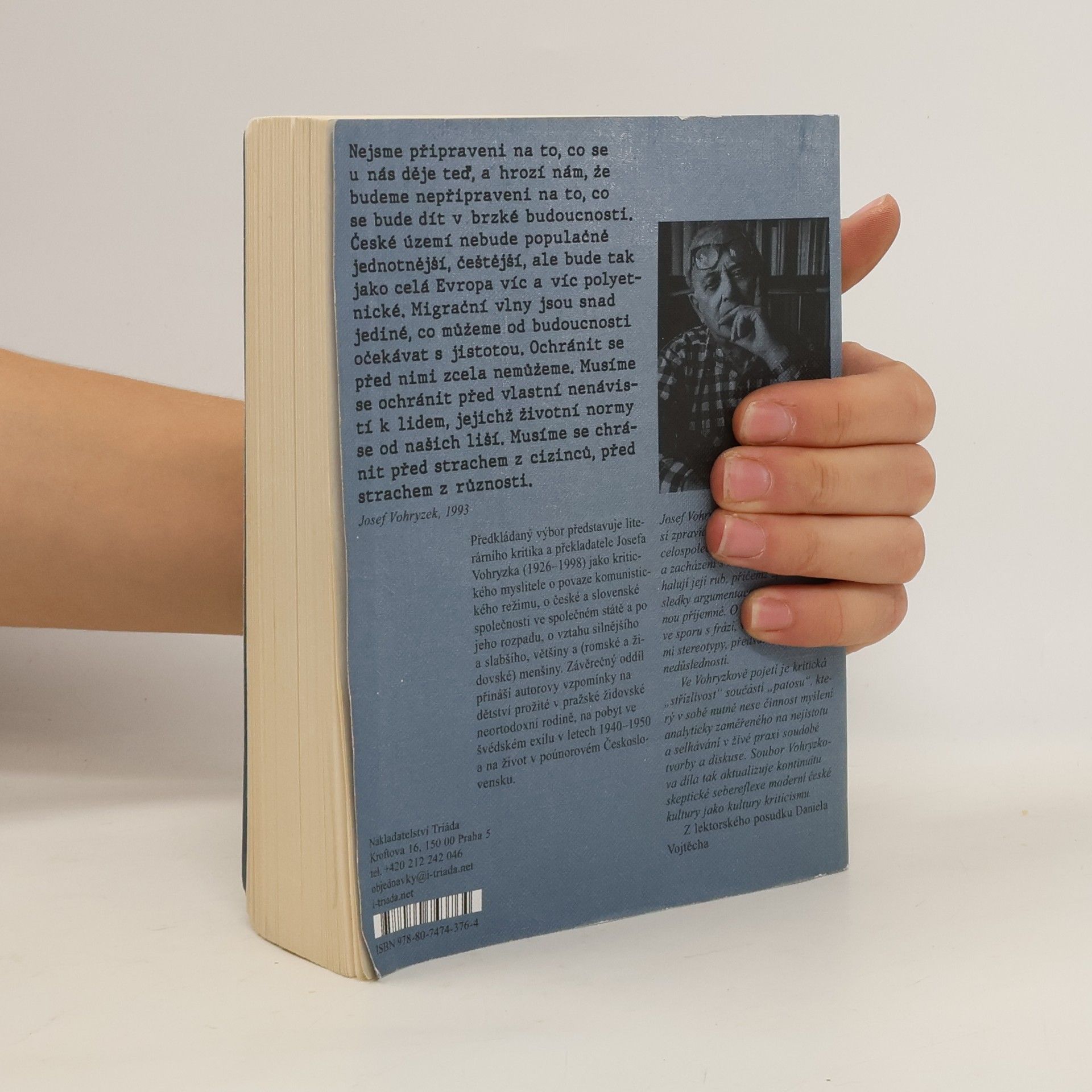 Předkládaný výbor představuje literárního kritika a překladatele Josefa Vohryzka (1926–1998) jako kritického myslitele o povaze komunistického režimu, o české a slovenské společnosti ve společném státě a po jeho rozpadu, o vztahu silnějšího a slabšího, většiny a (romské a židovské) menšiny. Kniha je členěna do čtyř oddílů. První tvoří texty o společnosti a politice před rokem 1989 a po sesunu komunistického režimu. Úvodní esej přibližuje životní pocit nestraníka během pražského jara 1968, úvahy psané během tzv. normalizace pro samizdatové sborníky nebo periodika se zabývají faktickými možnostmi Charty 77, mechanikou soudního šikanování a významem nezávislých občanských iniciativ, a stati z první poloviny devadesátých let pojednávají o vztazích k nově se formující moci, o rozpadu federativní republiky, étosu nově vzniklého českého státu a chováním tzv. intelektuálních elit při všech těchto momentech. Druhý díl sestává z textů o rasové nesnášenlivosti. Polemika z roku 1968 ukazujemožné sociálních důsledky tehdy chystané federalizace československého státu, kterým se pak věnuje jeden z prvních dokumentů Charty 77 (z roku 1978), v němž je podrobně rozpracováno postavení Romů v tehdejším Československu. Josef Vohryzek připravil pojednání anonymně, text zveřejněný v samizdatu a v exilových publikacích vyšel s podpisy tehdejších mluvčích Charty 77. Úvahy, které na chartovní dokument navazují, pocházejí už z let 1990–1997 a zabývají se vztahem „bílé“ většiny k menšinám a zdroji rasismu, resp. rozdíly ve změnách vzájemných postojů u většinové a menšinové populace. Třetí část přináší texty o knihách, v jejichž prvním plánu figuruje téma politického („třídního“), národnostního a rasového napětí, nesouladu nebo nenávisti. Jsou zde shromážděny Vohryzkovy reflexe nad díly publicistickými (V. Mrštík), memoárovými (M. Bubeníčková-Kuthanová, S. Wiesenthal, G. Konrád) nebo beletristickými (A. Giňa, V. Třešňák, J. Fränkl, Ch. Potok, I. Ferková, I. B. Singer). Závěrečný oddíl zaujímají Vohryzkovy vzpomínky. Vznikly v roce 1991 pro dokumentační potřeby Židovského muzea v Praze, tiskem vyly vydány posmrtně z autorovy literární pozůstalosti v květnu 2000 v časopise Revolver Revue. Autor v nich podrobně vzpomíná na své dětství odvíjející se v pražské židovské neortodoxní rodině (otec byl advokát), na pobyt ve švédském exilu v letech 1940–1950, kam ho rodiče ještě stačili vyslat, než byly hranice pro židovské občany bývalého Československa definitivně uzavřeny, stejně jako na složitou repatriaci v komunistickém Československu padesátých let 20. století, kam se Vohryzek vrátil, zatímco již věděl, že jeho rodina během války zahynula v nacistických vyhlazovacích táborech. Uspořádal, k vydání připravil, komentáře a medailon napsal Michael Špirit
