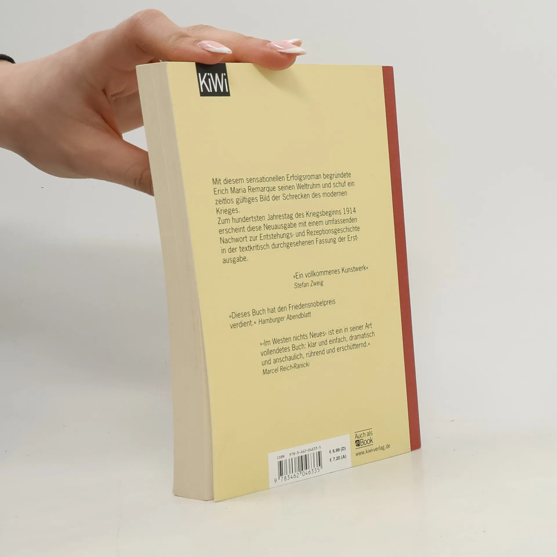 Der bedeutendste deutsche Roman zum Ersten Weltkrieg in einer Neuausgabe mit einem umfassenden Nachwort zur Entstehungs- und Rezeptionsgeschichte in der textkritisch durchgesehenen Fassung der Erstausgabe. Das Buch zum Oscar-prämierten Netflix-Film. Mit diesem Roman begründete Erich Maria Remarque seinen Weltruhm und schuf ein zeitlos gültiges Bild der Schrecken des modernen Krieges. Zum hundertsten Jahrestag des Kriegsbeginns 1914 erscheint eine besonders ausgestattete, mit einem Nachwort von Thomas F. Schneider, Leiter des Remarque-Friedenszentrums der Universität Osnabrück, zur Entstehungs- und Rezeptionsgeschichte versehene Sonderausgabe. Die Geschichte des neunzehnjährigen Paul Bäumer, der als ahnungsloser Kriegsfreiwilliger von der Schulbank an die Front kommt, ist inzwischen Allgemeingut. Auch bei der erneuten Lektüre ist der Eindruck jedoch wieder erschütternd: Wie Bäumer statt der erhofften Kriegsbegeisterung und eines kurzen Abenteuers die ganze Brutalität des Gemetzels und das sinnlose Sterben seiner Kameraden erlebt, ist anrührend und empörend. »Ein vollkommenes Kunstwerk und unzweifelhafte Wahrheit« Stefan Zweig