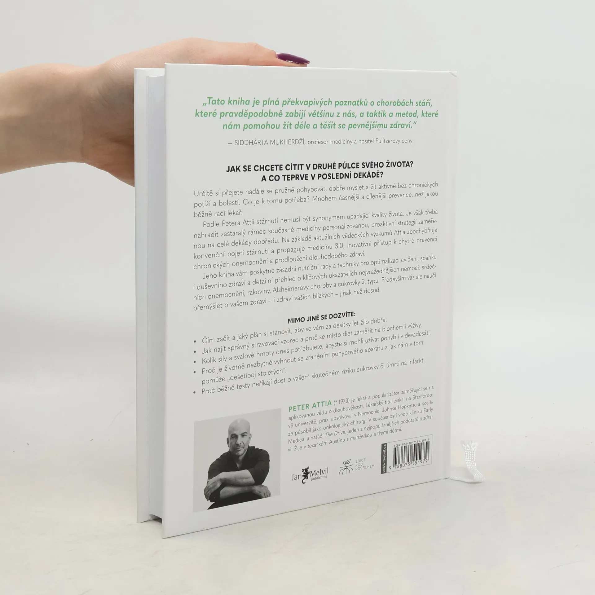 Určitě si přejete nadále se pružně pohybovat, dobře myslet a žít aktivně bez chronických potíží a bolestí. Co je k tomu třeba? Mnohem časnější a cílenější prevence, než jakou běžně radí lékař. Peter Attia věří, že zastaralý rámec současné medicíny musíme nahradit personalizovanou, proaktivní strategií zaměřenou na celé dekády dopředu. Na základě aktuálních vědeckých výzkumů Attia zpochybňuje konvenční pojetí stárnutí a propaguje medicínu 3.0, inovativní přístup k chytré prevenci chronických onemocnění a prodloužení dlouhodobého zdraví. Jeho kniha vám poskytne zásadní nutriční rady a techniky pro optimalizaci cvičení, spánku i duševního zdraví a detailní přehled o klíčových ukazatelích nejvražednějších nemocí: srdečních chorob, rakoviny, Alzheimerovy choroby a cukrovky 2. typu. Především vás ale naučí přemýšlet o vašem zdraví – i zdraví vašich blízkých – jinak než dosud.