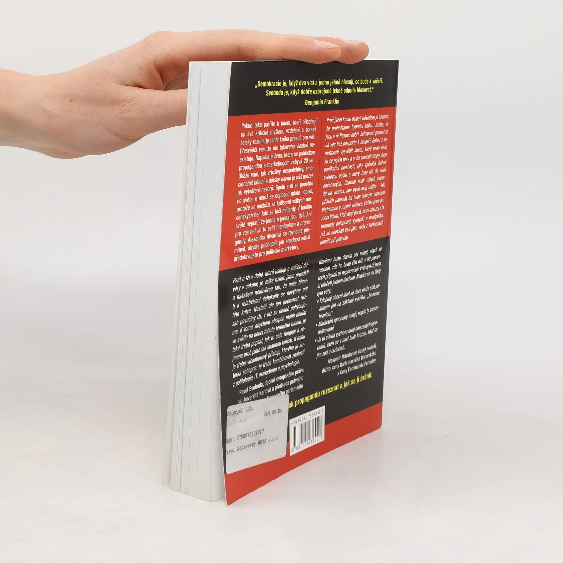 Pokud patříte k lidem, kteří věří v kritické myšlení, vzdělání a zdravý rozum, tato kniha je pro vás. Autorka, která se více než 20 let věnuje politické propagandě a marketingu, vás přesvědčí, že naše názory jsou často formovány nespolehlivým, emocionálně labilním a naivním způsobem. Společně se ponoříte do světa, kde se točí miliardy a kde neplatí jednoduché pravdy. Tento svět manipulace a propagandy ukazuje, jak snadnou kořistí se stáváme pro politické marketéry. Důvodem k napsání knihy je pocit bezmoci v hybridní válce, kde Rusové excelují. Autorka se snaží otevřít oči těm, kteří nevidí, jak panikařící nenávist ovlivňuje naše myšlení a chování, podobně jako v minulosti. Znepokojuje ji chování lidí ve vesnici, kde žijí její rodiče, a touha pomoci těm, kteří se cítí zahlceni polopravdami a manipulacemi, jež se šíří jako voda při povodni. Tato kniha vám poskytne nástroje k rozpoznání propagandy a naučí vás, jak se jí bránit.