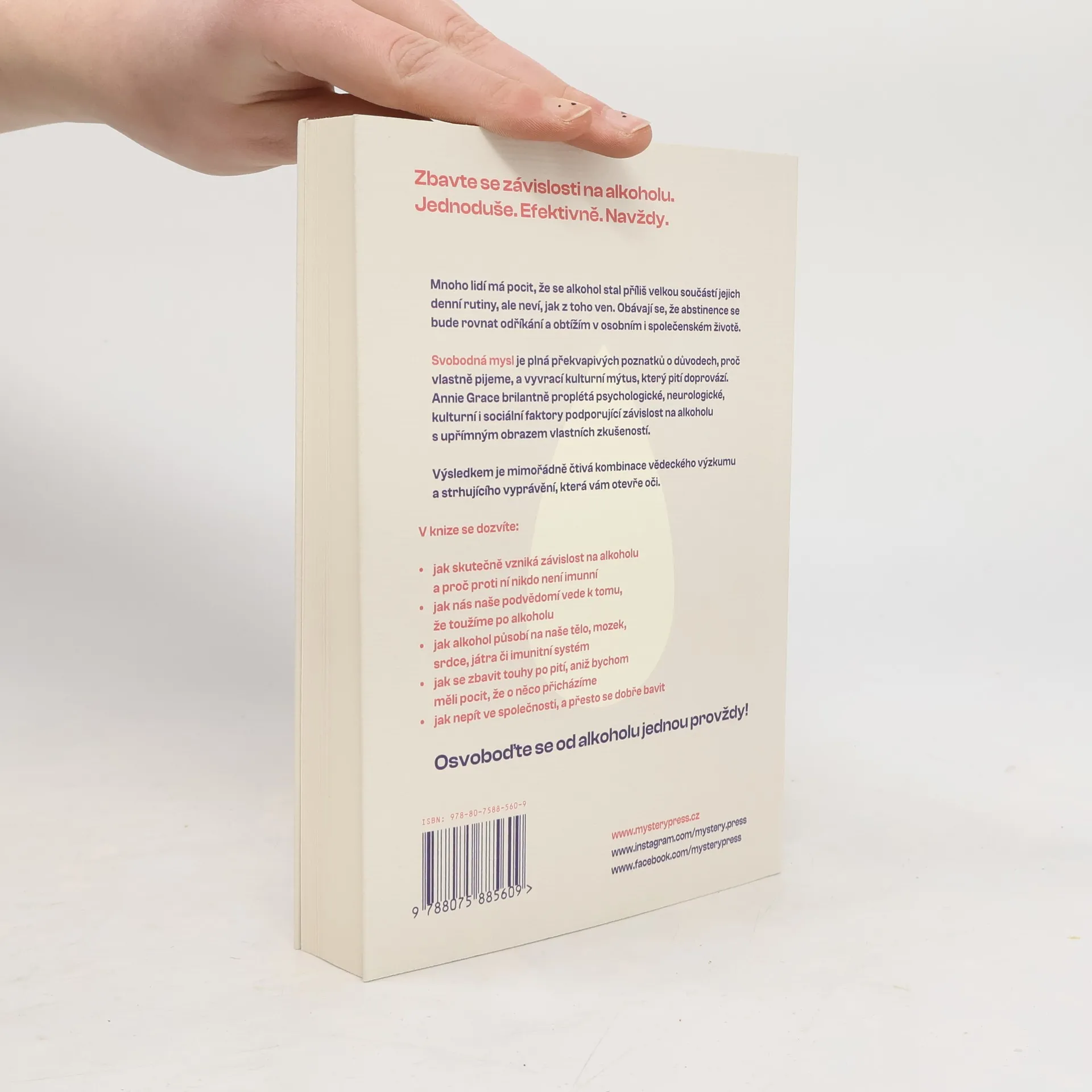 OSVOBOĎTE SE OD ALKOHOLU, NAJDĚTE ŠTĚSTÍ A OD ZÁKLADU ZMĚŇTE SVŮJ ŽIVOT... Mnoho lidí má pocit, že se alkohol stal příliš velkou součástí jejich denní rutiny, ale neví, jak z toho ven. Obávají se, že abstinence se bude rovnat odříkání a obtížím v osobním i společenském životě. Svobodná mysl je plná překvapivých poznatků o důvodech, proč vlastně pijeme, a vyvrací kulturní mýtus, který pití doprovází. Annie Grace brilantně proplétá psychologické, neurologické, kulturní i sociální faktory podporující závislost na alkoholu s upřímným obrazem vlastních zkušeností. Výsledkem je mimořádně čtivá kombinace vědeckého výzkumu a strhujícího vyprávění, která vám otevře oči. V knize se dozvíte: jak skutečně vzniká závislost na alkoholu a proč proti ní nikdo není imunní jak nás naše podvědomí vede k tomu, že toužíme po alkoholu jak alkohol působí na naše tělo, mozek, srdce, játra či imunitní systém jak se zbavit touhy po pití, aniž bychom měli pocit, že o něco přicházíme jak nepít ve společnosti, a přesto se dobře bavit Osvoboďte se od alkoholu jednou provždy!