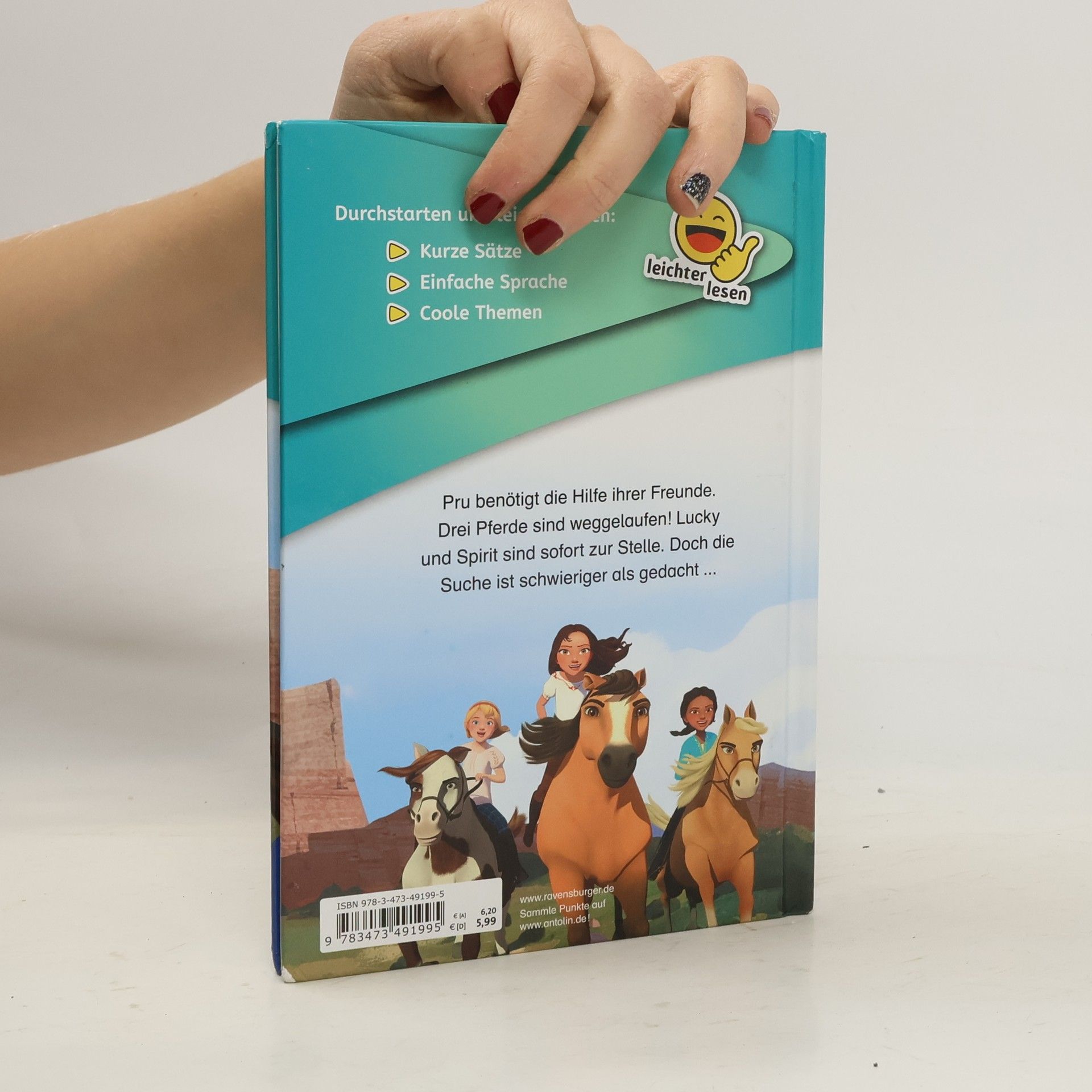 Endlich leichter lesen! Spannende Themen und coole Illustrationen wecken das Interesse am Lesen. Kurze Texte, einfache Wortwahl und eine übersichtliche Gestaltung ermöglichen ein Lesevergnügen für alle Kinder. Das Buch zur spannenden Spirit-Serie! Prus Vater möchte drei wunderschöne Stuten verkaufen. Als er einen Tag auf Reisen ist, soll Pru sich um die Pferde kümmern. Doch die Stuten sind nicht nur hübsch, sondern leider auch sehr frech. Sie büxen aus dem Stall aus. Zu allem Überfluss steht gerade jetzt ein interessierter Käufer vor der Tür! Die Mädchen müssen sich etwas einfallen lassen. Pru und Lucky versuchen mithilfe von Spirit, die Pferde einzufangen. Abigail führt den Käufer durch ihre schöne Stadt. Können die Mädchen die Pferde einfangen, bevor der Käufer verärgert wegfährt und Prus Vater zurückkommt? Mit vielen Bildern aus der Serie, die die Geschichte lebendig werden lassen! Kurze Texte ermöglichen auch Kindern mit wenig Leseerfahrung schnelle Erfolgserlebnisse. Spannende Geschichten werden in einfachen Wörtern und kurzen Sätzen erzählt. Dabei ist der Text optimal gestaltet und bietet einen schnellen Überblick. Coole Illustrationen wecken das Interesse und bieten ein fantasievolles Leseerlebnis. „leichter lesen“ ermöglicht Kindern der 3. und 4. Klasse den Einstieg ins Lesen. Nur so kann Lesenlernen Spaß machen: in gut machbaren Portionen. Was macht diese Texte einfach? Bekannte Wörter, die häufig benutzt werden, kurze Wörter und ein einfacher Satzbau. Nur wenige Zeilen pro Seite ermutigen Kinder mit Leseschwierigkeiten das Lesen einfach mal auszuprobieren. Pferdefans aufgepasst! Auf Lucky und Spirit wartet ein großes Abenteuer: Pru benötigt die Hilfe ihrer Freunde. Während ihr Vater verreist ist, sind drei Stuten aus dem Stall ausgebüxt. Ausgerechnet die, die Prus Vater verkaufen möchte. Natürlich sind Lucky und ihr Wildpferd Spirit sofort zur Stelle. Sie versuchen, die Pferde wieder einzufangen. Wäre da nur nicht ein ungeduldiger Käufer, der die Tiere sofort sehen möchte! Werden sie es schaffen, die Pferde rechtzeitig zurückzubringen?