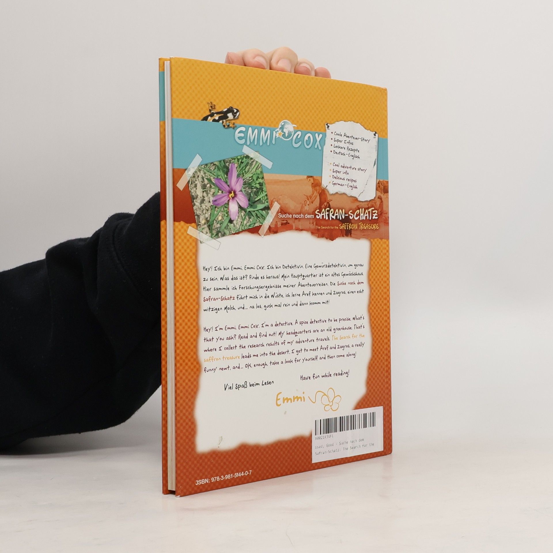 Emmi Cox ist eine Gewürzdetektivin. Sobald sie sich - meist zufällig - näher mit einem Gewürz beschäftigt, befindet sie sich plötzlich im Herkunftsland oder auch Hauptproduktionsland eines bestimmten Gewürzes. In fernen Ländern werden Gewürze erforscht: Wo genau wachsen sie? Wie sehen die Gewürzpflanzen aus? Wie werden die Gewürze geerntet und verarbeitet? Wozu verwendet man Gewürze? In diesem ersten Band der Emmi-Cox-Reihe geht es um Safran. Emmi will das wertvolle rote Gold finden, welches in besonderen Krokusblüten wächst, und reist durch die Wüstenprovinzen Persiens. Der kundige Bauernjunge Aref sowie ein vorwitziger Bergmolch namens Zagros begleiten die Gewürzdetektivin auf ihrer Suche nach dem Safran-Schatz. Das Forschertagebuch im Anschluss an die Abenteuergeschichte bietet zahlreiche vertiefende Infos über Safran, Iran und dort heimische Zagrosmolche. Zum Buch passende Rezepte sind auch mit dabei!