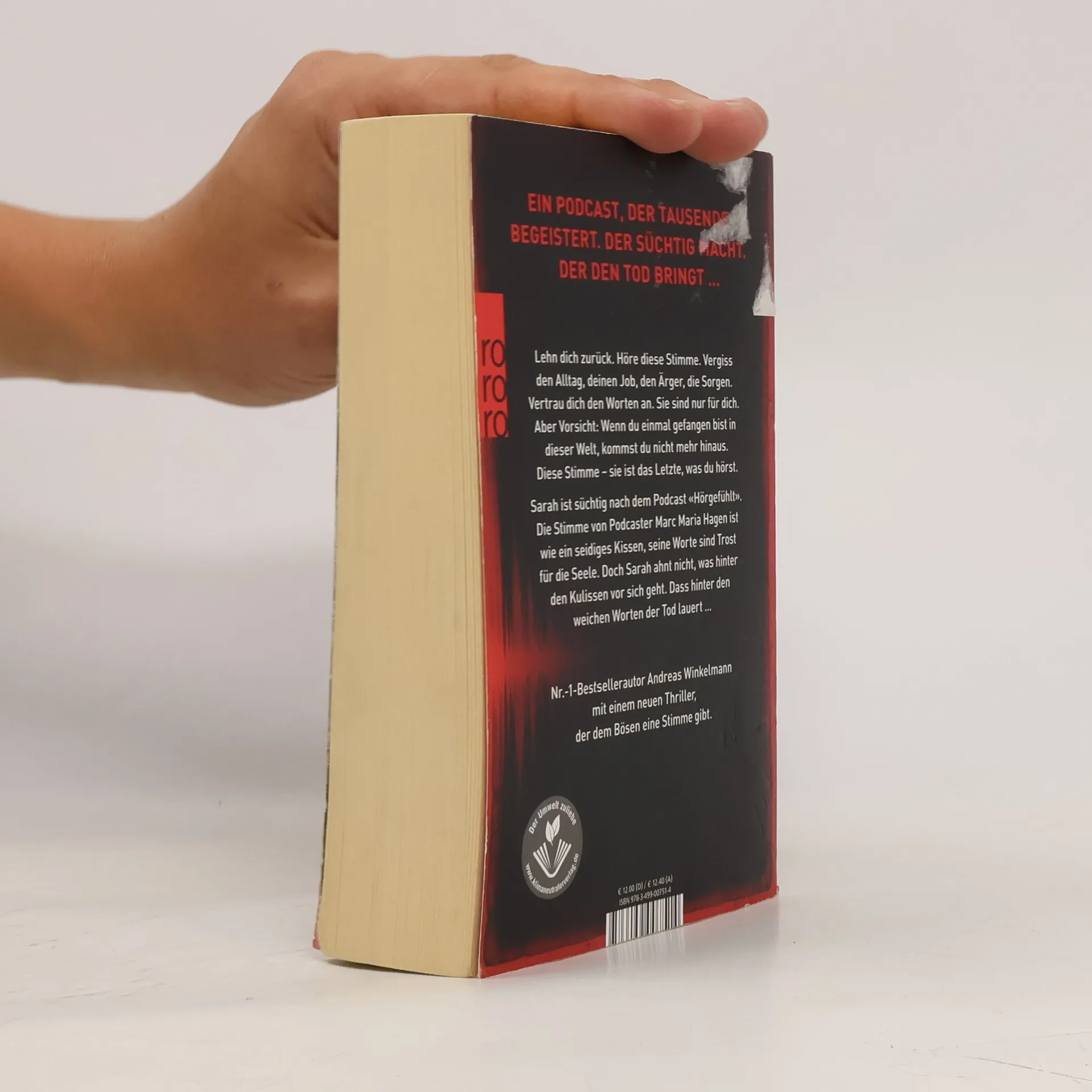 Ein Podcast, der Tausende begeistert. Der süchtig macht. Der den Tod bringt … Lehn dich zurück. Höre diese Stimme. Vergiss deinen Alltag, den Job, den Ärger, die Sorgen. Vertrau dich den Worten an. Sie sind nur für dich. Aber Vorsicht: Wenn du einmal gefangen bist in dieser Welt, kommst du nicht mehr hinaus. Diese Stimme – sie ist das Letzte, was du hörst. Sarah ist süchtig nach dem Podcast «Hörgefühlt». Die Stimme von Podcaster Marc Maria Hagen ist wie ein seidiges Kissen, seine Worte sind Trost für die Seele. Doch Sarah ahnt nicht, was hinter den Kulissen vor sich geht. Dass hinter den weichen Worten der Tod lauert. Nr.-1-Bestsellerautor Andreas Winkelmann mit einem neuen Thriller, der dem Bösen eine Stimme gibt.