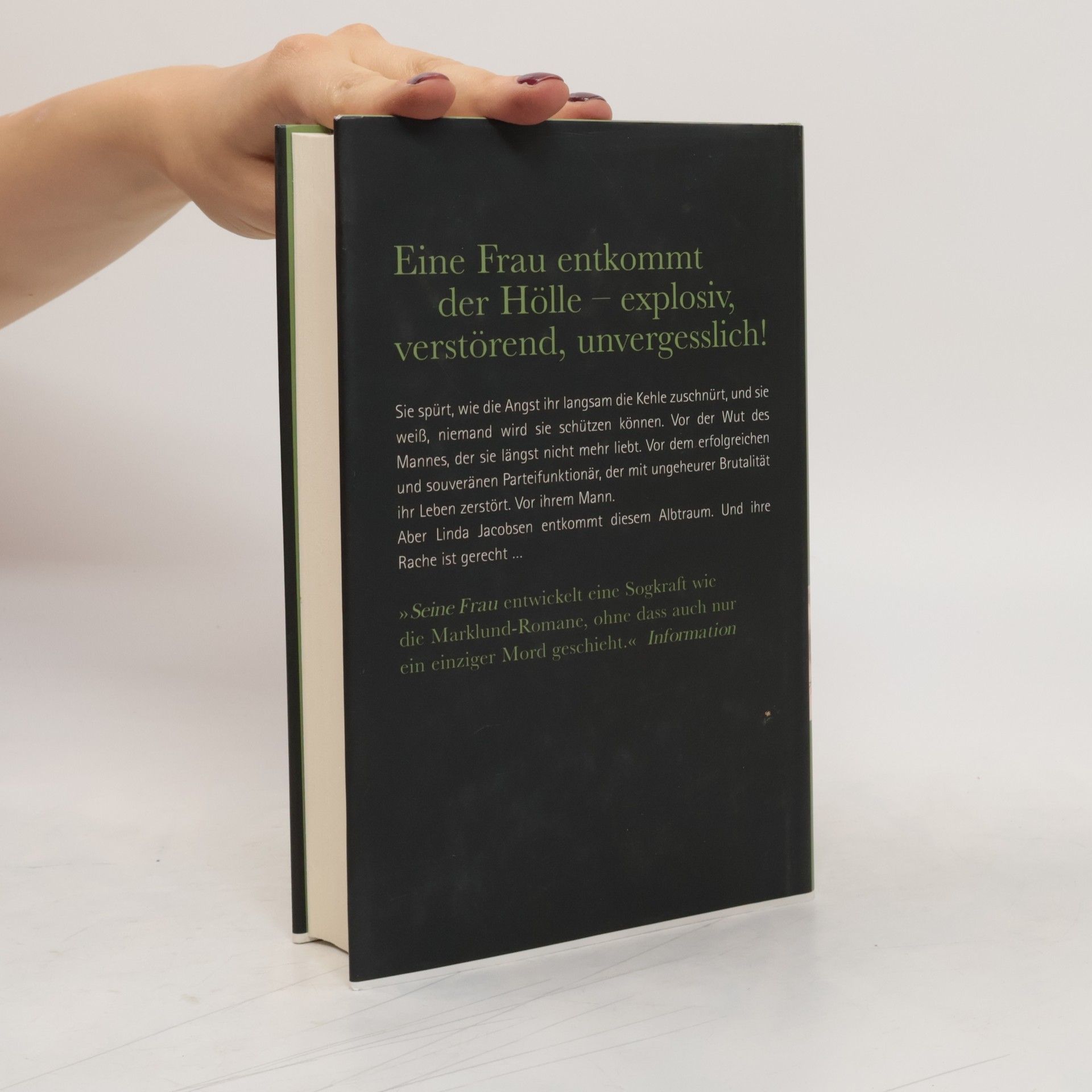 Eine Frau entkommt der Hölle – explosiv, verstörend, unvergesslich! Sie spürt, wie die Angst ihr langsam die Kehle zuschnürt, und sie weiß, niemand wird sie schützen können. Vor der Wut des Mannes, der sie längst nicht mehr liebt. Vor dem erfolgreichen Parteifunktionär, der mit ungeheurer Brutalität ihr Leben zerstört. Vor ihrem Mann. Aber Linda Jacobsen entkommt dieser Hölle. Und Rache ist immer gerecht … Linda Jacobsen, die Frau des dänischen Finanzministers, verfolgt am Wahlabend die Niederlage seiner Partei einsam in ihrer Villa vor dem Fernseher. Das Gesicht ihres Mannes sagt ihr schon jetzt, was sich hinter der Fassade dieses so entgegenkommenden, rhetorisch gewandten Machtmenschen verbirgt. Sie weiß, dass Gert seine Frustration später, wenn er nach Hause kommt, an ihr auslassen wird. Und sie behält recht. Was nun folgt, ist die Geschichte einer Frau, die trotz vieler Zweifel und Rückschläge den Mut aufbringt, sich aus einer Ehe zu befreien, die für sie jahrelang die Hölle war. Noch wiegt sich Gert in Sicherheit, glaubt immer noch, er und Linda könnten weiterhin in der Öffentlichkeit das perfekte Paar spielen, damit er die Macht in seiner Partei zurückgewinnt. Doch Gert Jacobsen hat die Rechnung ohne seine Frau gemacht!
