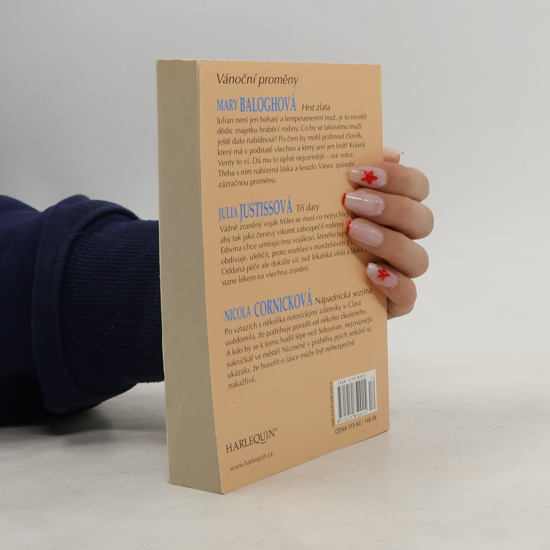 Mary Balogh: Hrst zlata Julian není jen bohatý a temperamentní muž, je to rovněž dědic majetku hraběcí rodiny. Co by se takovému muži ještě dalo nabídnout? Po čem by mohl prahnout člověk, který má v podstatě všechno a který umí jen brát? Krásná Verity to ví. Dá mu to úplně nejcennější – své srdce. Třeba s ním nabízená láska a kouzlo Vánoc způsobí zázračnou proměnu. Julia Justissová: Tři dary Vážně zraněný voják Miles se musí co nejrychleji oženit, aby tak jako čerstvý vikomt zabezpečil rodinný majetek. Edwina chce umírajícímu vojákovi, kterého tajně obdivuje, ulehčit, proto souhlasí s manželstvím z rozumu. Oddaná péče ale dokáže víc než lékařská věda a láska se stane lékem na všechna zranění. Nicola Cornicková: Nápadnická sezóna Po vztazích s několika notorickými záletníky si Clara uvědomila, že potřebuje poradit od někoho zkušeného. A kdo by se k tomu hodil lépe než Sebastian, nejznámější sukničkář ve městě? Nicméně v průběhu jejich setkání se ukázalo, že hovořit o lásce může být nebezpečně nakažlivé.
