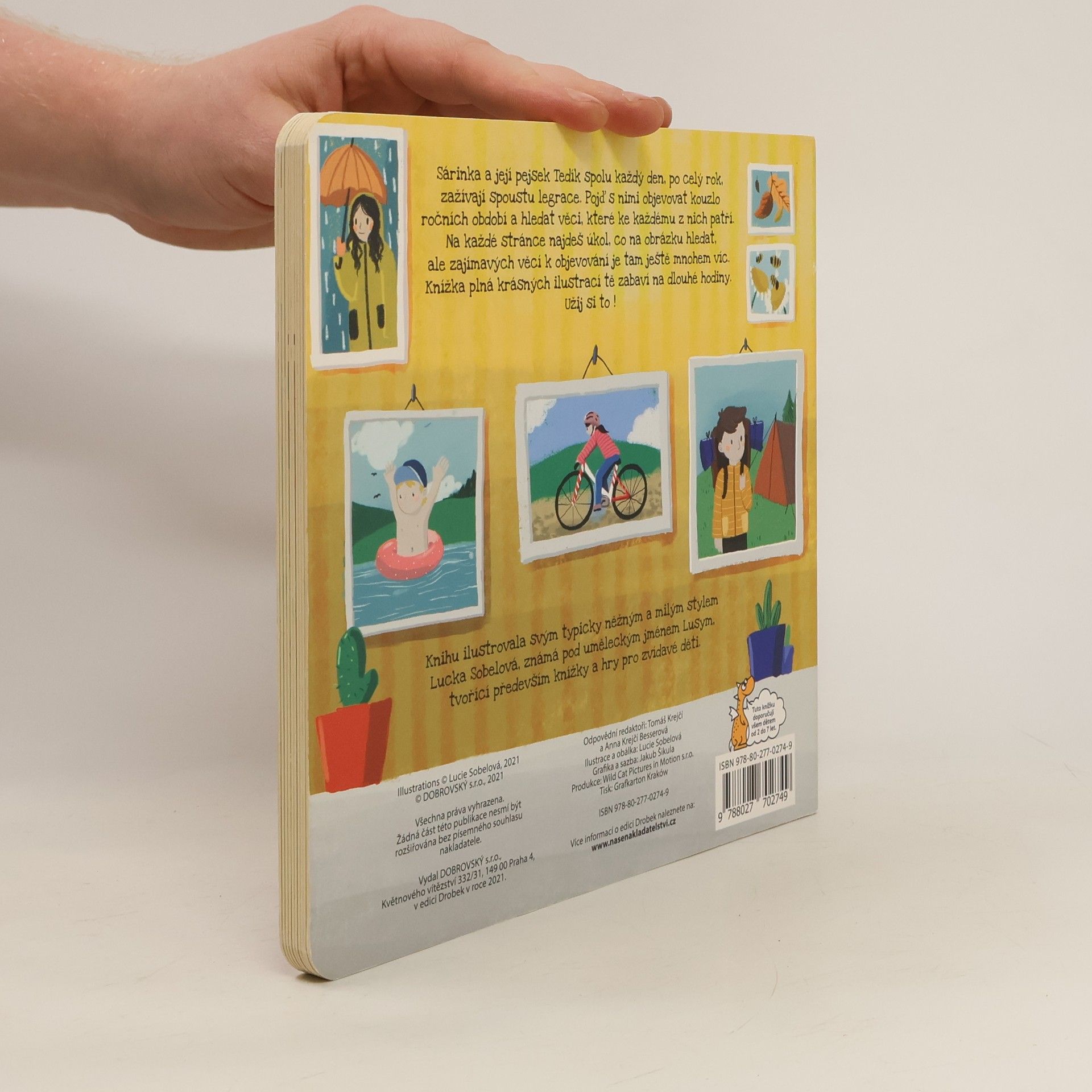 Sárinka a její pejsek Tedík spolu každý den, po celý rok, zažívají spoustu legrace. Pojď s nimi objevovat kouzlo ročních období a hledat věci, které ke každému z nich patří. Na každé stránce najdeš úkol, co na obrázku hledat, ale zajímavých věcí na objevování je tam ještě mnohem víc. Knížka plná krásných ilustrací tě zabaví na dlouhé hodiny. Užij si to!