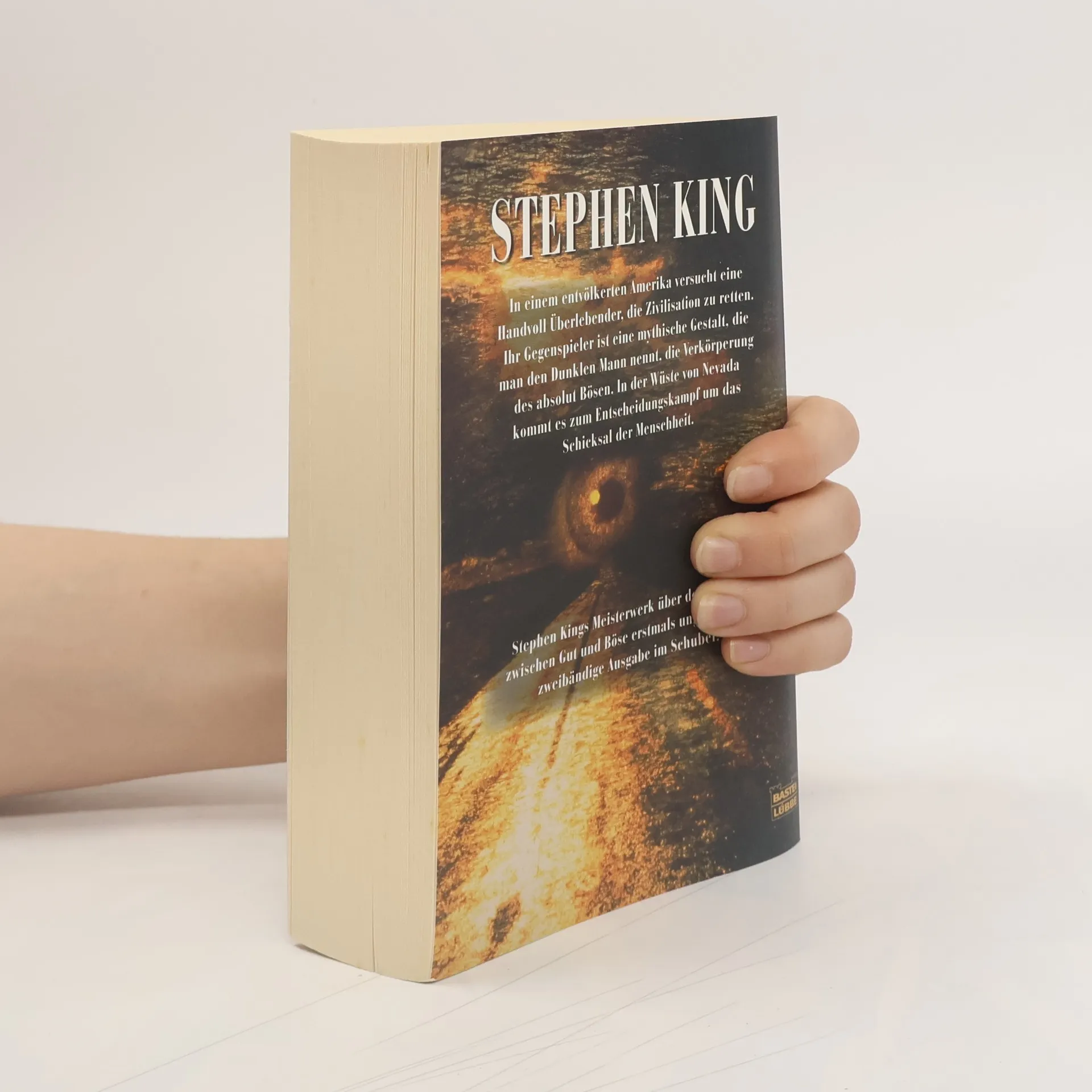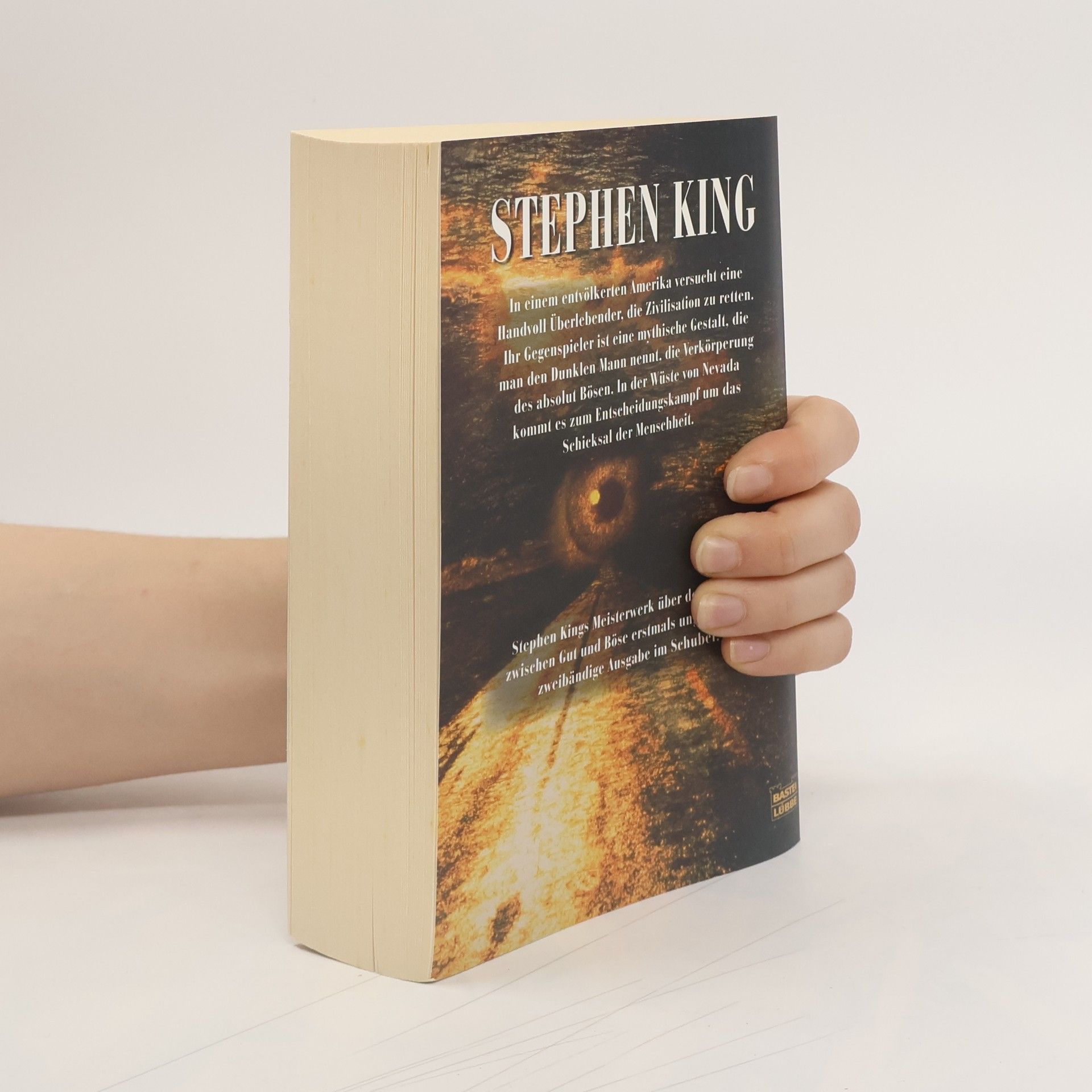 In einem entvölkerten Amerika versucht eine Handvoll Überlebender, die Zivilisation zu retten. Ihr Gegenspieler ist eine mythische Gestalt, die man den Dunklen Mann nennt, die Verkörperung des absolut Bösen. In der Wüste von Nevada kommt es zum Entscheidungskampf um das Schicksal der Menschheit. Stephen Kings Meisterwerk über den kampf zwischen Gut und Böse erstmals ungekürzt als zweibändige Ausgabe im Schuber.