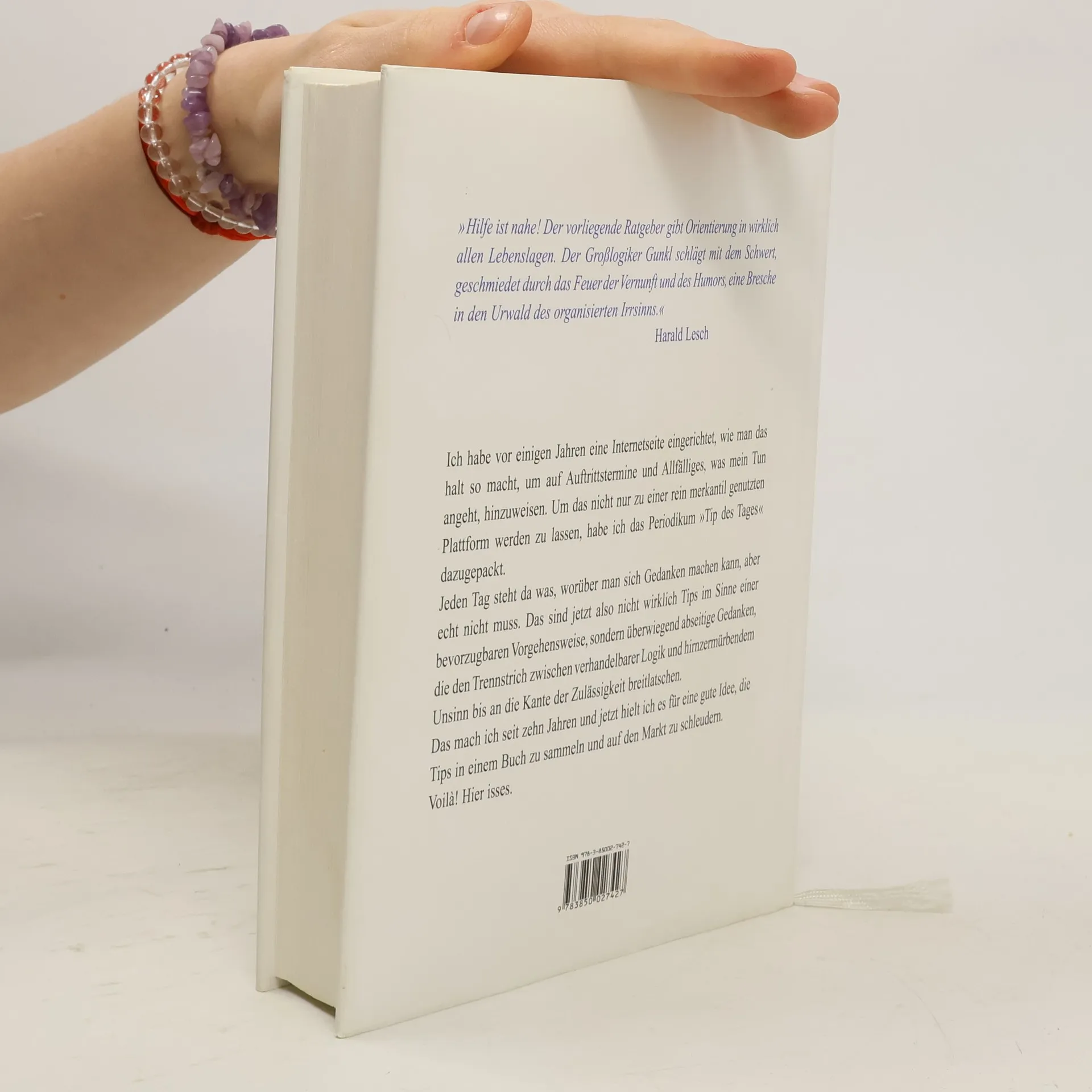 \"Ich habe vor einigen Jahren eine Internetseite eingerichtet, wie man das halt so macht, um auf Auftrittstermine und Allfälliges, was mein Tun angeht, hinzuweisen. Um das nicht nur zu einer rein merkantil genutzten Plattform werden zu lassen, habe ich das Periodikum ‚Tip des Tages‘ dazugepackt. Jeden Tag steht da was, worüber man sich Gedanken machen kann, aber echt nicht muss. Das sind jetzt also nicht wirklich Tips im Sinne einer bevorzugbaren Vorgehensweise, sondern überwiegend abseitige Gedanken, die den Trennstrich zwischen verhandelbarer Logik und hirnzermürbendem Unsinn bis an die Kante der Zulässigkeit breitlatschen. Das mach ich seit zehn Jahren und jetzt hielt ich es für eine gute Idee, die Tips in einem Buch zu sammeln und auf den Markt zu schleudern. Voilà! Hier isses.\" -- Günther Paal