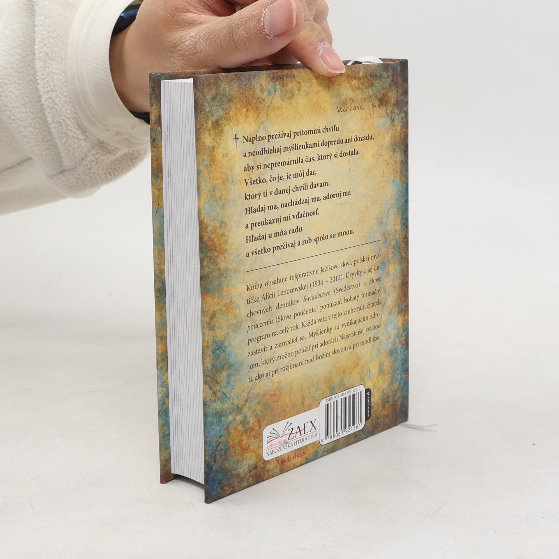 ,,Naplno prežívaj prítomnú chvíľu a neodbiehaj myšlienkami dopredu ani dozadu, aby si nepremárnila čas, ktorý si dostala. Všetko, čo je, je môj dar, ktorý ti v danej chvíli dávam. Hľadaj ma, nachádzaj ma, adoruj ma a preukazuj mi vďačnosť. Hľadaj u mňa radu a všetko prežívaj a rob spolu so mnou.,, Kniha obsahuje inšpiratívne Ježišove slová poľskej mystičke Alícii Lenczewskej (1934 2012). Úryvky z jej duchovných denníkov Świadectwo (Svedectvo) a Słowopouczenia (Slovo poučenia) ponúkajú bohatý formačný program na celý rok. Každá veta v tejto knihe núti čitateľa zastaviť a zamyslieť sa. Myšlienky sú vynikajúcim zdrojom, ktorý možno použiť pri adorácii Najsvätejšej sviatosti, ako aj pri rozjímaní nad Božím slovom a pri modlitbe.