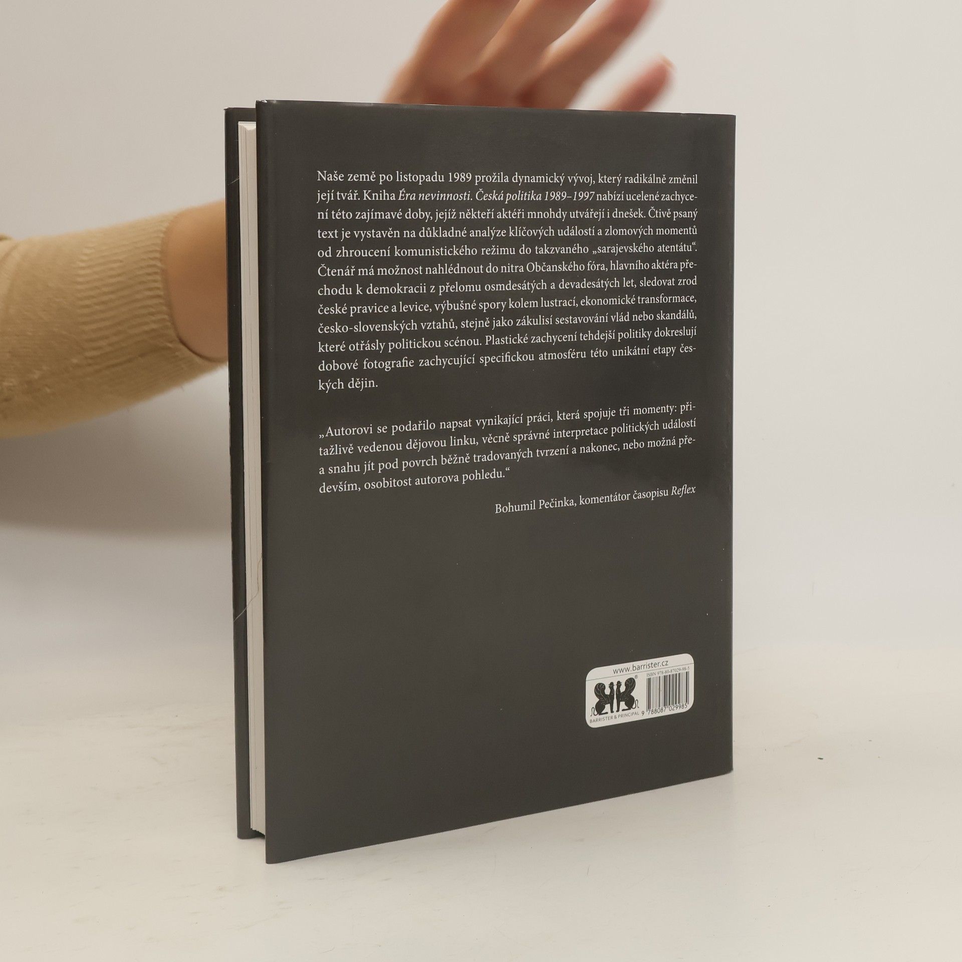 Česká politika 1989-1997. Naše země po listopadu 1989 prožila dynamický vývoj, který radikálně změnil její tvář. Kniha Éra nevinnosti. Česká politika 1989-1997 nabízí ucelené zachycení této zajímavé doby, jejíž někteří aktéři mnohdy utvářejí i dnešek. Čtivě psaný text je vystavěn na důkladné analýze klíčových událostí a zlomových momentů od zhroucení komunistického režimu do takzvaného \"sarajevského atentátu\". Čtenář má možnost nahlédnout do nitra Občanského fóra, hlavního aktéra přechodu k demokracii z přelomu osmdesátých a devadesátých let, sledovat zrod české pravice a levice, výbušné spory kolem lustrací, ekonomické transformace, česko-slovenských vztahů, stejně jako zákulisí sestavování vlád nebo skandálů, které otřásly politickou scénou. Plastické zachycení tehdejší politiky dokreslují dobové fotografie zachycující specifickou atmosféru této unikátní etapy českých dějin.