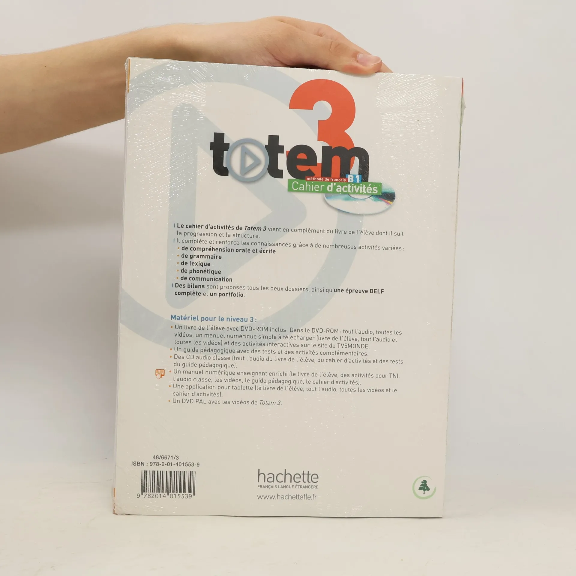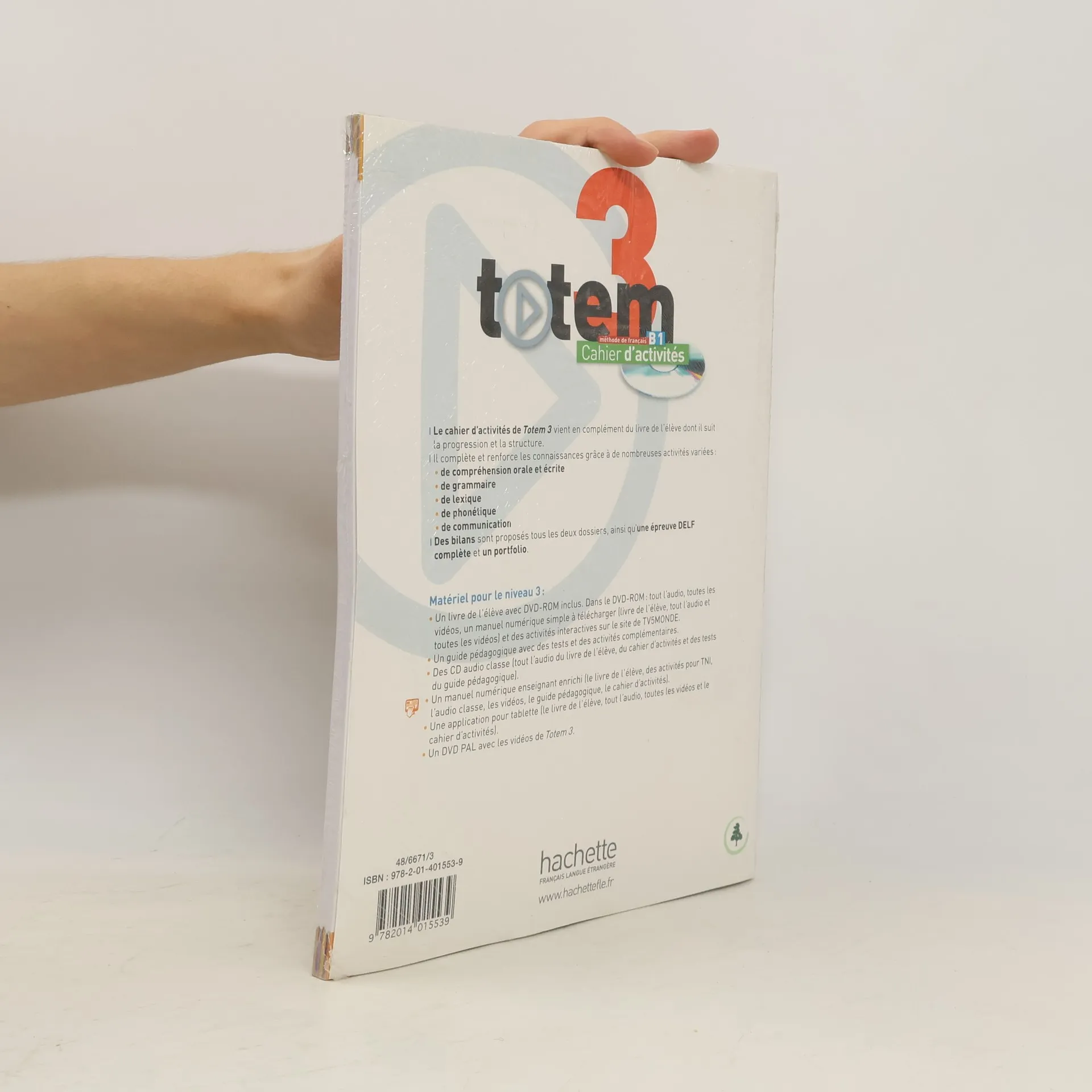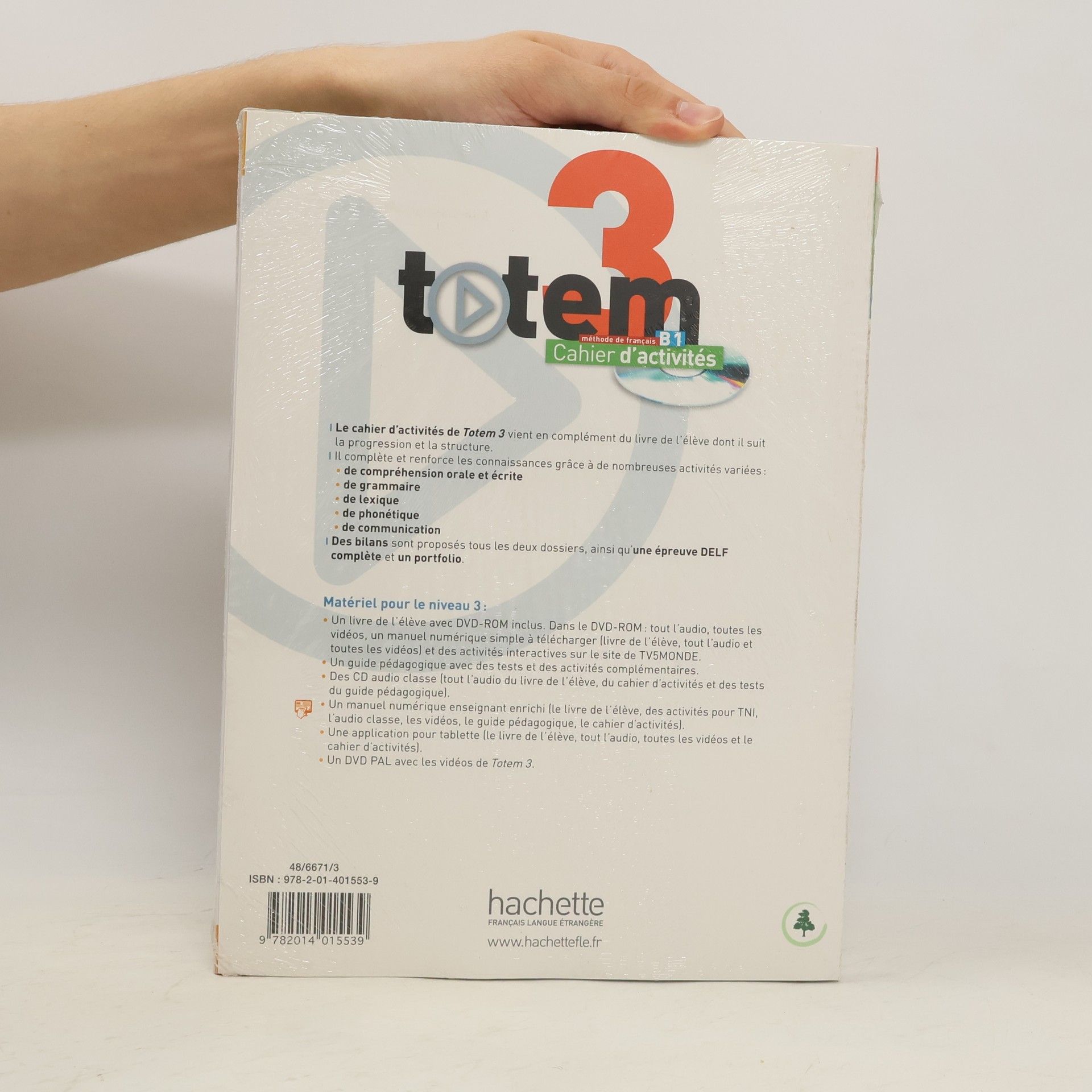 Découvrez Totem 3, le niveau B1 de la nouvelle méthode vidéo ! Structure : Toujours au coeur de l'apprentissage, des documents vidéo authentiques (extrait de film, publicité, série télévisée, émission de loisirs, culturelle et de débat.) proposent un point de départ riche et varié pour chaque dossier. Une méthode qui adopte une perspective actionnelle pour impliquer l'étudiant dans son apprentissage au niveau B1. Un travail équilibré sur l'oral et sur l'écrit, avec des apports culturels au fil du dossier Nouveau dans la double page «Culture», la découverte de 8 documents écrits différents pour sensibiliser l'apprenant à leur spécificité (littérature, poésie, correspondance). Un projet pragmatique à la fin de chaque dossier, à réaliser en groupe, pour mettre en ouvre et évaluer les compétences acquises3 épreuves complètes du DELF B1 (2 épreuves dans le livre de l'élève + 1 épreuve dans le guide pédagogique). Les composants : Livre de l'élève + DVD-ROM (audio + vidéo) + manuel numérique simple. Cahier d'activités en couleurs + CD audio Guide pédagogique CD audio classe DVD (PAL/NTSC) Manuel numérique enrichi pour l'enseignant (clé USB).