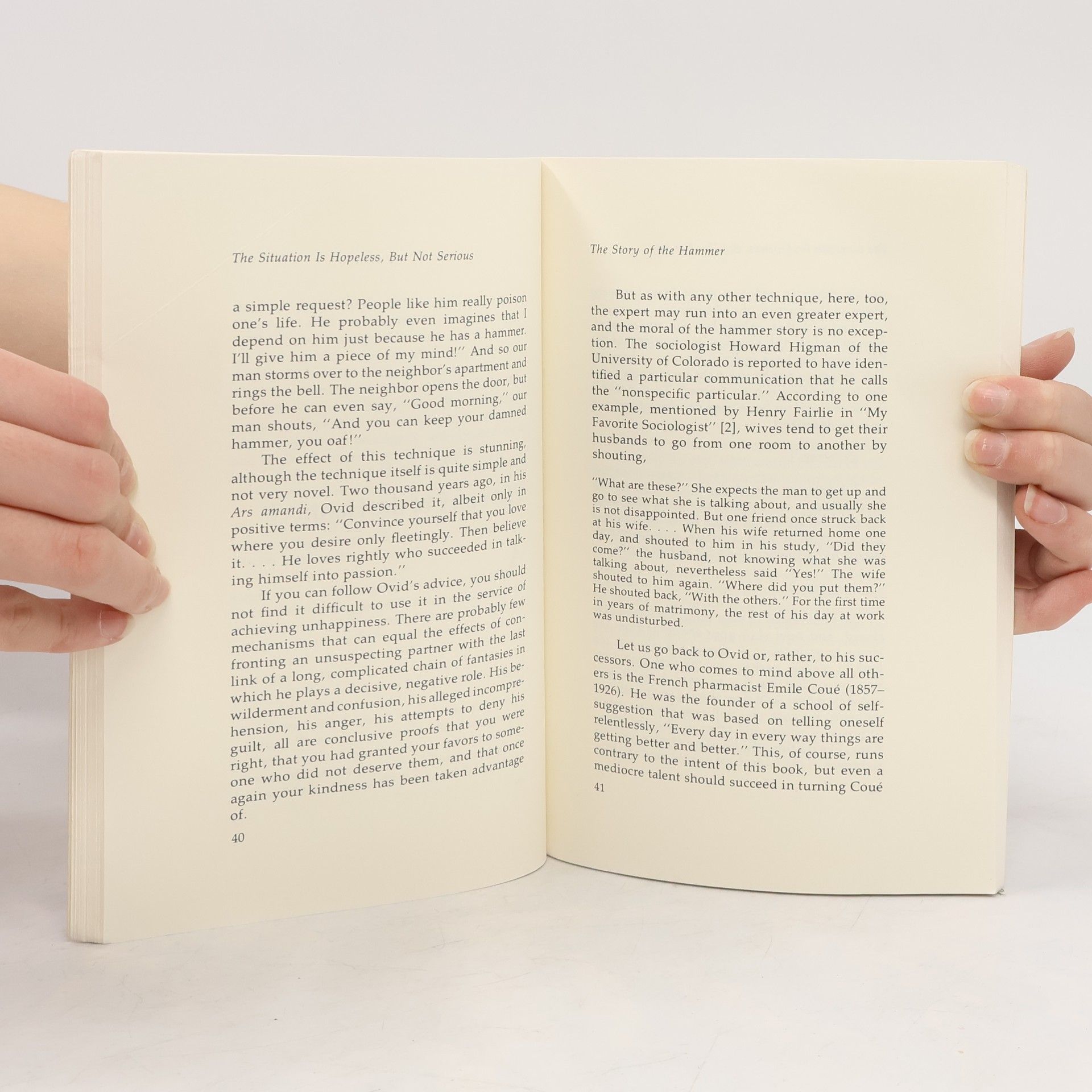 This is a tongue-in-cheek look at the ways in which we turn ourselves into our own worst enemies. Using metaphors, vignettes, jokes, innuendoes and other "right-hemispheric" language games, Dr. Watzlawick shows how we can make everyday life miserable and inflate trivialities beyond recognition. Those who believe that the search for happiness eventually leads to happiness should consult the chapter "Beware of Arriving."--Publisher description.