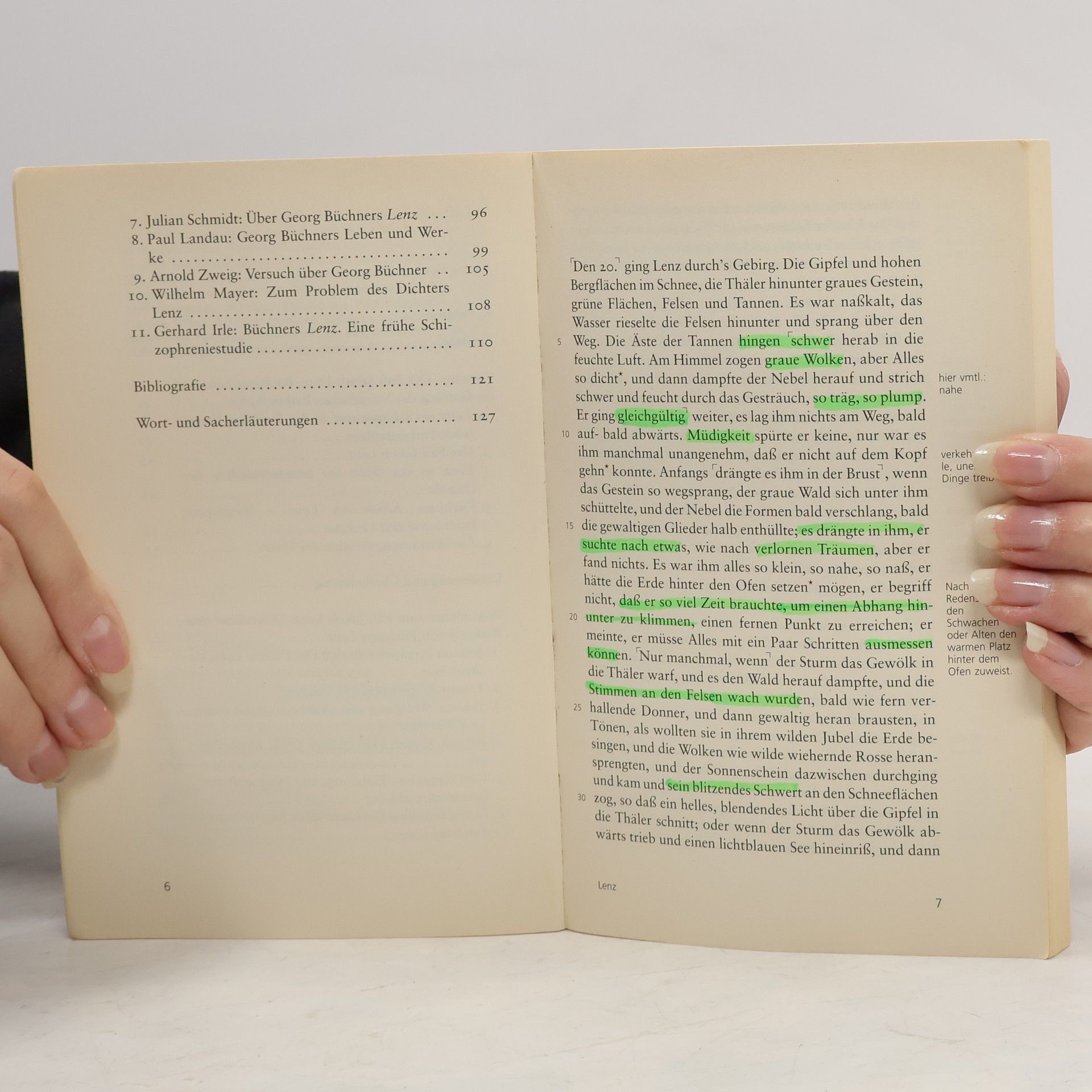 Die erst nach Georg Büchners Tod erschienene fragmentarische Erzählung Lenz (1839) gehört zu den Meisterwerken der deutschsprachigen Prosa. Büchner schildert in seiner einzigen Erzählung die fortschreitende psychische Erkrankung des Sturm-und-Drang-Autors Jakob Michael Reinhold Lenz (1751–1792) während des kurzen Aufenthalts beim Pfarrer Johann Friedrich Oberlin im Januar/Februar 1778. Die innovativen Erzähltechniken ermöglichen dem Leser ein Miterleben von Lenz' Erkrankung – die Grenzen zwischen Innen- und Außenwelt, von Vernunft und Wahnsinn scheinen zu zerfließen.