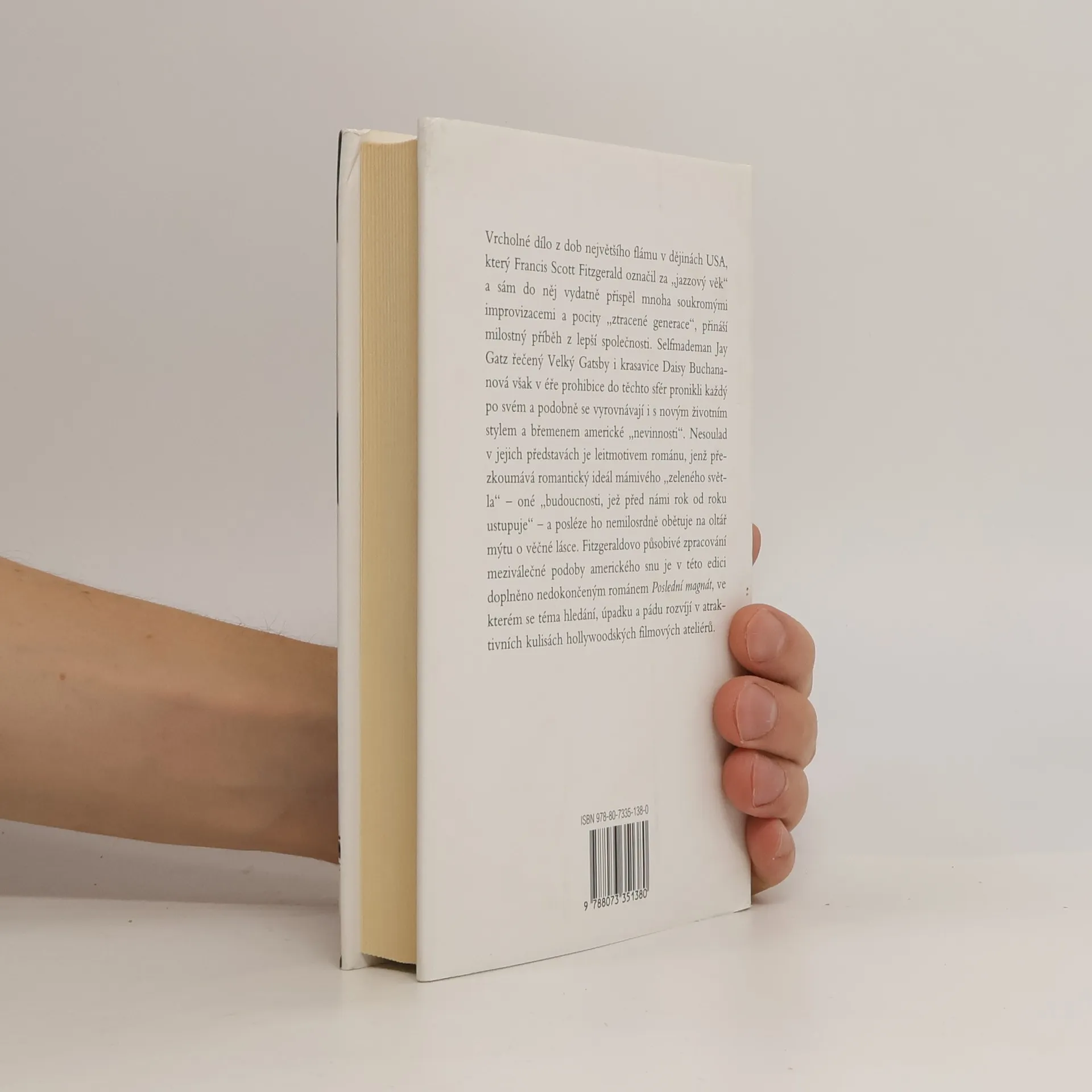 Velký Gatsby (1925), vrcholné dílo z dob největšího flámu v dějinách USA, který Francis Scott Fitzgerald označil za „jazzový věk“ a sám do něj vydatně přispěl mnoha soukromými improvizacemi a pocity „ztracené generace“, přináší milostný příběh z lepší společnosti. Selfmademan Jay Gatz řečený Velký Gatsby i krasavice Daisy Buchananová však v éře prohibice do těchto sfér pronikli každý po svém a podobně se vyrovnávají i s novým životním stylem a břemenem americké „nevinnosti“. Nesoulad v jejich představách je leitmotivem románu, jenž přezkoumává romantický ideál mámivého „zeleného světla“ oné „budoucnosti, jež před námi rok od roku ustupuje“ a posléze ho nemilosrdně obětuje na oltář mýtu o věčné lásce. Fitzgeraldovo působivé zpracování meziválečné podoby amerického snu je v této edici doplněno nedokončeným románem Poslední magnát (1941), ve kterém se téma hledání, úpadku a pádu rozvíjí v atraktivních kulisách hollywoodských filmových ateliérů.