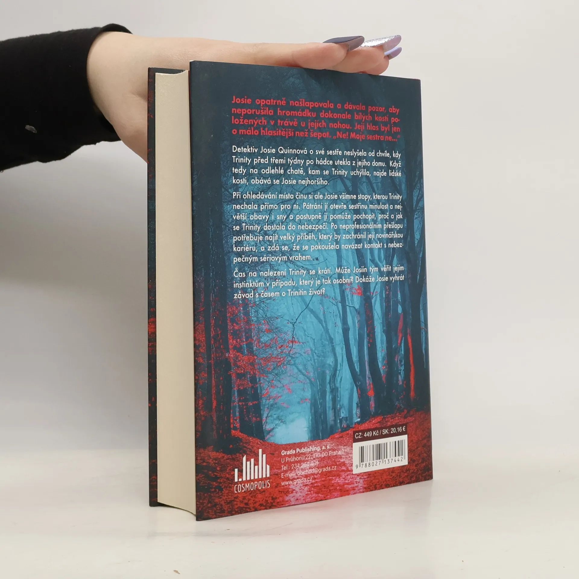 Detektiv Josie Quinnová o své sestře neslyšela od chvíle, kdy Trinity před třemi týdny po hádce utekla z jejího domu. Když tedy na odlehlé chatě, kam se Trinity uchýlila, najde lidské kosti, obává se Josie nejhoršího. Při ohledávání místa činu si ale Josie všimne stopy, kterou Trinity nechala přímo pro ni. Pátrání jí otevře sestřinu minulost a největší obavy i sny a postupně jí pomůže pochopit, proč a jak se Trinity dostala do nebezpečí. Po neprofesionálním přešlapu potřebuje najít velký příběh, který by zachránil její novinářskou kariéru, a zdá se, že se pokoušela navázat kontakt s nebezpečným sériovým vrahem. Čas na nalezení Trinity se krátí. Může Josiin tým věřit jejím instinktům v případu, který je tak osobní? Dokáže Josie vyhrát závod s časem o Trinitin život?