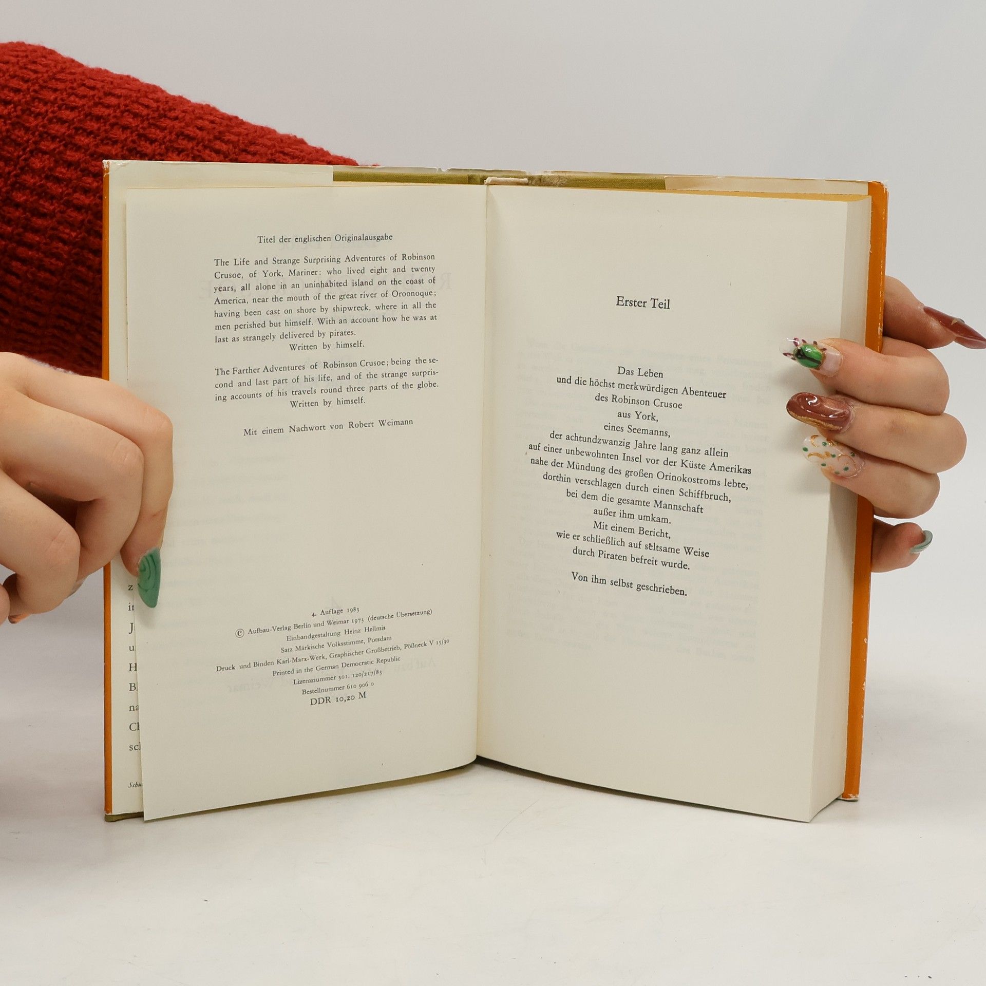 »Das Leben und die seltsamen Abenteuer des Robinson Crusoe, eines Seemanns aus York. Welcher achtundzwanzig Jahre ganz allein auf einer unbewohnten Insel vor der amerikanischen Küste, nahe der Mündung des großen Orinoco lebte, wohin er nach einem Schiffbruch, bei dem die ganze Besatzung außer ihm selbst ums Leben kam, verschlagen wurde. Nebst dem Bericht wie er auf wundersame Weise durch Piraten gerettet wurde. Geschrieben von ihm selbst.« So lautet der volle Titel des Buches, dessen wichtigste Begebenheiten hier in Auswahl dargeboten werden. Gekürzte Ausgabe