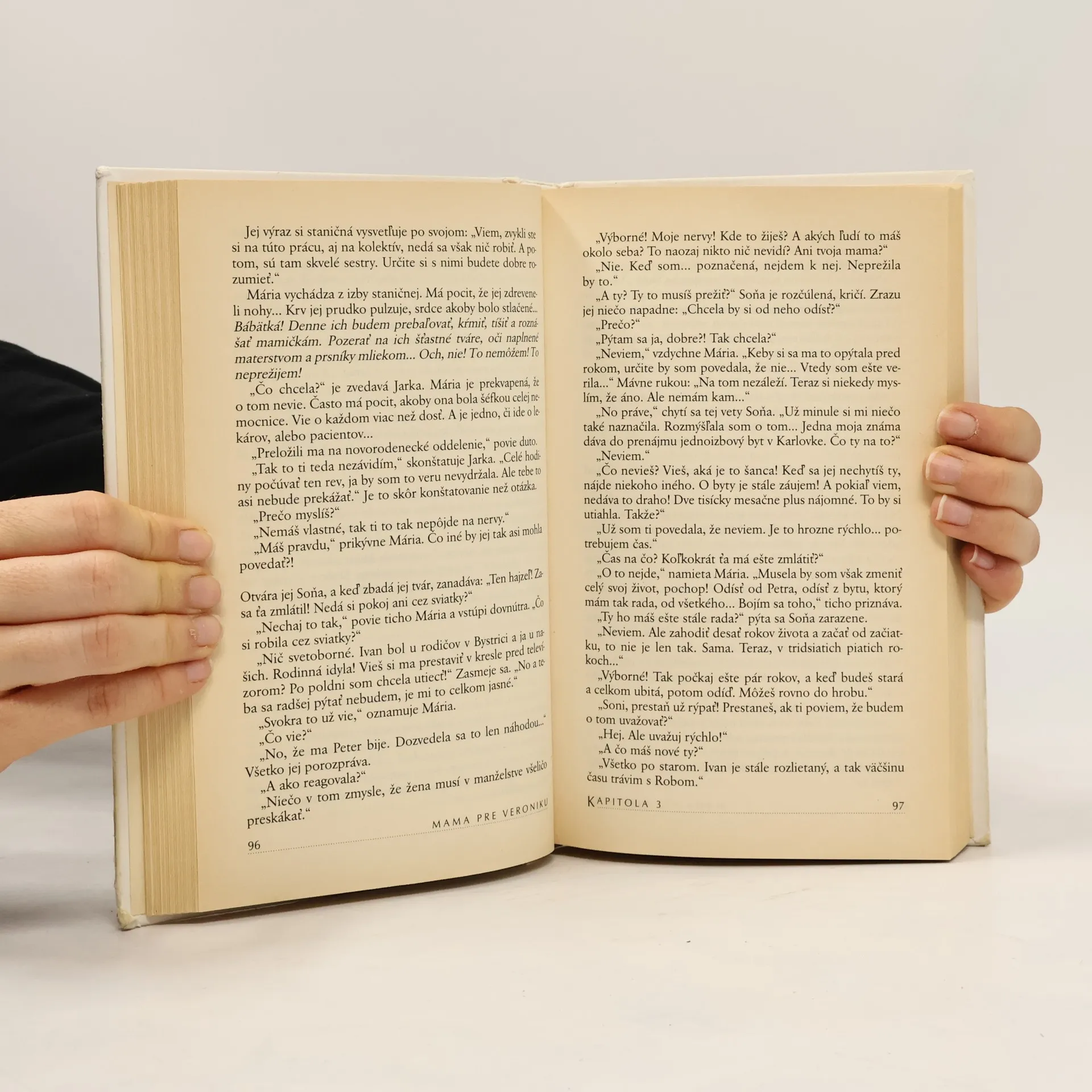 Mária, sestrička v nemocnici, žije v manželstve s Petrom, v ktorom je viac zla a smútku než pekných chvíľ. No napriek tomu v ňom zotrváva, poháňaná túžbou nezradiť svoje dievčenské sny... a naplniť ten najpodstatnejší - mať dieťa. Keď ju preradia zo ženského oddelenia na dojčenské, sú dni, keď má pocit, že to ani neprežije... drží v náruči nežné uzlíčky - nepatria však jej... Po desiatich rokoch sa predsa len odhodlá na odchod od manžela, napriek presvedčeniu, že okrem práce v nemocnici, ktorá ju baví a napĺňa, a večernej samoty v obľúbenom kresle pri pletení ju už nič nečaká. Cesty osudu sú však nevyspytateľné a vždy dokážu niečím prekvapiť... Táňa Keleová-Vasilková sa narodila roku 1964 v Chomutove. Od svojich štyroch rokoch žije v Bratislave. Ukončila štúdium žurnalistiky na Filozofickej fakulte UK v Bratislave. Má tri deti a žije so svojou rodinou v Devínskej Novej Vsi. Doteraz publikovala romány: Cena za voľnosť (1997), Manželky (1998) a Túžby (1999).
