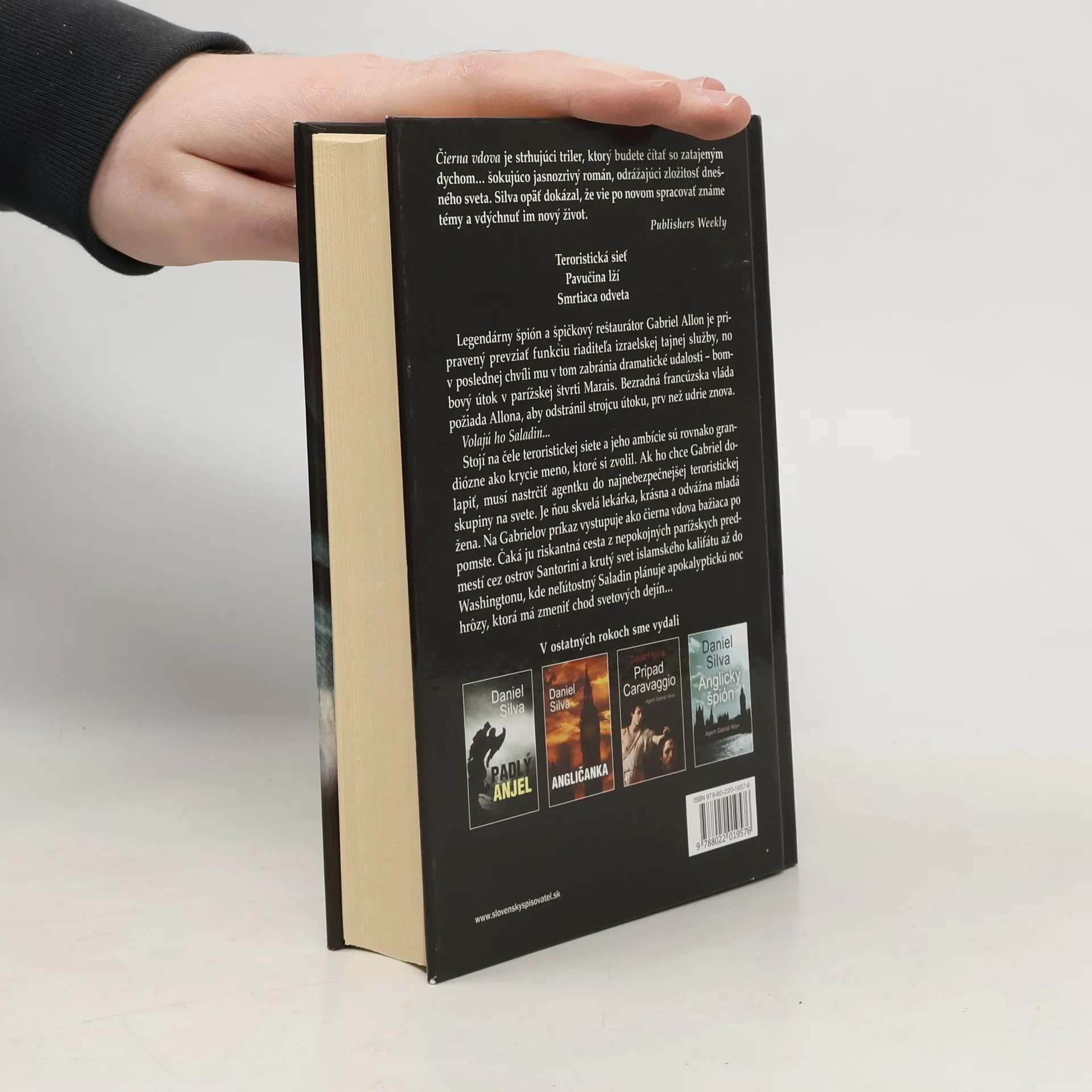 Najnovší strhujúci triler z populárnej série Daniela Silvu. Legendárny špión a reštaurátor Gabriel Allon sa chystá prevziať funkciu riaditeľa izraelskej tajnej služby, no v poslednej chvíli mu tom zabráni bombový útok v parížskej štvrti Marais. Bezradná francúzska vláda požiada Allona, aby odstránil strojcu útoku, prv než udrie znova. Hľadaným teroristom je muž, ktorého volajú Saladin. Ak ho chce Allon dolapiť, musí nastrčiť agentku do najnebezpečnejšej teroristickej skupiny na svete. Je ňou skvelá lekárka, mladá žena rovnako odvážna ako krásna. Na Gabrielov príkaz vystupuje ako čierna vdova bažiaca po pomste. Čaká ju nebezpečná cesta z parížskych predmestí cez ostrov Santorini a islamský kalifát až do Washingtonu, kde Saladin plánuje apokalyptickú noc hrôzy, ktorá má zmeniť chod svetových dejín...