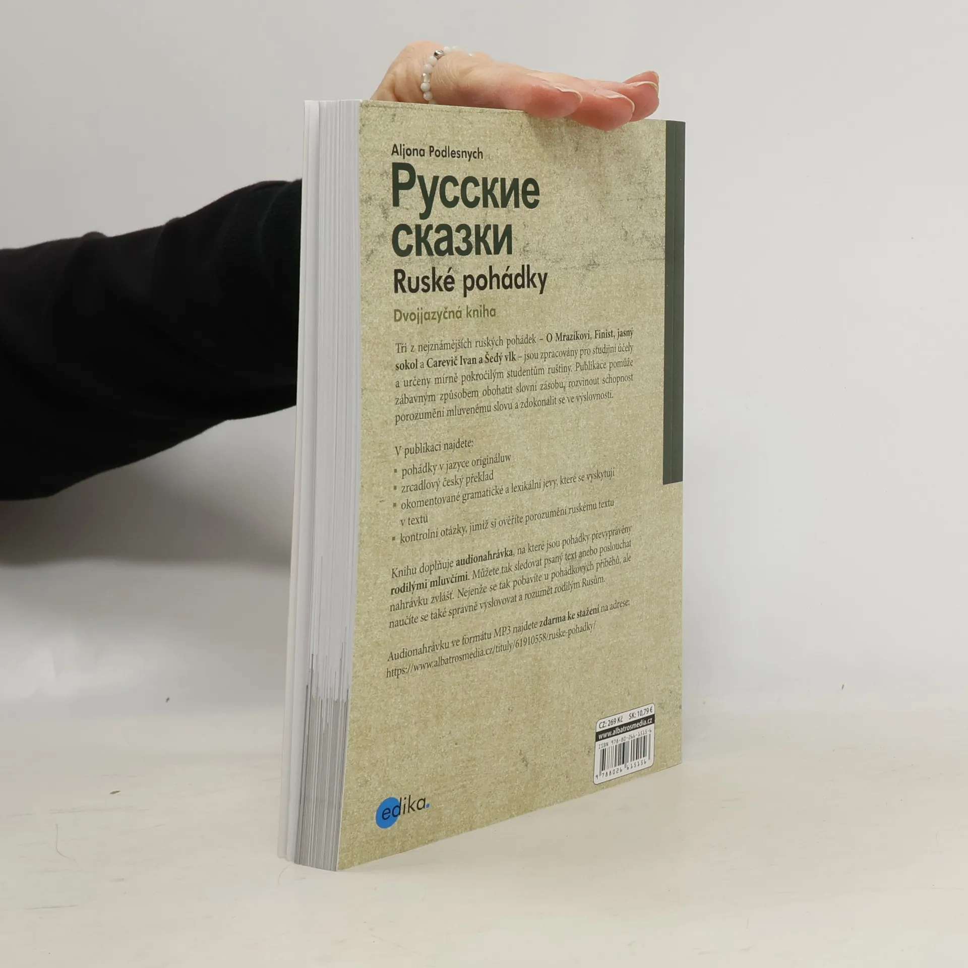 Tři z nejznámějších ruských pohádek – O Mrazíkovi, Finist, jasný sokol a Carevič Ivan a Šedý vlk – jsou zpracovány pro studijní účely a určeny mírně pokročilým studentům ruštiny. Publikace pomůže zábavným způsobem obohatit slovní zásobu, rozvinout schopnost porozumění mluvenému slovu a zdokonalit se ve výslovnosti. V publikaci najdete: * pohádky v jazyce originálu * zrcadlový český překlad * okomentované gramatické a lexikální jevy, které se vyskytují v textu * kontrolní otázky, jimiž si ověříte porozumění ruskému textu Knihu doplňuje audionahrávka, na které jsou pohádky převyprávěny rodilými mluvčími. Můžete tak sledovat psaný text anebo poslouchat nahrávku zvlášť. Audionahrávku ve formátu MP3 najdete zdarma ke stažení na stránkách nakladatelství.