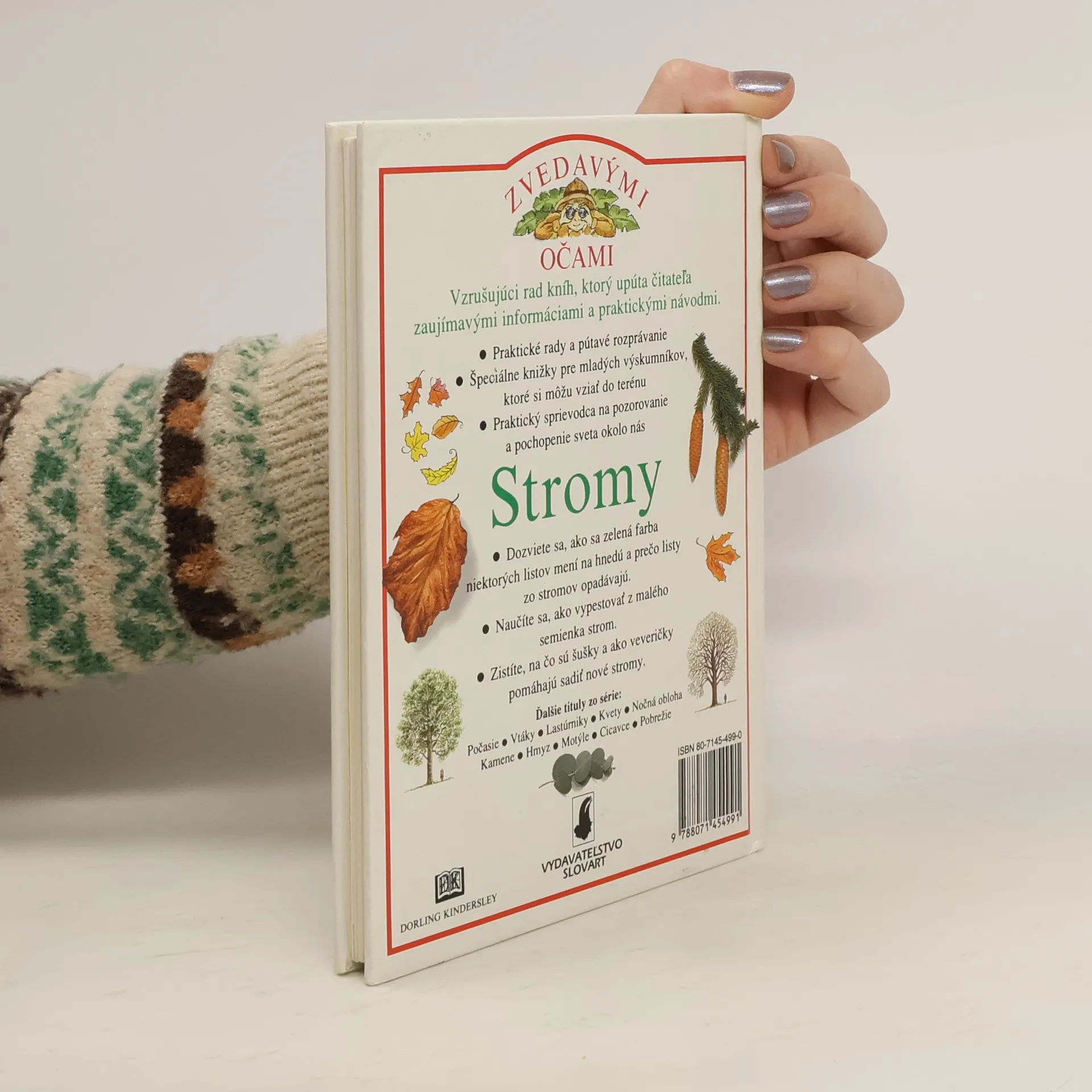 "Každé dieťa chce vedieť, ako žijú stromy, ako zistiť ich vek, prečo im hnedne a padá lístie a mnoho iného. Titul obsahuje aj návod, ako vypestovať strom zo semienka. Vzrušujúci rad kníh, ktorý upúta mladého čitateľa zaujímavými informáciami a praktickými návodmi na pozorovanie a pochopenie sveta okolo nás. Malý formát predurčuje knižky z edície Zvedavými očami na to, aby sa stali nerozlučným sprievodcom detí na vychádzkach do prírody, a aby ich mladí výskumníci mohli využiť priamo v teréne.