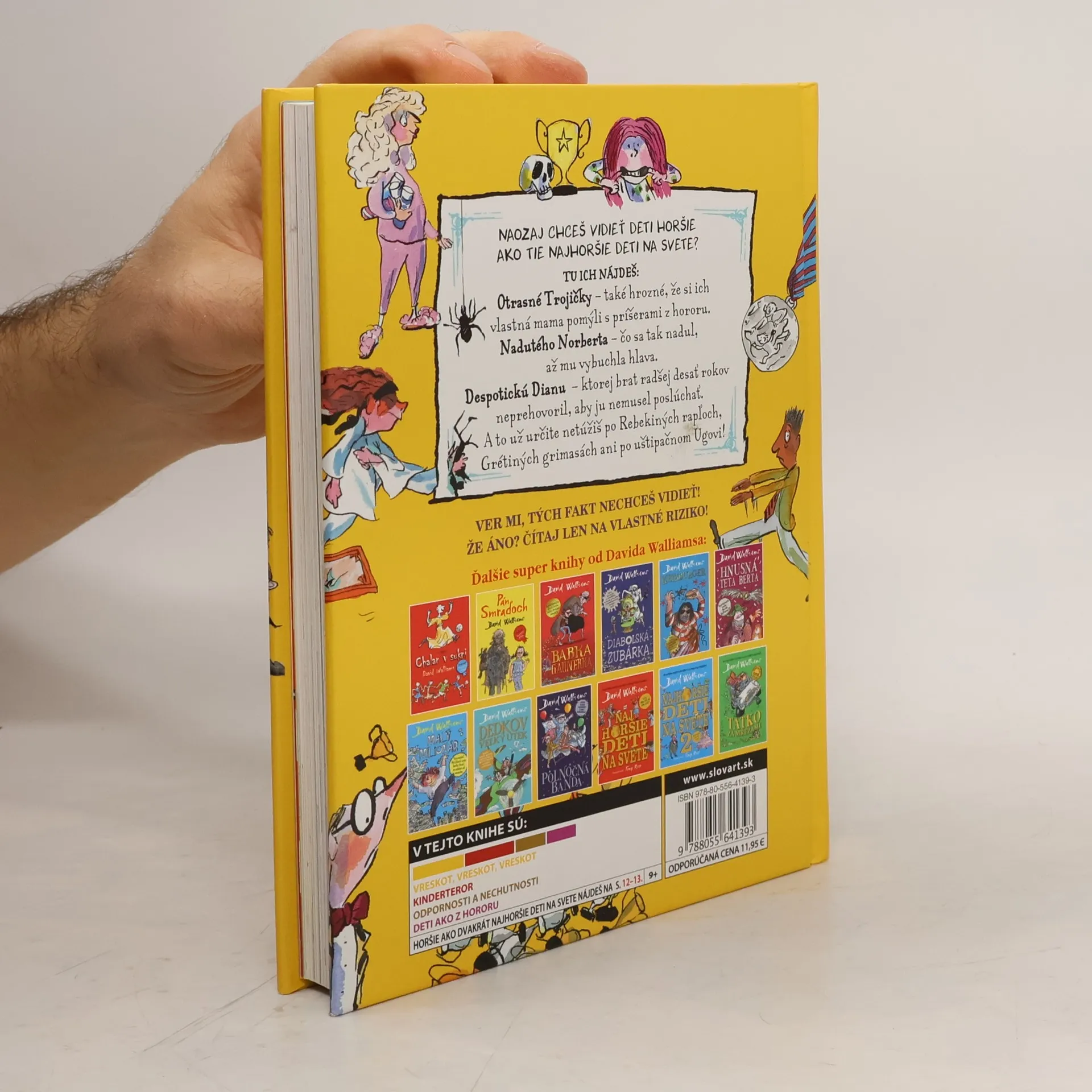 Pozor, pozor! Je tu nová zbierka príšerne vtipných historiek o tých absolútne najväčších beťároch na svete! Keď ste si po prvých dvoch dieloch NAJHORŠÍCH DETÍ NA SVETE mysleli, že vás už nič neprekvapí, najvtipnejší autor detských kníh na celom svete David Walliams prichádza s desiatimi novými odstrašujúcimi príkladmi ešte protivnejších, nadutejších, rozmaznanejších a papuľnatejších detí ako kedykoľvek predtým. Tak, priznajte sa, kto z vás má rovnako za ušami? Farebné ilustrácie v tejto poburujúcej knihe vám určite pomôžu ľahšie si týchto nespratníkov predstaviť.