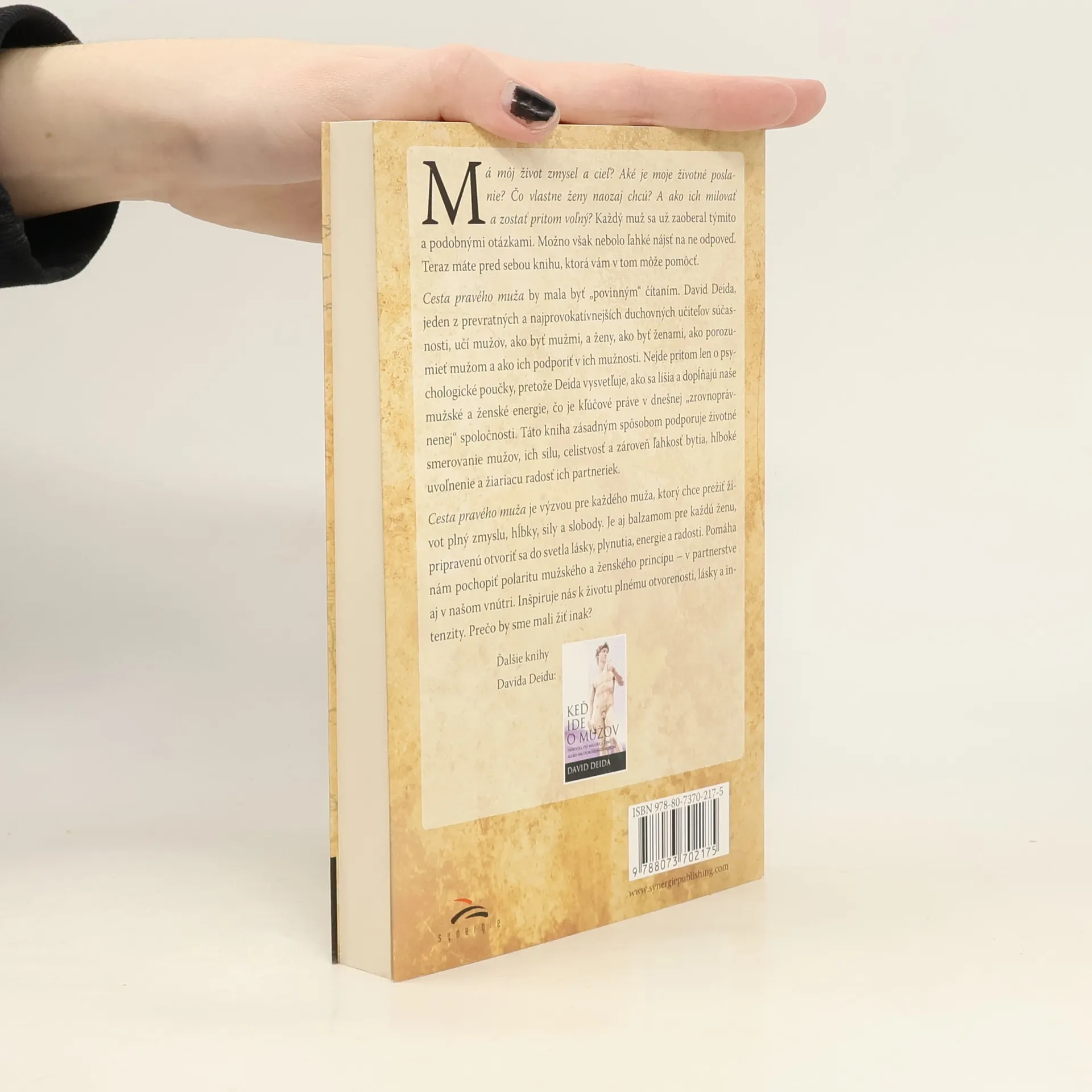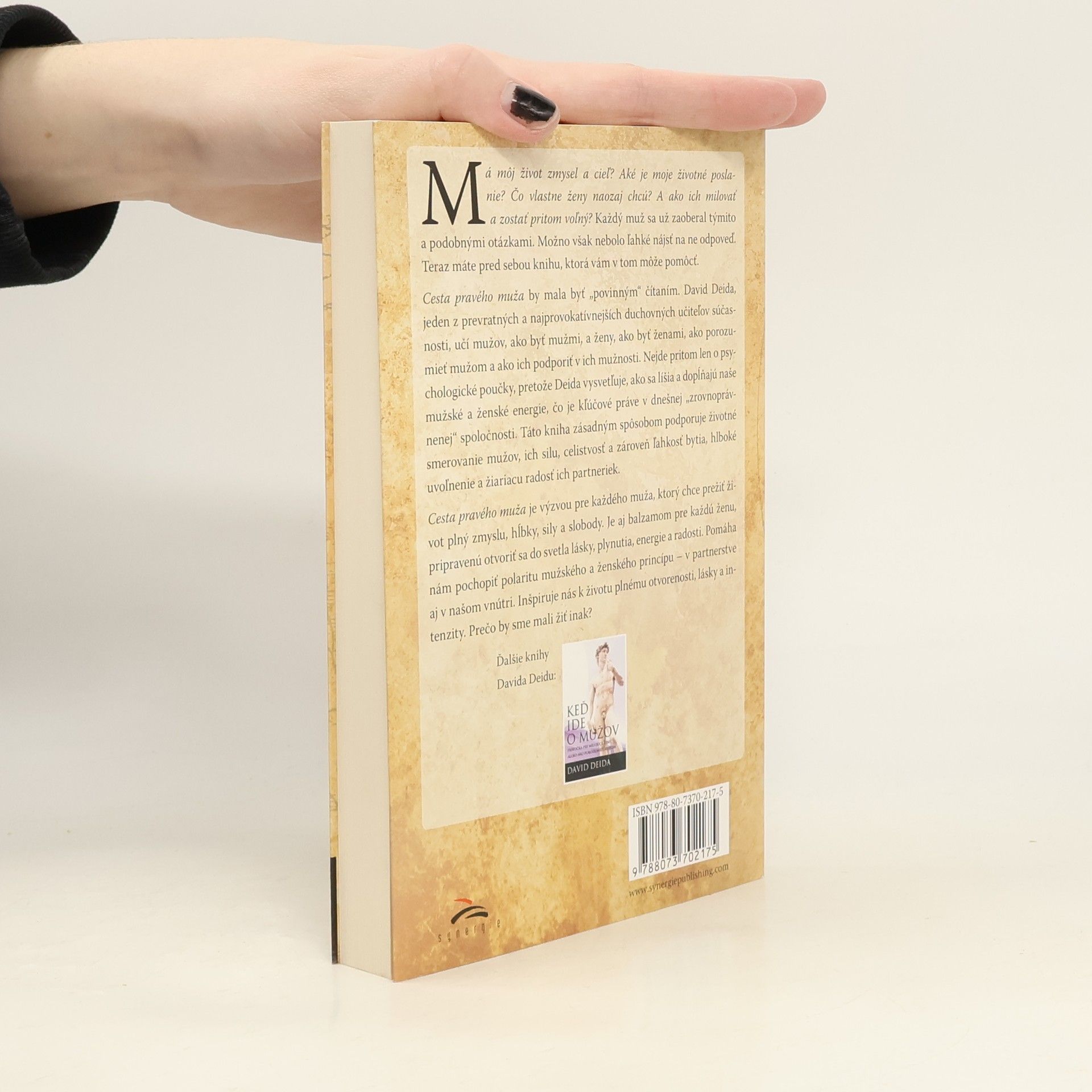 Má můj život smysl a cíl? Jaké je moje životní poslání? Co vlastně ženy doopravdy chtějí? A jak je milovat a zůstat při tom volný? Těmito a podobnými otázkami se již někdy zaobíral každý muž. Možná ale nebylo snadné na ně nalézt odpověď. Nyní před sebou máte knihu, která vám v tom může pomoci. Cesta pravého muže by měla být „povinnou“ četbou. David Deida, jeden z nejpřevratnějších a nejprovokativnějších duchovních učitelů současnosti, učí muže, jak být muži, a ženy, jak být ženami, jak mužům porozumět a jak je v jejich mužství podpořit. Nejde přitom jen o psychologické poučky, neboť Deida vysvětluje, jak se liší a doplňují naše mužské a ženské energie, což je v dnešní „zrovnoprávněné“ společnosti zcela klíčové. Tato kniha zásadním způsobem podporuje životní směrování mužů, jejich sílu a celistvost a zároveň lehkost bytí, hluboké uvolnění a zářící radost jejich partnerek.