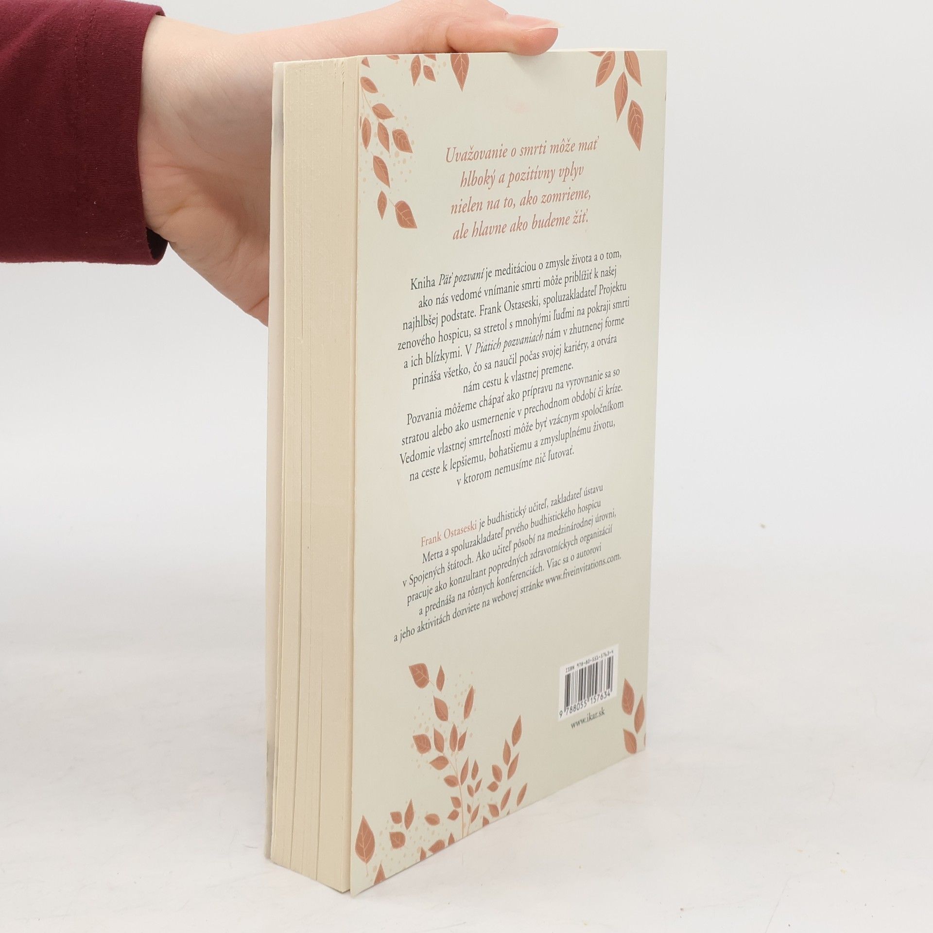 Uvažovanie o smrti môže mať hlboký a pozitívny dopad nielen na to, ako zomrieme, ale hlavne ako budeme žiť. Kniha Päť pozvaní je meditáciou o zmysle života a o tom, ako nás vedomé vnímanie smrti môže priblížiť k našej najhlbšej podstate. Frank Ostaseski, spoluzakladateľ projektu zenového hospicu, sa stretol s mnohými ľuďmi na pokraji smrti a ich blízkymi. V Piatich pozvaniach nám v zhutnenej forme prináša všetko, čo sa naučil počas svojej kariéry a otvára nám cestu k vlastnej premene. Pozvania môžeme chápať ako prípravu na vyrovnanie sa so stratou alebo ako usmernenie v prechodnom období či kríze. Vedomie vlastnej smrteľnosti môže byť vzácnym spoločníkom na ceste k lepšiemu, bohatšiemu a zmysluplnému životu, v ktorom nemusíme nič ľutovať.