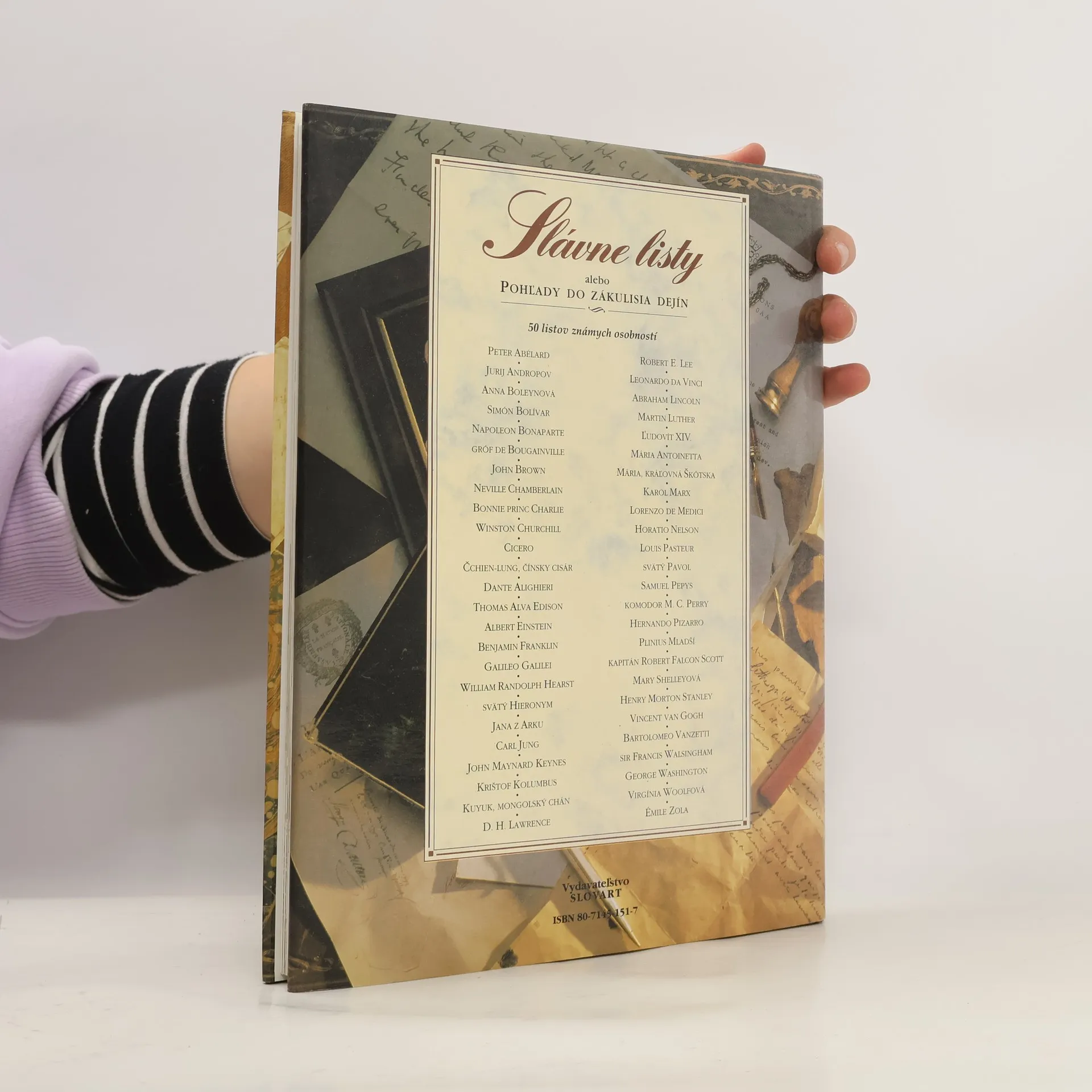 Pohľady do zákulisia dejín-50 listov známych osobností. Obsahuje stretnutia a objavy, ako napríklad Svätého Hieronyma so Eustochiom, mongolského chána Kuyuka s pápežom Inocentom IV., Krištofa Kolumba s Luisom de Santangelom, Hernanda Pizarra s členmi Kráľovskej rady v Santo Domingu, Galilea Galileiho s Belisariom Vintaom, a ďalších významných osobností ako Benjamin Franklin, Louis Pasteur či Albert Einstein. V sekcii autoportréty a obhajoby sú zastúpení Dante, Leonardo da Vinci, Martin Luther, Anna Boleynová, George Washington, Thomas Alva Edison a ďalší, ktorí sa obracajú na blízkych a autority. Politika a výzvy sú reprezentované listami Svätého Pavla, Plinia mladšieho, Jany z Arcu, Ľudovíta XIV., Napoleona Bonaparteho, Karola Marxa a Winstona Churchilla, ktorí sa vyjadrujú k dôležitým historickým momentom. Témy lásky, smrti a priateľstva sú prítomné v listoch Cicera, Abélarda, Márii, kráľovnej škótskej, Horatia Nelsona, Mary Shelleyovej, Abrahama Lincolna a Vincenta Van Gogha, pričom každý z nich ponúka unikátne pohľady na osobné a emocionálne aspekty svojich životov.