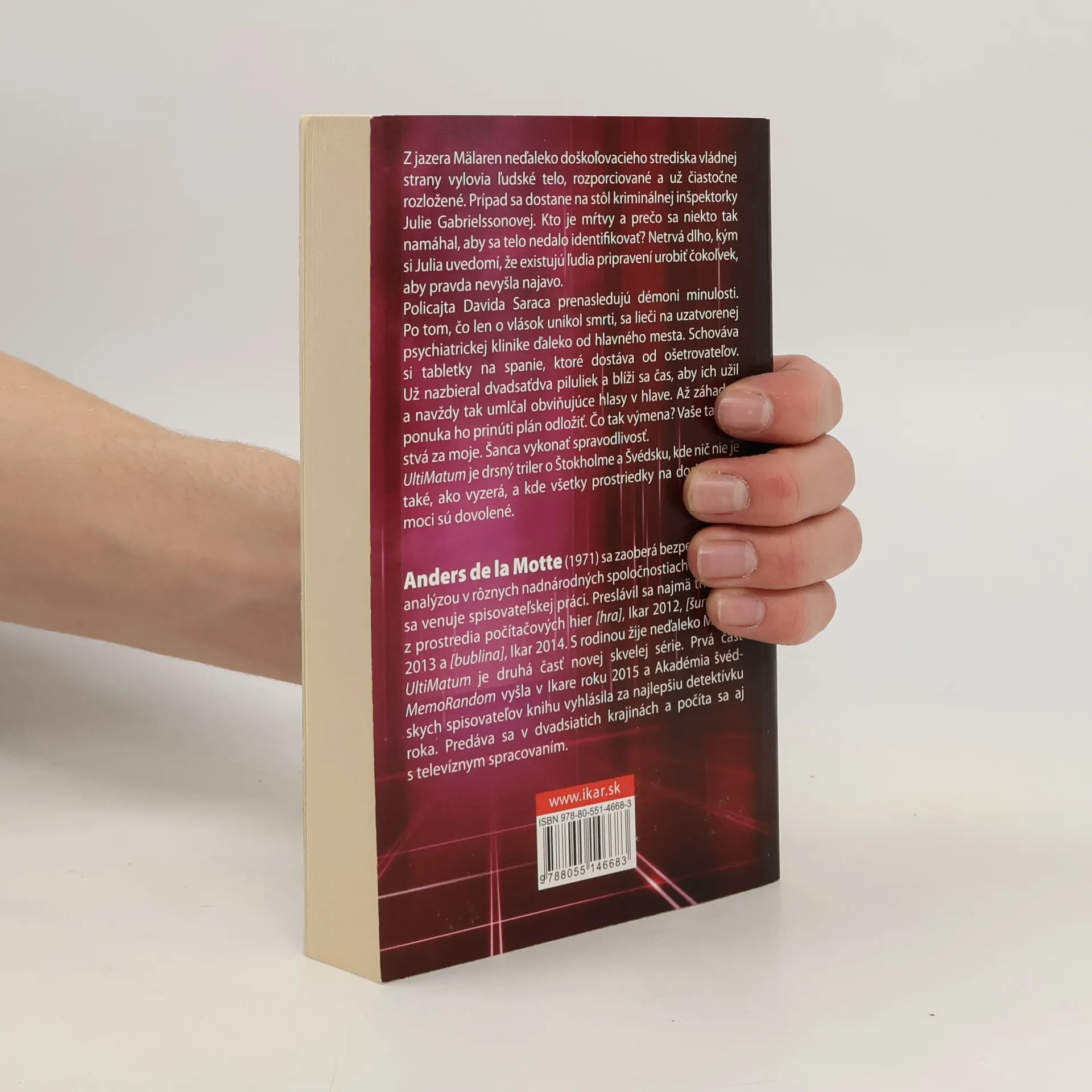 Chce len jedinú vec. Všetko, čo máš. Z jazera Mälaren neďaleko doškoľovacieho strediska vládnej strany vylovia ľudské telo, rozporciované a už čiastočne rozložené. Prípad sa dostane na stôl kriminálnej inšpektorky Julie Gabrielssonovej. Kto je mŕtvy a prečo sa niekto tak namáhal, aby sa telo nedalo identifikovať? Netrvá dlho, kým si Julia uvedomí, že existujú ľudia pripravení urobiť čokoľvek pre to, aby pravda nevyšla najavo. Policajta Davida Saraca prenasledujú démoni minulosti. Po tom, čo len o vlások unikol smrti, sa lieči na uzatvorenej psychiatrickej klinike ďaleko od hlavného mesta. Schováva si tabletky na spanie, ktoré dostáva od ošetrovateľov. Už nazbieral dvadsaťdva piluliek a blíži sa čas, aby ich užil a navždy tak umlčal obviňujúce hlasy v hlave. Až záhadná ponuka ho prinúti plán odložiť. Čo tak výmena? Vaše tajomstvá za moje. Šanca vykonať spravodlivosť. UltiMatum je drsný triler o Štokholme a Švédsku, kde nič nie je také, ako vyzerá, a kde všetky prostriedky na dosiahnutie moci sú dovolené.