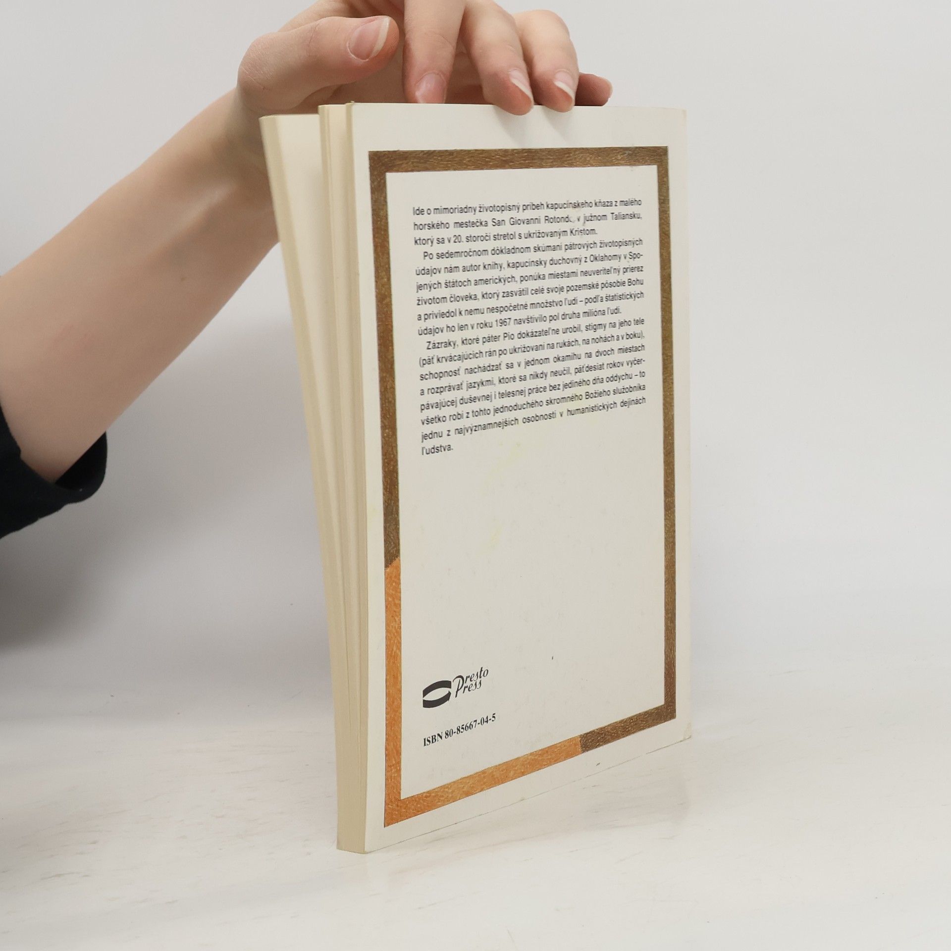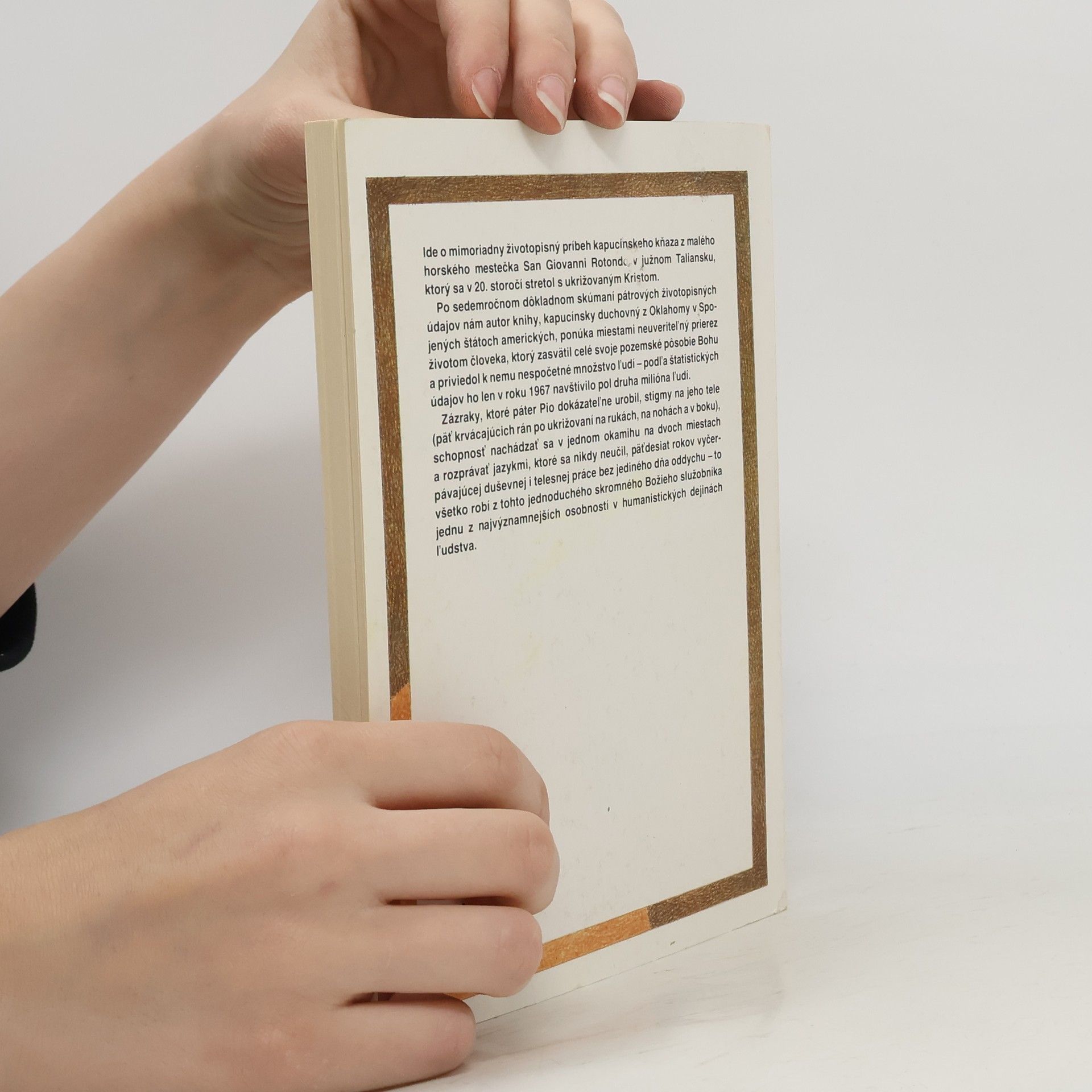 Ide o mimoriadny životopisný príbeh kapucínskeho kňaza z malého horského mestečka San Giovanni Rotondo v južnom Taliansku, ktorý sa v 20. storočí stretol s ukrižovaným Kristom. Po sedemročnom dôkladnom skúmaní pátrových životopisných údajov nám autor knihy, kapucínsky duchovný z Oklahomy v Spojených štátoch amerických, ponúka miestami neuveriteľný prierez životom človeka, ktorý zasvätil celé svoje pozemské pôsobie Bohu a priviedol k nemu nespočetné množstvo ľudí - podľa štatistických údajov ho len v roku 1967 navštívilo pol druha milióna ľudí. Zázraky, ktoré páter Pio dokázateľne urobil, stigmy na jeho tele (päť krvácajúcich rán po ukrižovaní na rukách, na nohách a v boku), schopnosť nachádzať sa v jednom okamihu na dvoch miestach a rozprávať jazykmi, ktoré sa nikdy neučil, päťdesiat rokov vyčerpávajúcej duševnej i telesnej práce bez jediného dňa oddychu - to všetko robí z tohto jednoduchého skromného Božieho služobníka jednu z najvýznamnejších osobnosti v humanistických dejinách ľudstva.