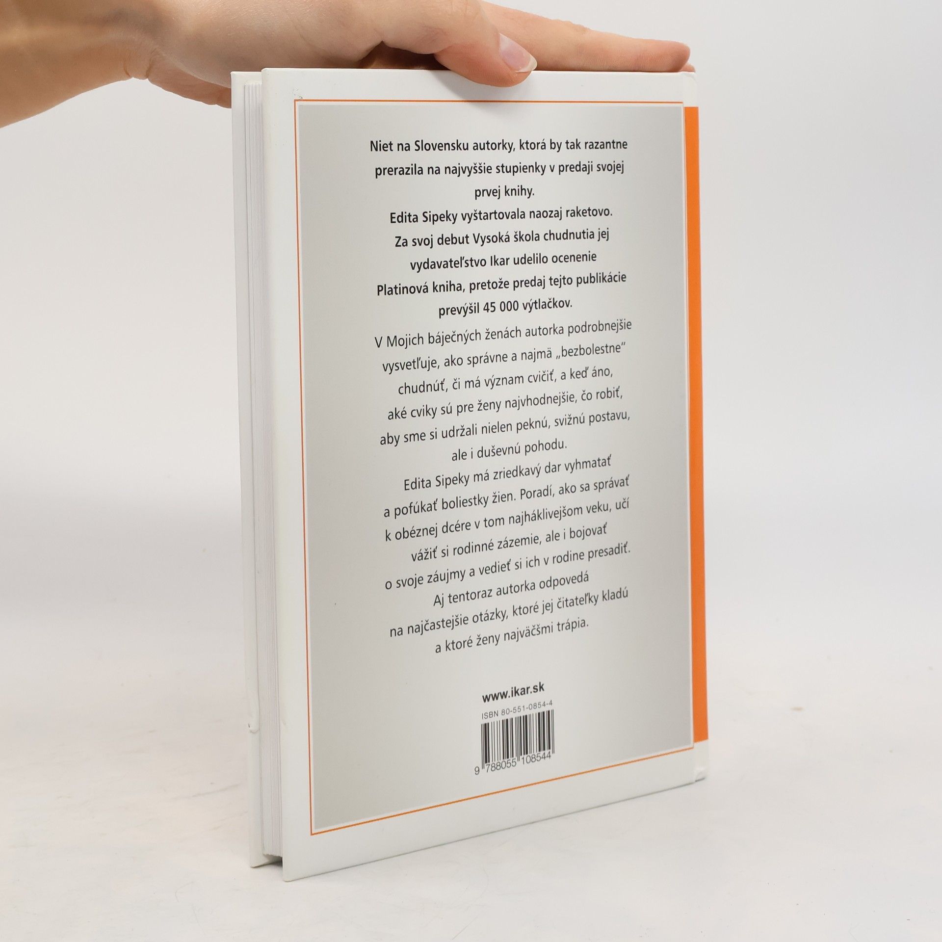 Autorka podrobnejšie vysvetľuje, ako správne a najmä „bezbolestne“ chudnúť, či má význam cvičiť, a keď áno, aké cviky sú pre ženy najvhodnejšie, čo robiť, aby sme si udržali nielen peknú, svižnú postavu, ale i duševnú pohodu. Edita Sipeky má zriedkavý dar vyhmatať a pofúkať boliestky žien. Poradí, ako sa správať k obéznej dcére v tom najháklivejšom veku, učí vážiť si rodinné zázemie, ale i bojovať o svoje záujmy a vedieť si ich v rodine presadiť. Aj tentoraz autorka odpovedá na najčastejšie otázky, ktoré jej čitateľky kladú, a ktoré ženy najväčšmi trápia.