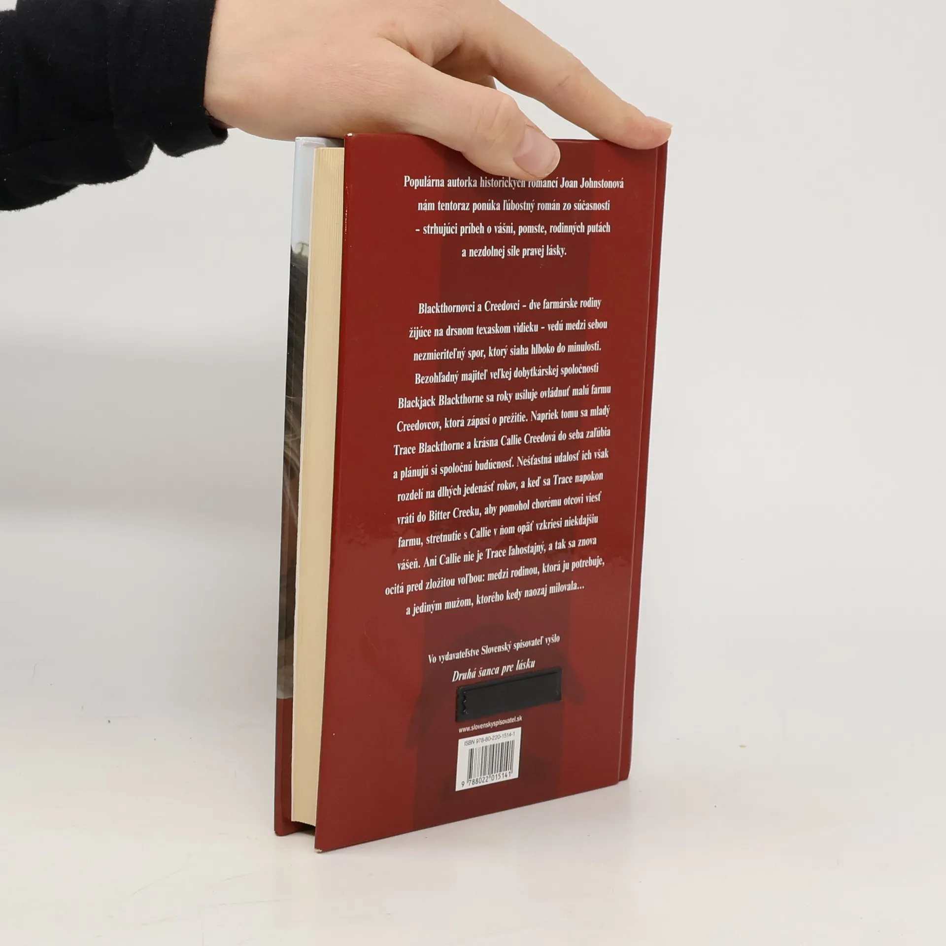 Strhujúci ľúbostný román populárnej americkej autorky sa odohráva na drsnom texaskom vidieku, kde dve farmárske rodiny dlhé roky vedú medzi sebou nezmieriteľný spor. Napriek tomu sa mladý Trace Blackthorne a krásna Callie Creedová do seba zaľúbia a plánujú si spoločnú budúcnosť.