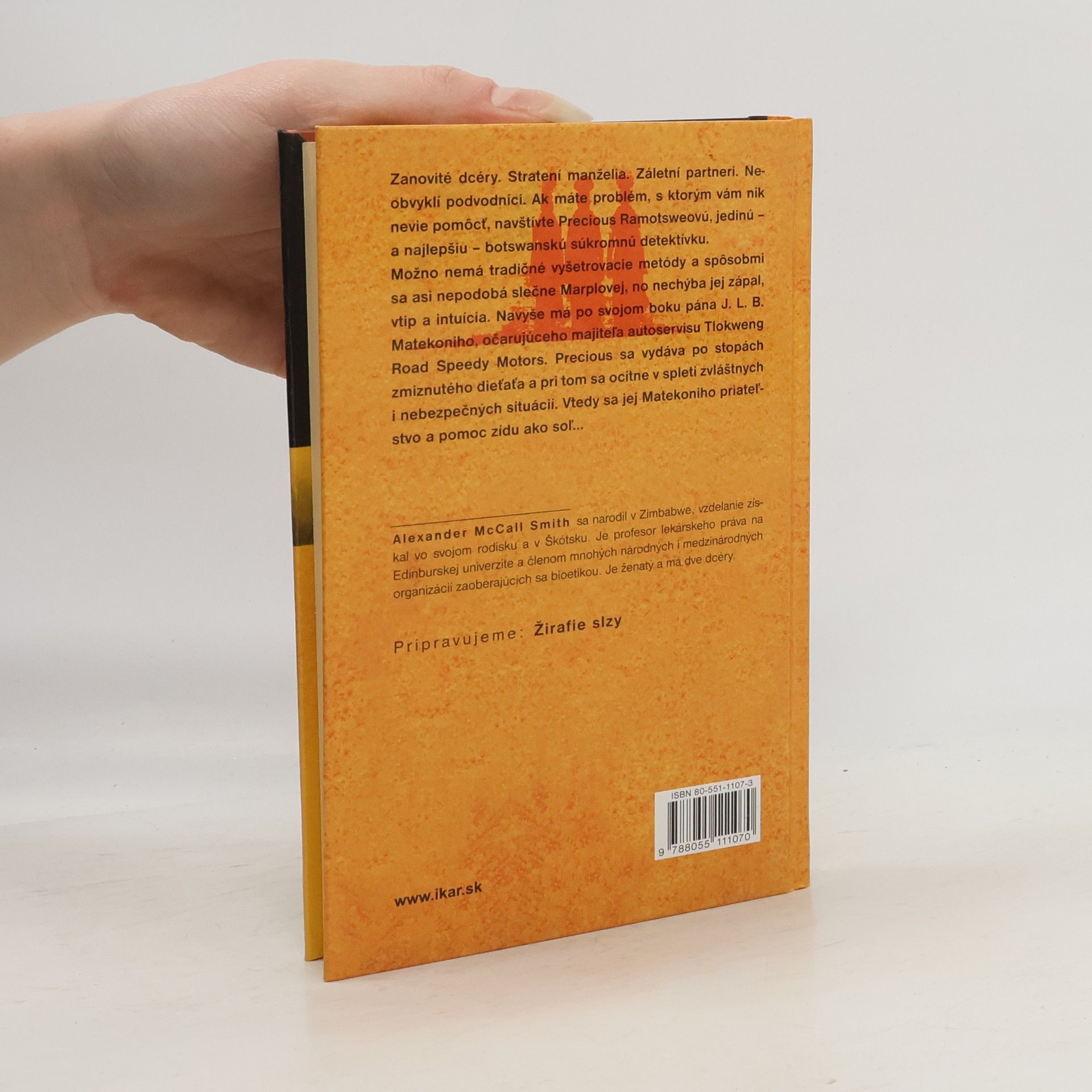 Zanovité dcéry. Stratení manželia. Záletní partneri. Neobvyklí podvodníci. Ak máte problém, s ktorým vám nik nevie pomôcť, navštívte Precious Ramotsweovú, jedinú – a najlepšiu – botswanskú súkromnú detektívku. Možno nemá tradičné vyšetrovacie metódy a spôsobmi sa asi nepodobá slečne Marplovej, no nechýba jej zápal, vtip a intuícia. Navyše má po svojom boku pána J. L. B. Matekoniho, očarujúceho majiteľa autoservisu Tlokweng Road Speedy Motors. Precious sa vydáva po stopách zmiznutého dieťaťa a pri tom sa ocitne v spleti zvláštnych i nebezpečných situácií. Vtedy sa jej Matekoniho priateľstvo a pomoc zídu ako soľ.