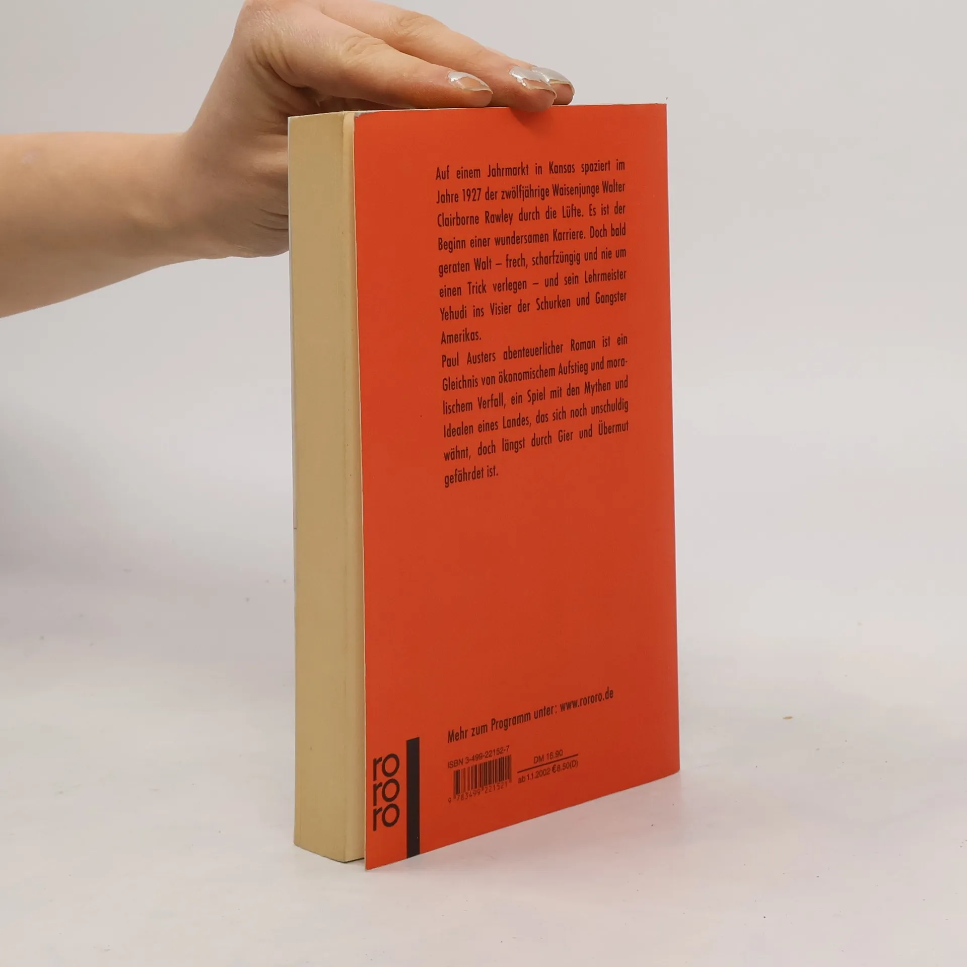 Auf einem Jahrmarkt in Kansas spaziert im Jahre 1927 der zwölfjährige Waisenjunge Walter Clairborne Rawley durch die Lüfte. Es ist der Beginn einer wundersamen Karriere. Doch bald geraten Walter - frech, scharfzüngig und nie um einen Trick verlegen - und sein Lehrmeister Yehudi ins Visier der Schurken und Gangster Amerikas.Paul Austers abenteuerlicher Roman ist ein Gleichnis von ökonoischem Aufstieg und moralischem Verfall, ein Spiel mit den Mythen und Idealen eines Landes, das sich noch unschuldig wähnt, doch längst durch Gier und Übermut gefährdet ist.