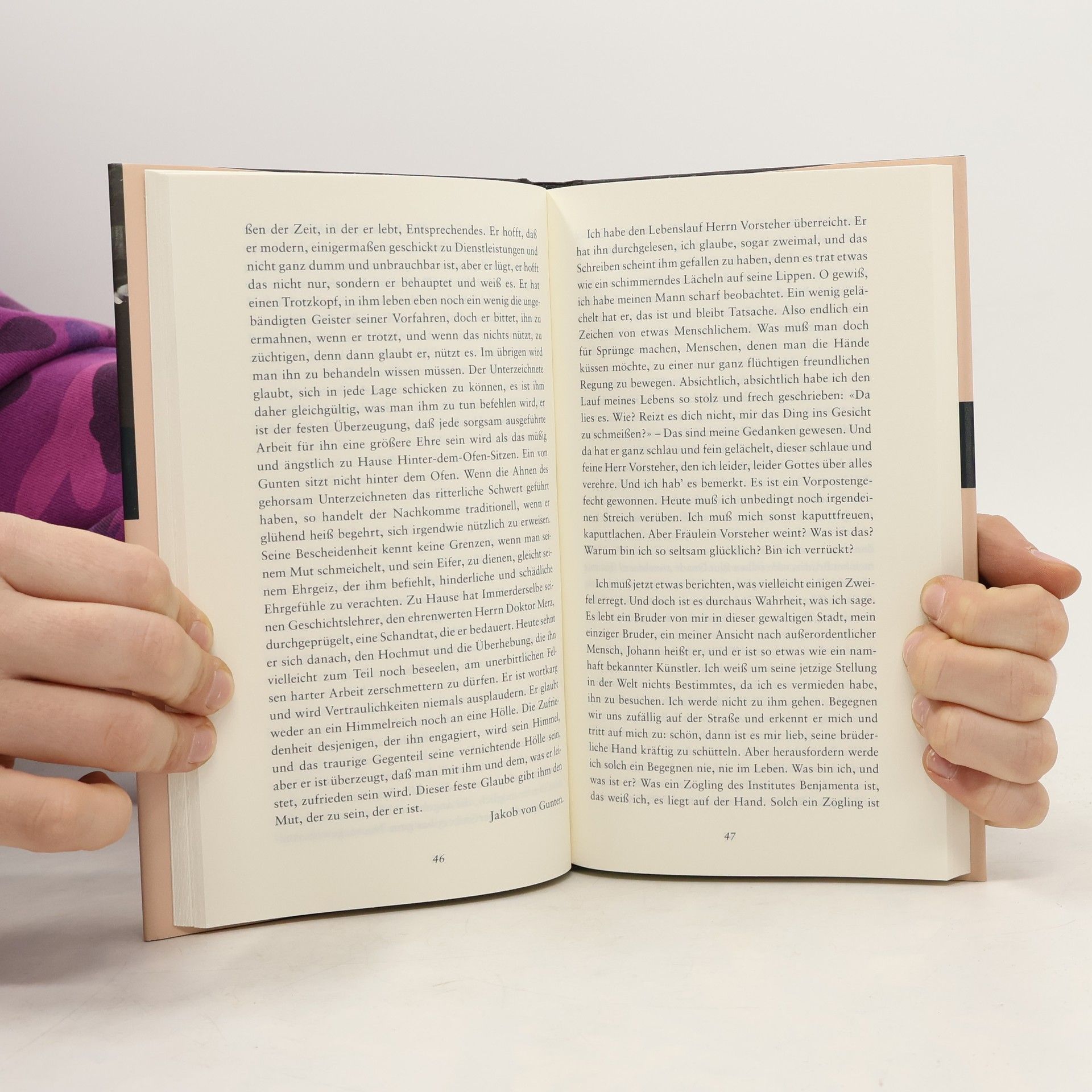 Jakob von Gunten ist der dritte und avantgardistischste Roman Walsers, verfasst 1908 in Berlin. Der Autor übertrug das Milieu seiner Dienerschule auf das Knabeninstitut Benjamenta. Für Robert Walser war dieser Roman der liebste, und Walter Benjamin beschrieb ihn als “eine ganz ungewöhnliche zarte Geschichte” über die Stimmung des genesenden Lebens. Im Verlauf des Buches stellt Jakob häufig Fragen zu seinem Leben und seiner Existenz. Doch im Institut entwickelt er sich so, dass er in den letzten Kapiteln nicht mehr über sich nachdenkt; sein Gedankenleben scheint zu verschwinden. Er fühlt, dass das Leben “Wallungen verlangt, nicht Überlegungen.” Diese gedankenlose Haltung führt zu einer Gleichgültigkeit, die in den ersten Kapiteln nicht vorhanden war. Jakob glaubt, dass Gott ihn begleiten wird, wenn er nach dem Institut einen neuen Weg einschlägt. Während seines Aufenthalts stand er unter der Obhut des Herrn Vorstehers. Als das Institut dem Ende zuneigt, sucht Jakob in Gott einen Ersatz. Sein kindlicher Traum vom Herrn Vorsteher in Rüstung wirft die Frage auf, ob er sich wirklich weiterentwickelt hat. Letztlich akzeptiert Jakob, eine “kugelrunde Null” zu sein, und erkennt, dass er niemals viel erreichen wird. Gleichzeitig deutet der Ausspruch des Herrn Vorstehers auf kulturkritische Aspekte hin, die die moderne Zeit reflektieren. Das Institut selbst stellt eine Abgrenzung zur modernen Kultur dar und erinnert an ein christliches