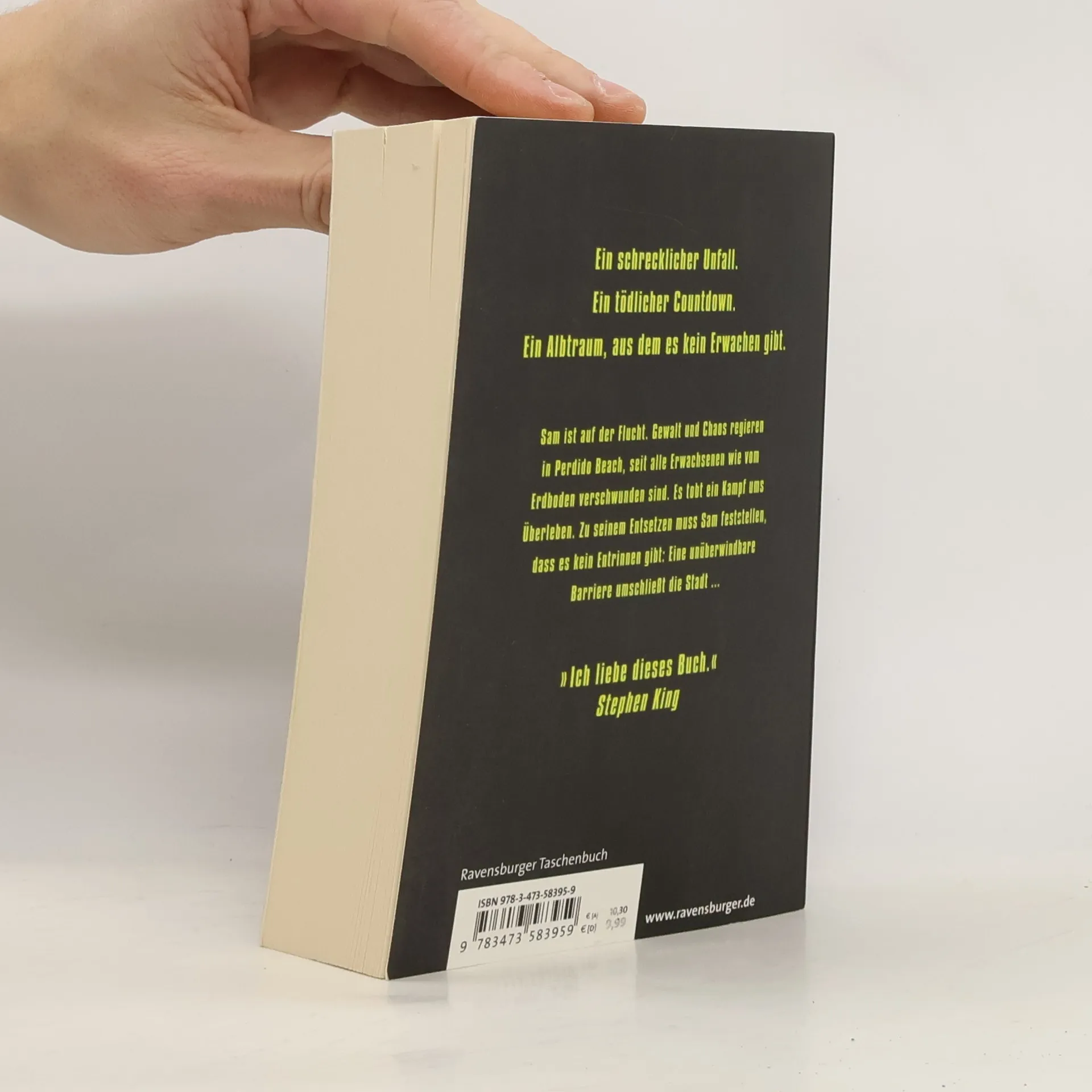 Das Leben in der beschaulichen Kleinstadt Perdido Beach wird für Sam und seine Freunde zum Albtraum: Plötzlich verschwinden alle Bewohner spurlos, die älter als fünfzehn Jahre sind. Eine gigantische Mauer umschließt die Stadt. Es gibt kein Entrinnen, nur die nackte Angst, denn schon bald ziehen marodierende Banden durch die Straßen. Ein erbitterter Kampf ums Überleben beginnt - und ein Kampf gegen die Zeit: Sam wird in 299 Stunden selbst fünfzehn ...