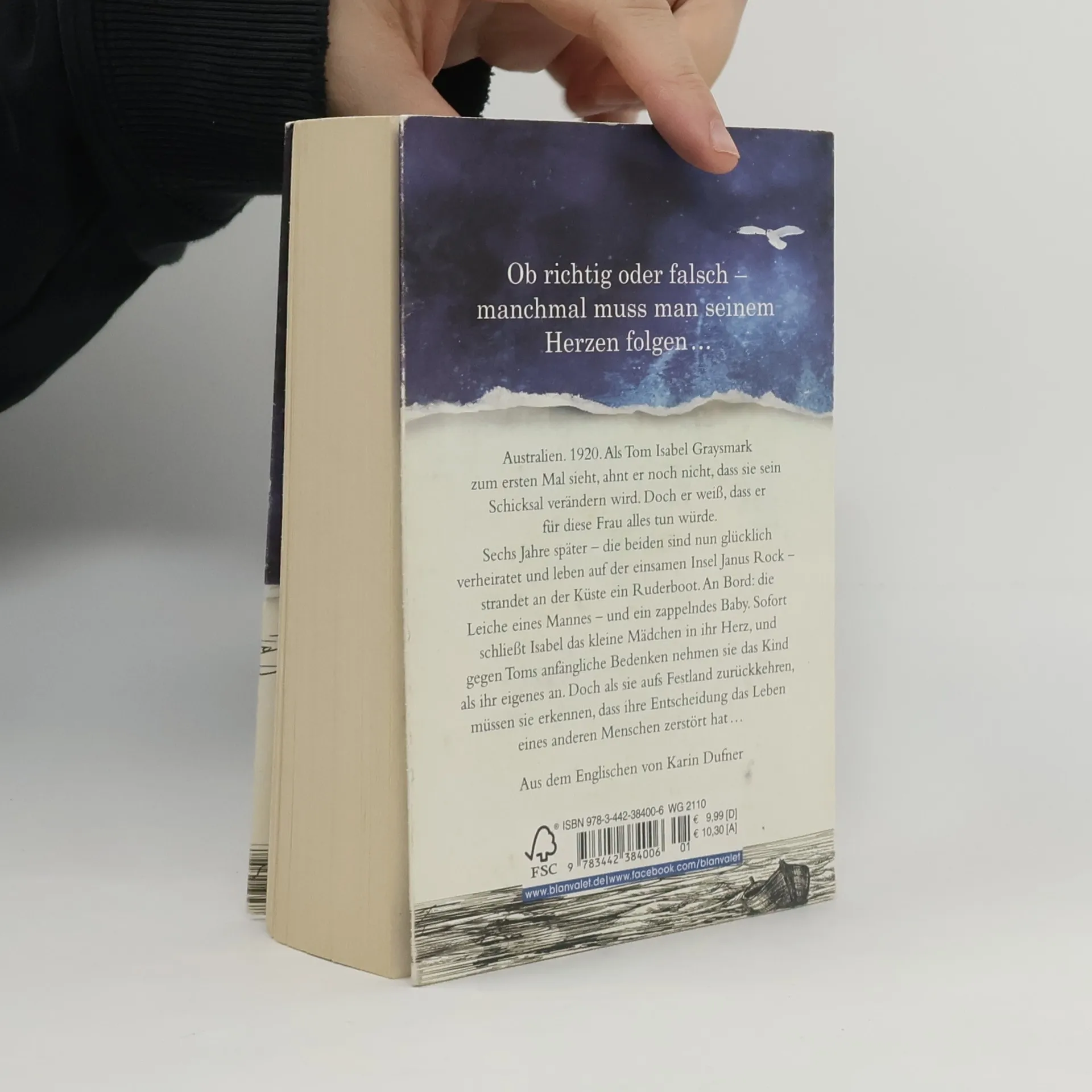 Eine Liebe so unendlich wie das Meer … Australien. 1920. Als Tom Isabel zum ersten Mal sieht, ahnt er noch nicht, dass sie sein Schicksal verändern wird. Doch er weiß, dass er für diese Frau alles tun würde. Sechs Jahre später – die beiden sind nun glücklich verheiratet und leben auf der einsamen Insel Janus Rock – strandet an der Küste ein Ruderboot. An Bord: die Leiche eines Mannes – und ein zappelndes Baby. Sofort schließt Isabel das kleine Mädchen in ihr Herz, und gegen Toms anfängliche Bedenken nehmen sie das Kind als ihr eigenes an. Doch als sie aufs Festland zurückkehren, müssen sie erkennen, dass ihre Entscheidung das Leben eines anderen Menschen zerstört hat …