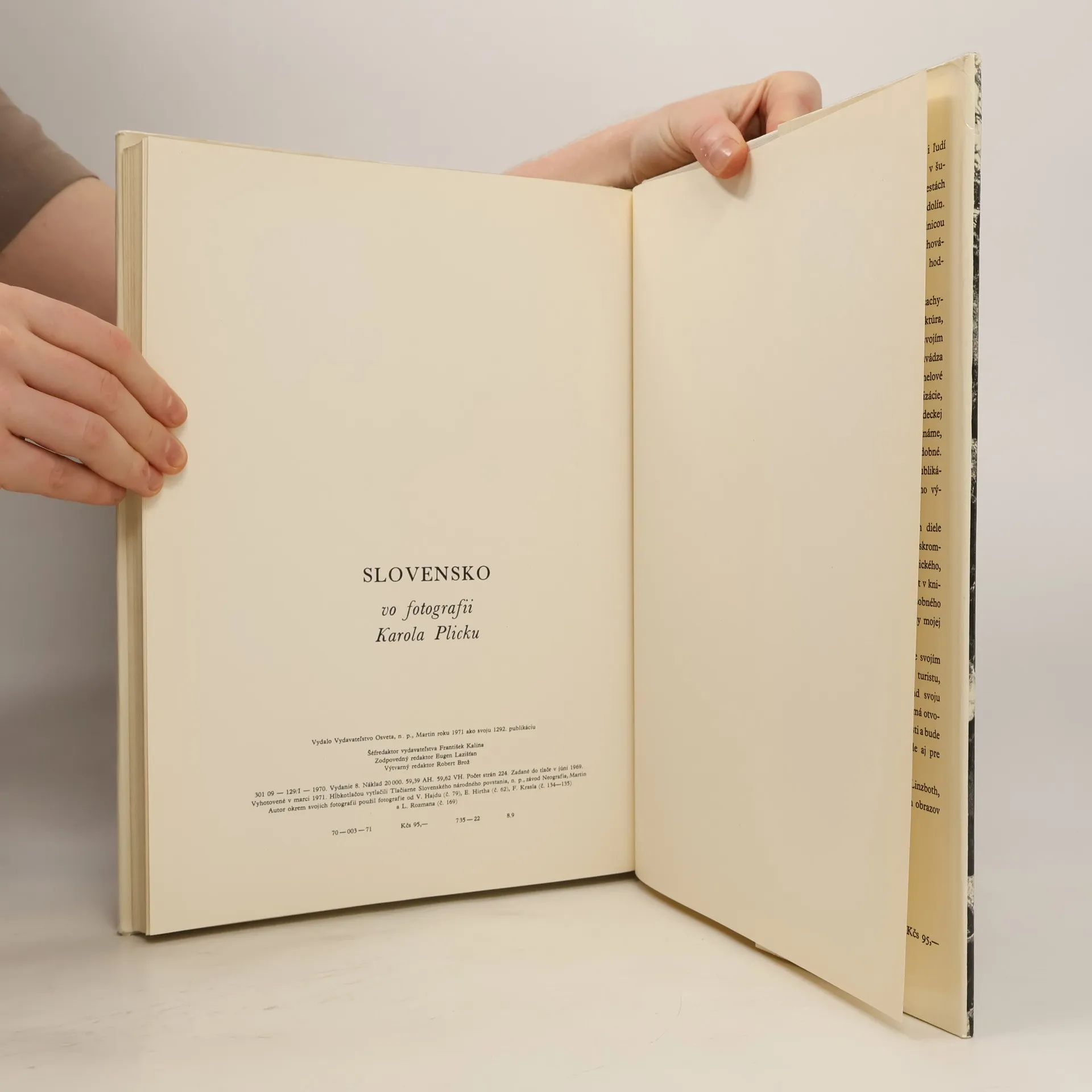 Fotografie Karola Plicky, které sám pro tuhle publikaci vybral a mapuje Slovensko těch časů - Celkem 224 hnědobílých celostránkových fotografií (snímok) - dokonale reprodukované čarovné Plickové fotografické zábery. - Kníha je pokladnicou umenia minulosti, pokladnicou živých i zabúdaných tradícií ľudových, uchovávateľom rázovitých typov slovenských ľudí. Je vznešeným, hymnickým spevom Slovenska. prvé vydanie, 620 Kčs.