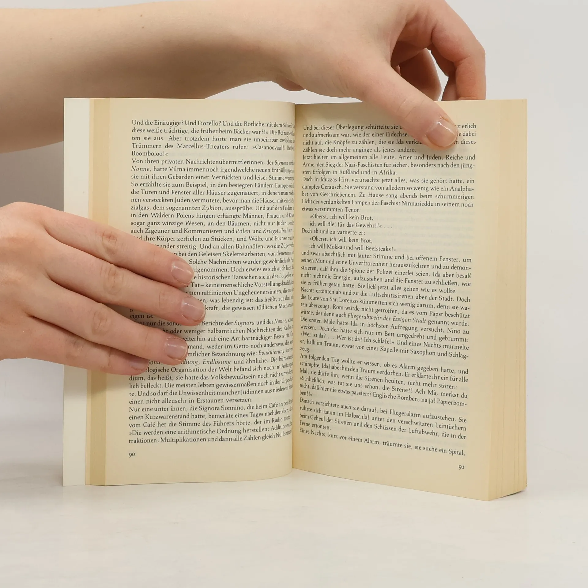 In Rom erlebt die verwitwete Lehrerin Ida mit ihren beiden Söhnen den Faschismus, die Verfolgung der Juden, den Krieg und die Nachkriegszeit. Nino, der Ältere, entwickelt sich vom halbwüchsigen Gauner zum Partisanen. Und Giuseppe, der zweitgeborene Sohn, ist auch kein gewöhnliches Kind. Elsa Morante entwirft ein dichtes Fresko der Stadt Rom und ihrer Menschen, der Kleinbürger, Partisanen und Anarchisten. '›La Storia‹ ist der aufwühlendste, humanste und vielleicht wirklich der größte italienische Roman unserer Zeit.' Die Welt