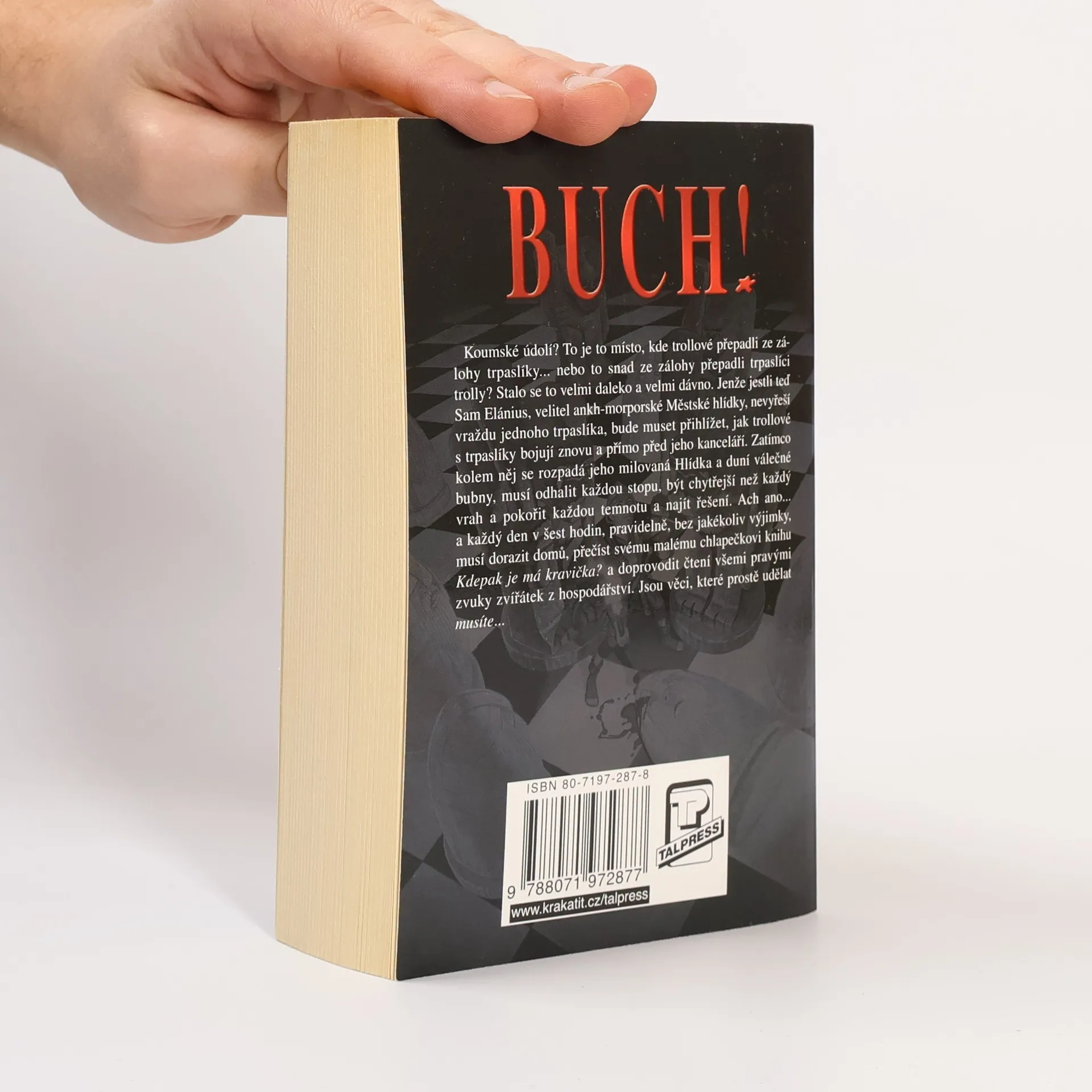 Koumské údolí? To je to místo, kde trollové přepadli ze zálohy trpaslíky... nebo to snad ze zálohy přepadli trpaslíci trolly? Stalo se to velmi daleko a velmi dávno. Jenže jestli teď Sam Elánius, velitel ankh-morporské městské hlídky, nevyřeší vraždu jednoho trpaslíka, bude muset přihlížet, jak trollové s trpaslíky bojují znovu a přímo před jeho kanceláří. Zatímco kolem něj se rozpadá jeho milovaná Hlídka a duní válečné bubny, musí odhalit každou stopu, být chytřejší než každý vrah a pokořit každou temnotu a najít řešení. Ach ano... a každý den v šest hodin, pravidelně, bez jakékoliv výjimky, musí dorazit domů, přečíst svému malému chlapečkovi knihu Kampak se poděla má kravička? A doprovodit čtení všemi pravými zvuky zvířátek z hospodářství. Jsou věci, které prostě udělat musíte.
