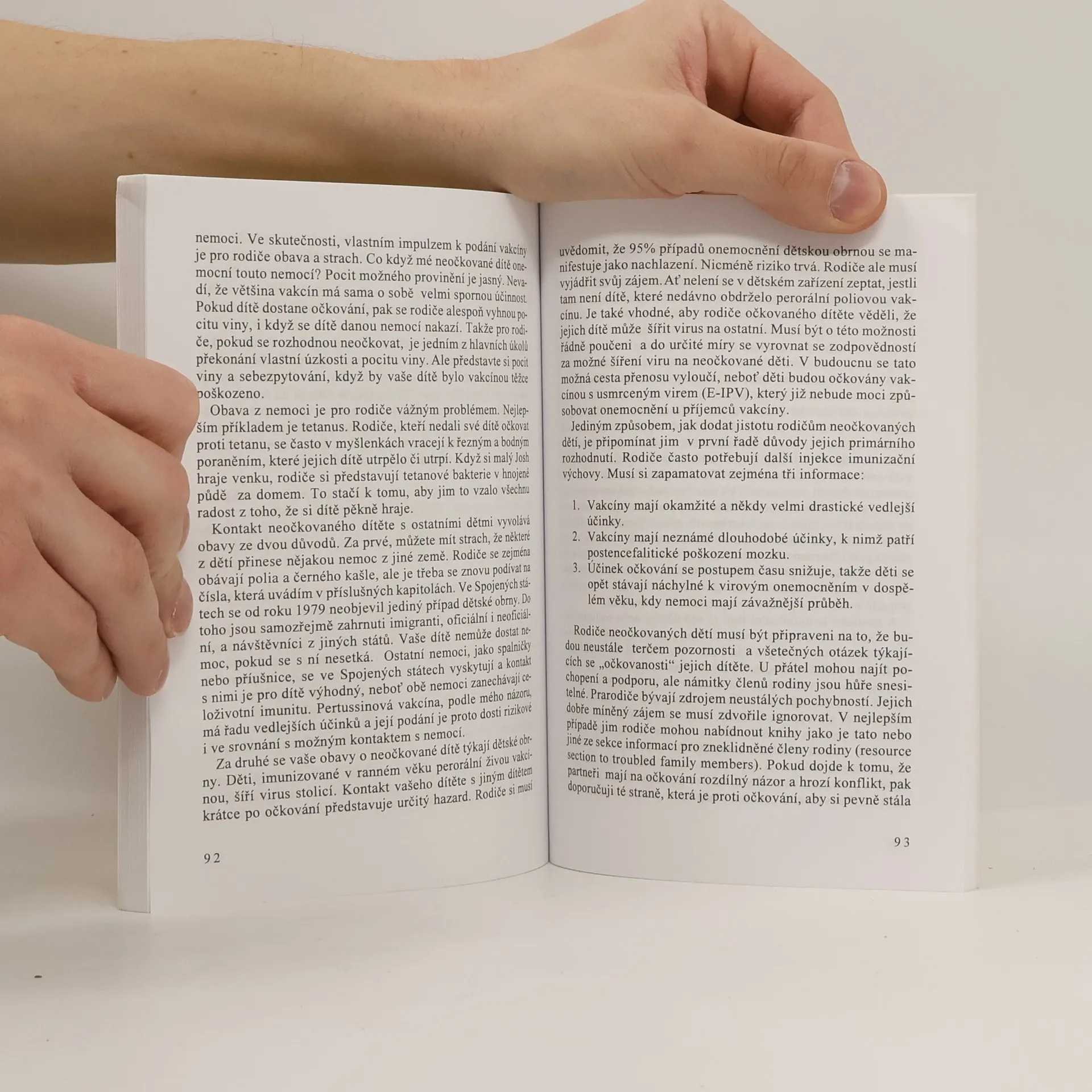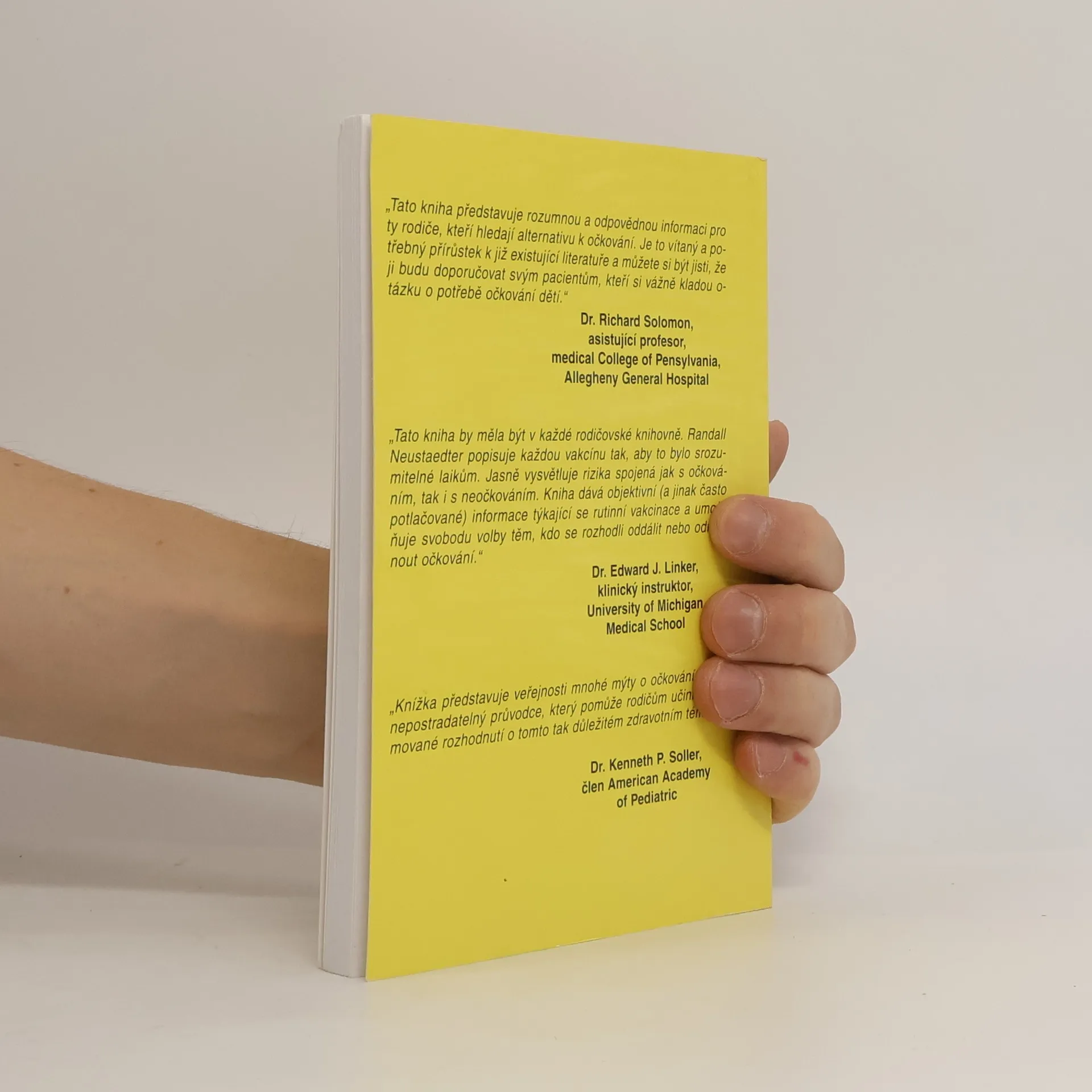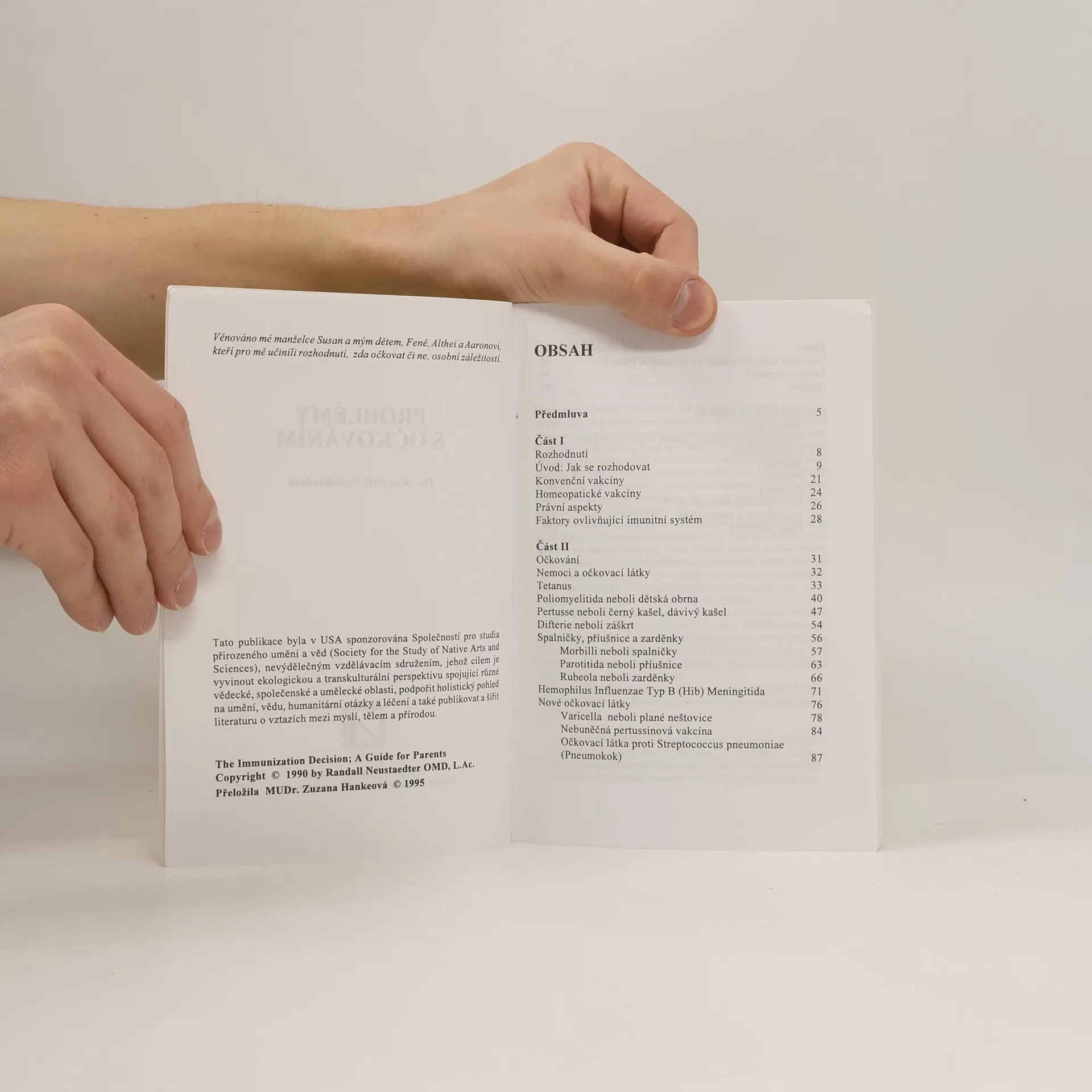 Autor je doktor orientální medicíny (OMD) a v této stručné příručce dává návod podle čeho volit jednotlivá očkování, v krátkosti se zabývá jednotlivými infekčními nemocemi, jejich komplikacemi, účinností očkovací látky a reakcemi na ni. Kniha je z roku 1995 a jako první v češtiněse v ní objevily informace o vedlejších účincích vakcín, některé údaje o očkovacích látkách mohou být zastaralé. Záměr autora je poskytnout rodičům prvotní informace k tomu, aby mohli sami zvolit, co je pro jejich dítě nejlepší.