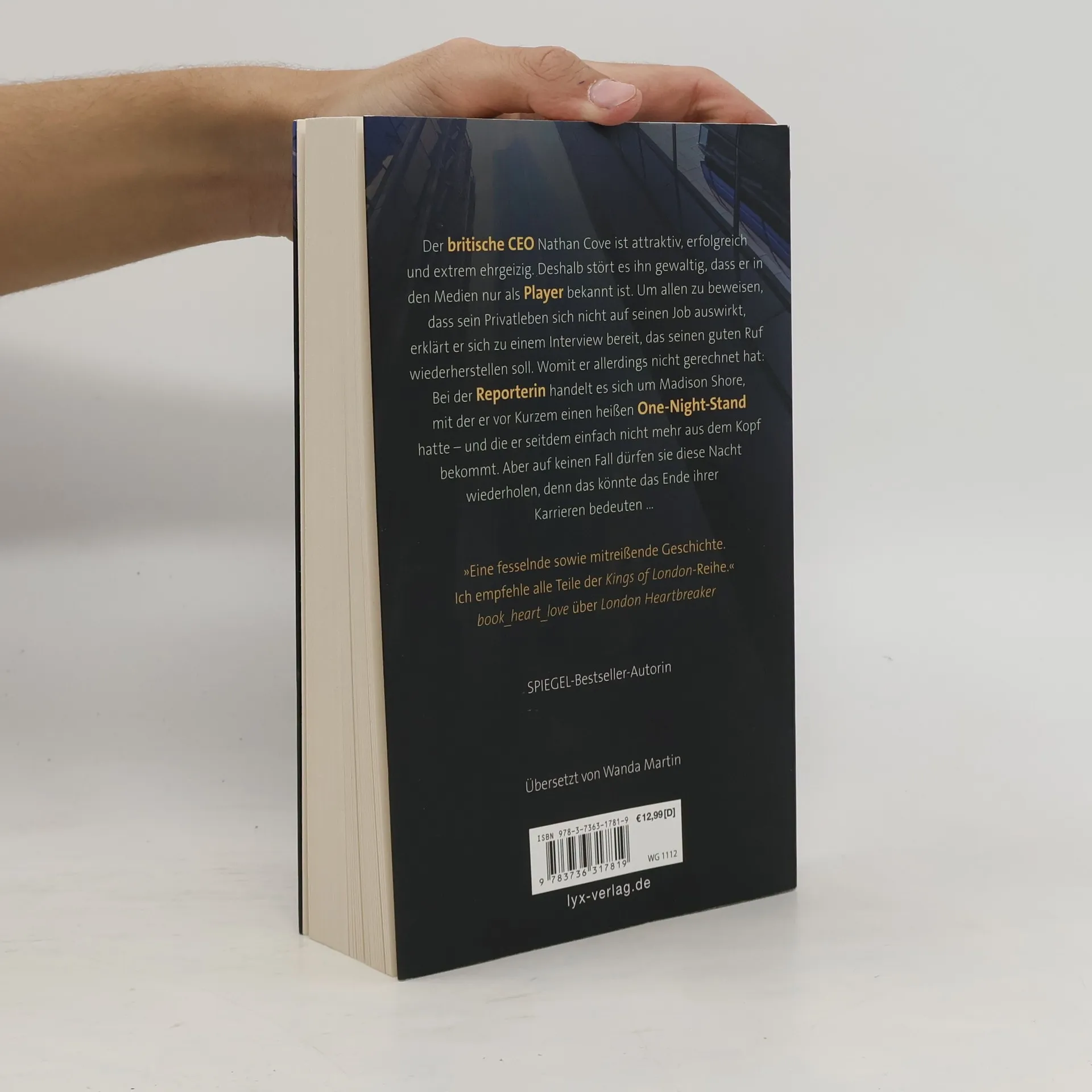 Die LYX-Leser: innen lieben die KINGS OF LONDON ! Der britische CEO Nathan Cove ist attraktiv, erfolgreich und extrem ehrgeizig. Deshalb stört es ihn gewaltig, dass er in den Medien nur als Player bekannt ist. Um allen zu beweisen, dass sein Privatleben sich nicht auf seinen Job auswirkt, erklärt er sich zu einem Interview bereit, das seinen guten Ruf wiederherstellen soll. Womit er allerdings nicht gerechnet hat: Bei der Reporterin handelt es sich um Madison Shore, mit der er vor Kurzem einen heißen One-Night-Stand hatte - und die er seitdem einfach nicht mehr aus dem Kopf bekommt. Aber auf keinen Fall dürfen sie diese Nacht wiederholen, denn das könnte das Ende ihrer Karrieren bedeuten ... „Eine fesselnde sowie mitreißende Geschichte. Ich empfehle alle Teile der KINGS OF LONDON -Reihe.“ BOOK_HEART_LOVE über LONDON HEARTBREAKER Fünfter Band der KINGS-OF-LONDON -Reihe