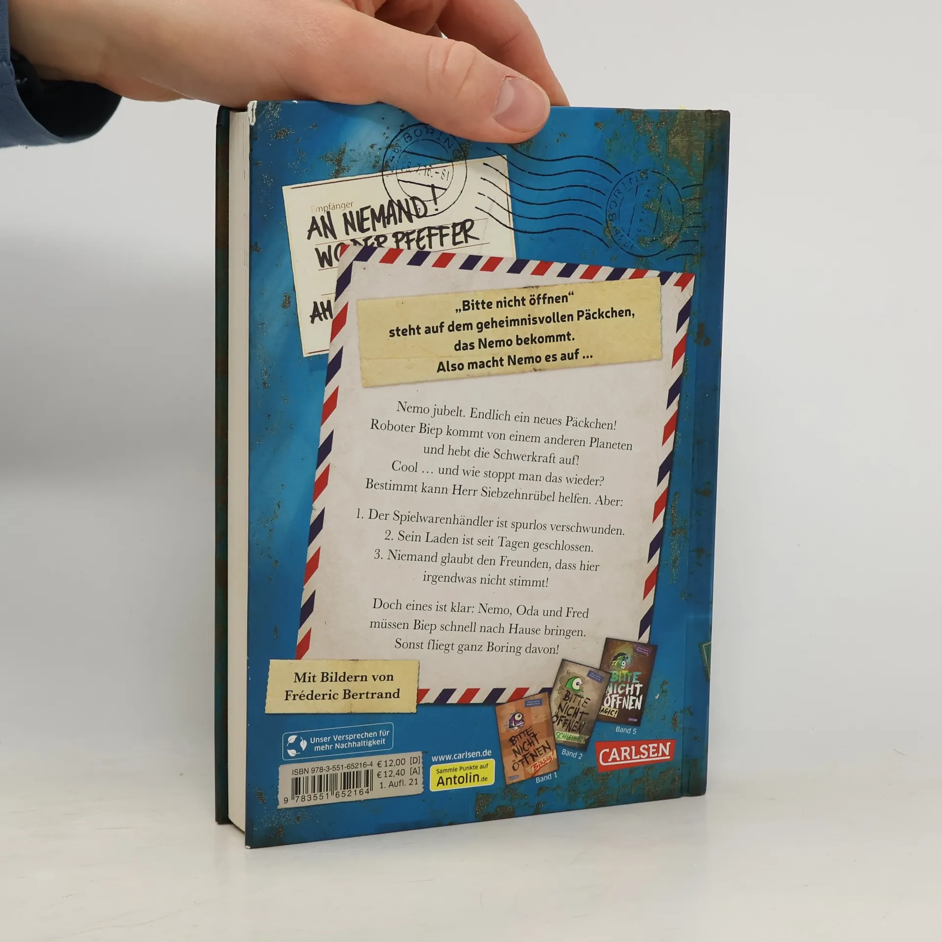 Was hat rote Augen und eine rostige Rüstung aus Blech? Nemos neue Monsterpost! Endlich ein neues Päckchen! Nemo wäre fast gestorben vor Langeweile. Aber damit ist es jetzt vorbei: Kaum ist der kleine Roboter Biep ausgepackt, beginnt alles zu schweben. Die Freunde müssen blitzschnell rauskriegen, wem Biep gehört, bevor die ganze Kleinstadt davonfliegt. Da kann nur noch Herr Siebzehnrübel helfen. Doch wo steckt der Spielzeughändler? In seinem Laden ist er jedenfalls nicht. Wenn Spielzeug plötzlich lebendig wird Nemo und seine Freunde Oda und Fred bekommen immer wieder seltsame Pakete zugeschickt. Eigentlich dürfen sie die Päckchen gar nicht öffnen, aber sie machen es trotzdem – mit katastrophalen Folgen! Denn aus jedem Paket springt ein Wesen, das nach Hause will. Quicklebendig, riesengroß und selten hilfreich. Die Buchreihe „Bitte nicht öffnen“: Geheimnisvolle Pakete, urkomische Figuren und spannende Abenteuer: Für Fans von mysteriösen Detektivgeschichten und lustiger Fantasy Yeti, Drache oder Vampir – hinter jedem Band versteckt sich ein anderes Monster Große Schrift und viele Bilder – ideal für Leseanfänger*innen und Zweitklässler*innen ab 8 Jahren Ein verlorenes Wesen, das nach Hause will, drei mutige Freunde und viele Überraschungen - für abenteuerlustige Mädchen und Jungen zum Vor- oder Selberlesen.